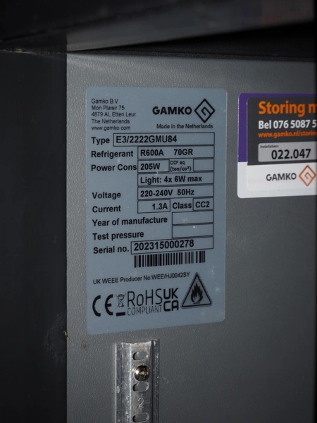 Gamko bottle cooler, type: E3/2222GMU84, serial number: 202315000278, 220-240 V, 50 Hz, 205 W, 1.3 A, refrigerant: R600A/0.070 kg, dimensions: 2540 mm x 510 mm x 870 mm.