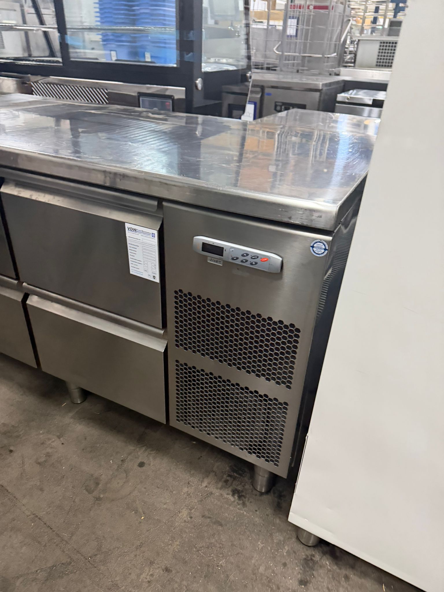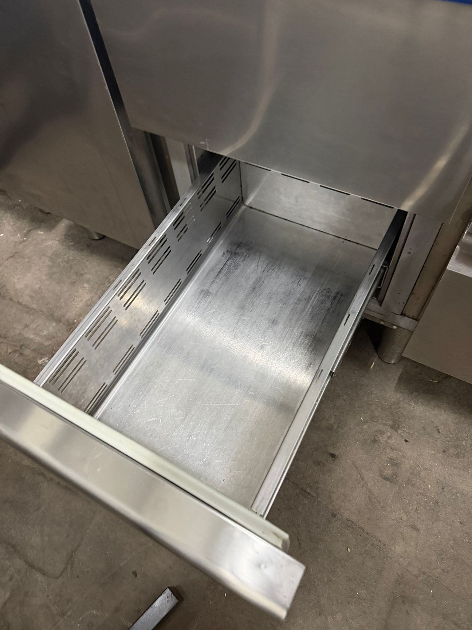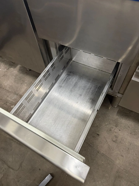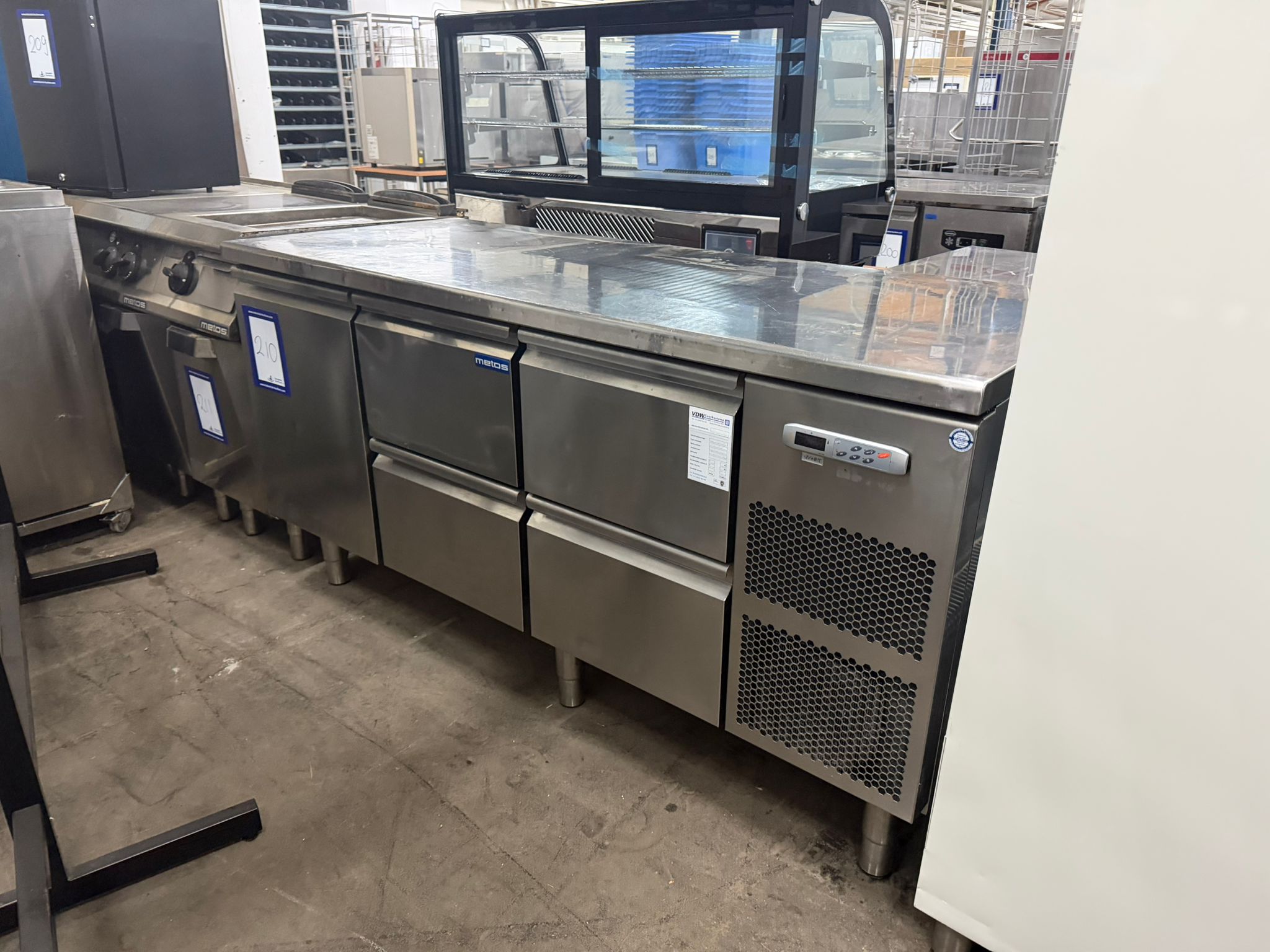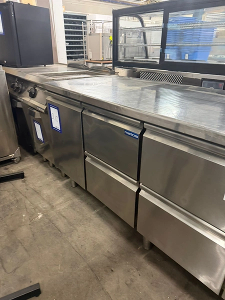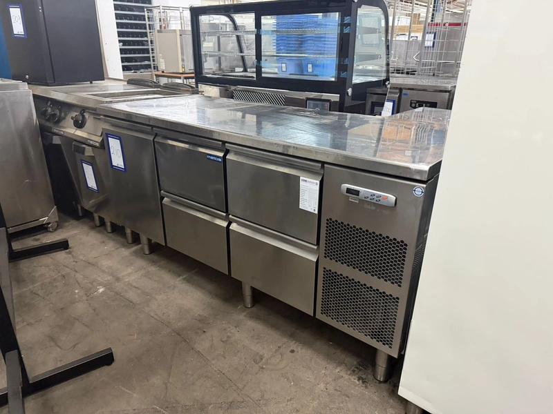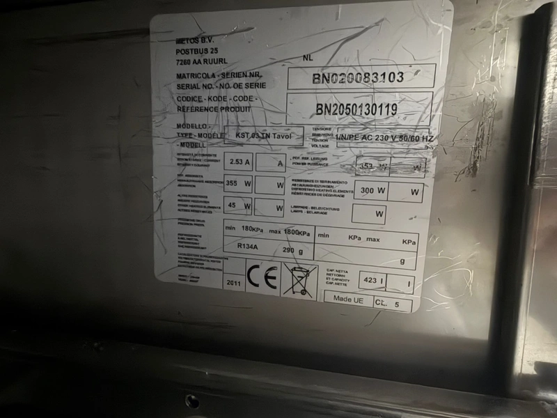 Metos refrigerated counter, type: KST 03 TN Tavol, serial number: BN020083103, 230 V, 50/60 Hz, 2.53 A, 355 W, refrigerant: R134A/0.290 kg, 4 drawers, dimensions drawers: 560 mm x 300 mm x 300 mm, 2 floors, floor dimensions: (2x) 550 mm x 330 mm, total dimensions: 1700 mm x 700 mm x 900 mm.