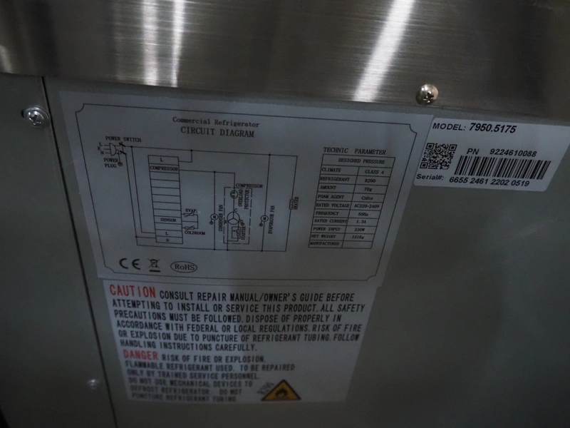 Ecofrost refrigerated workbench, model: 7950.5175, serial number: 6655 2461 2202 0519, 220-240 V, 50 Hz, 1.3 A, 230 W, refrigerant: R290/0.070 kg, weight: 121 kg, dimensions: 1800 mm x 700 mm x 900 mm.