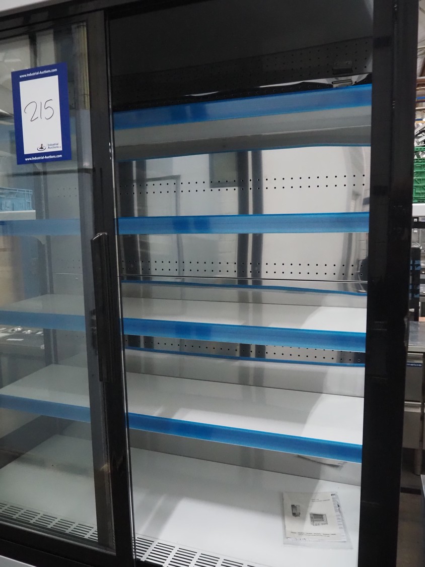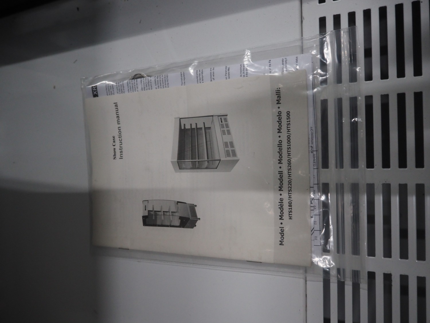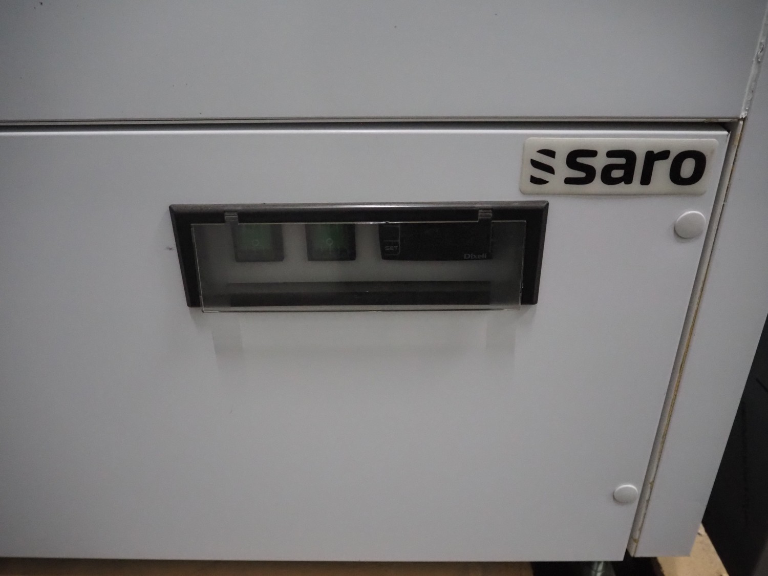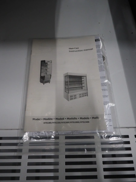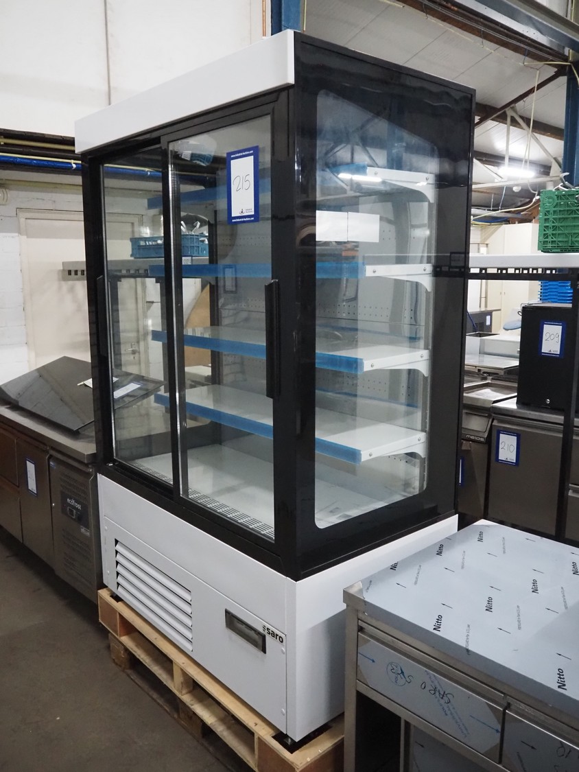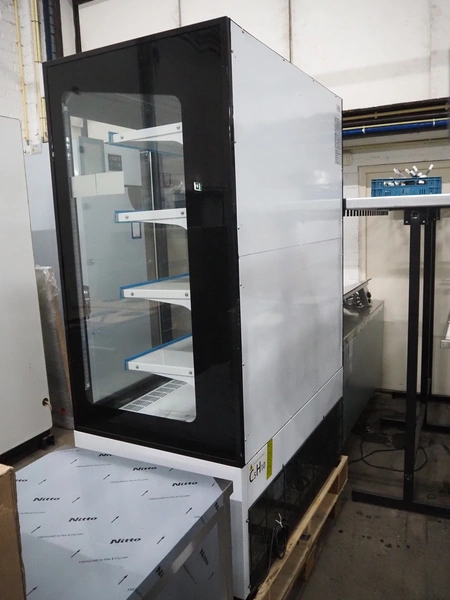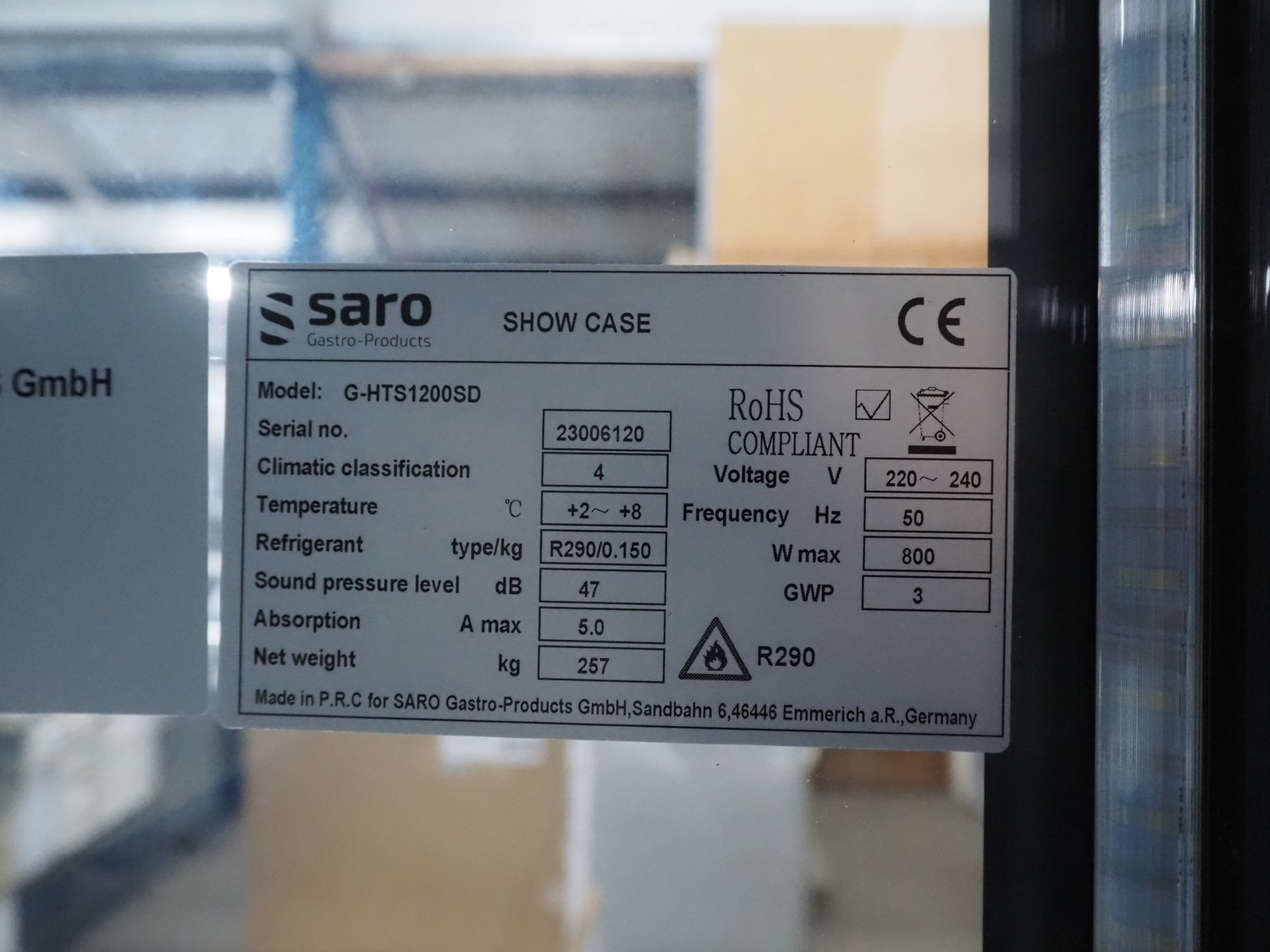 Saro Gastro-Products GmbH refrigerated showcase, model: G-HTS1200SD, serial number: 23006120, 220/240 V, 50 Hz, 5.0 A, maximum: 800 W, machine weight: 257 kg, refrigerant: R290/0.150, 4 floors, dimensions: 770 mm x 1260 mm x 1950 mm. Damaged