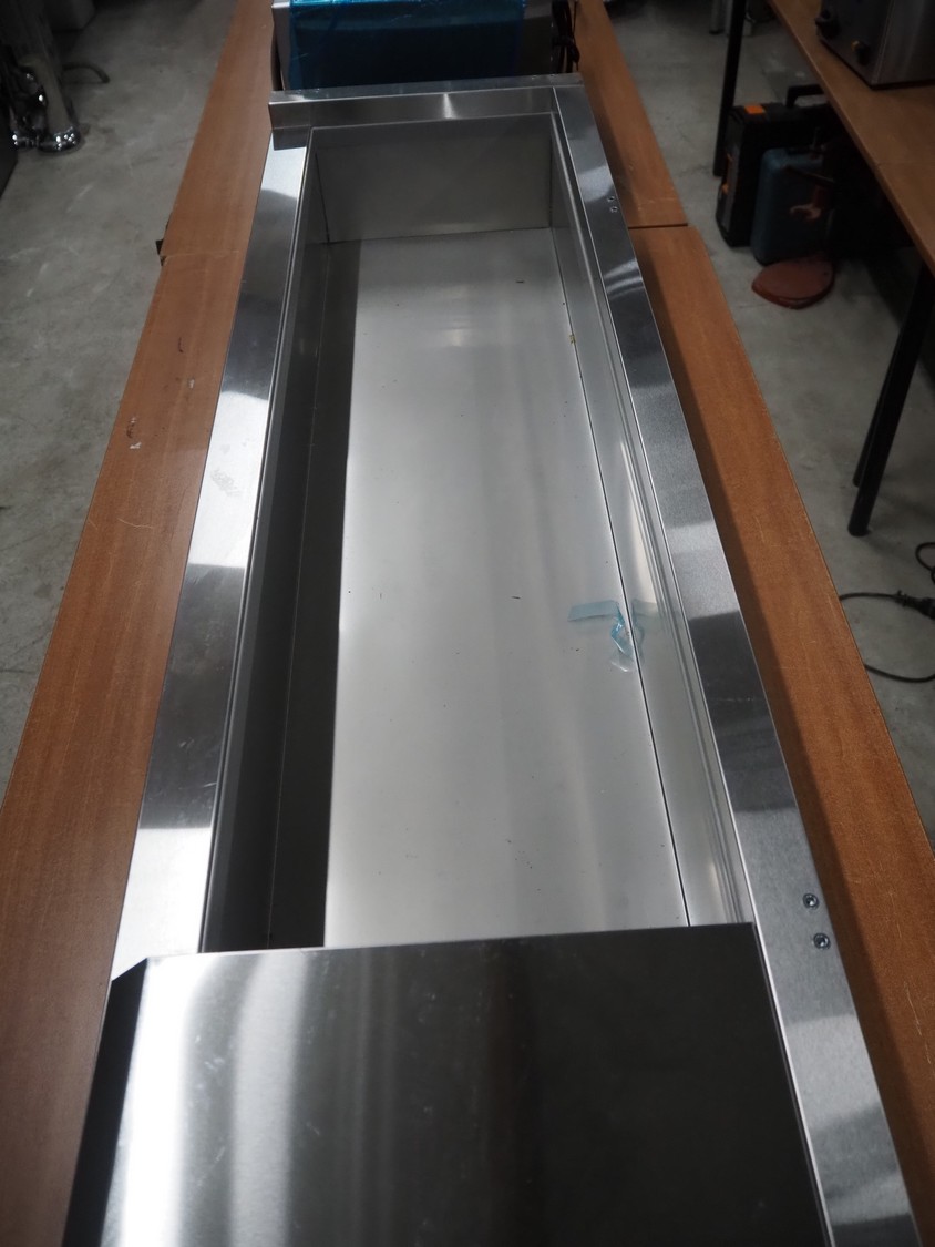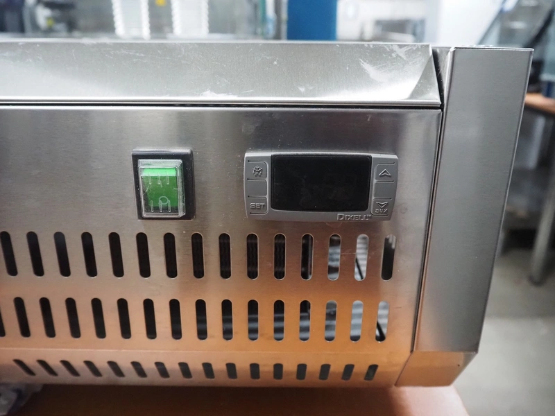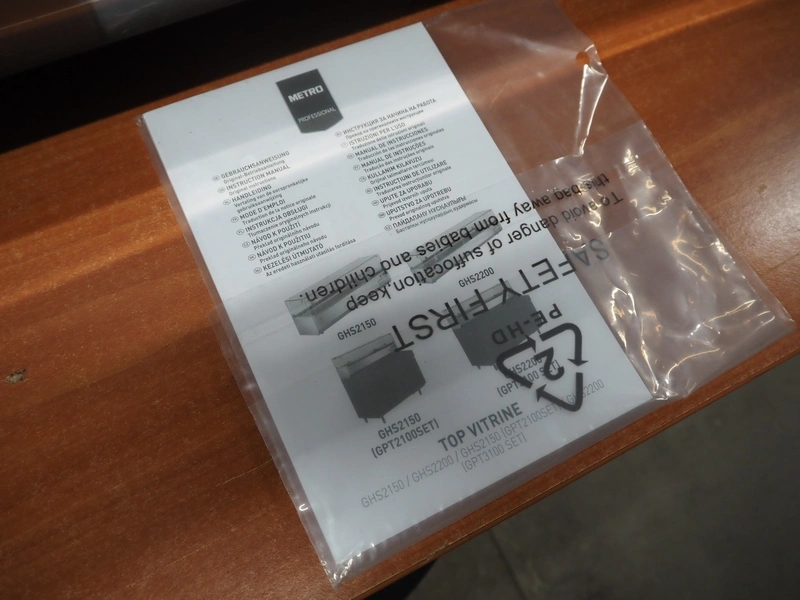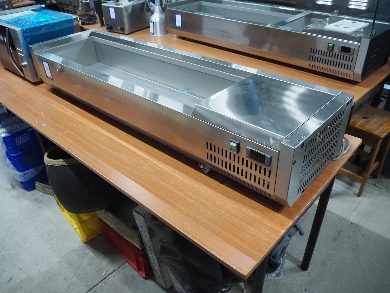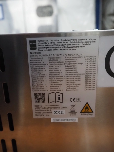 Metro refrigerated showcase, model: GHS2150, 220-240 V, 50 Hz, 2 A, 135 W, refrigerant: R290/0.050 kg, inside dimensions: 1100 mm x 300 mm x 140 mm, total dimensions: 1500 mm x 400 mm x 260 mm.
