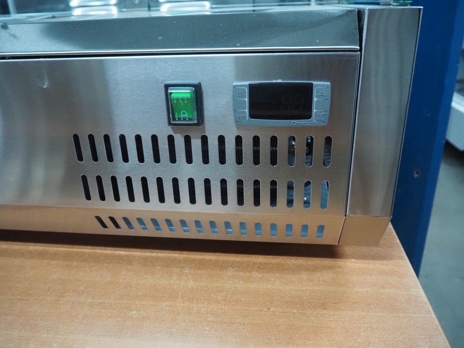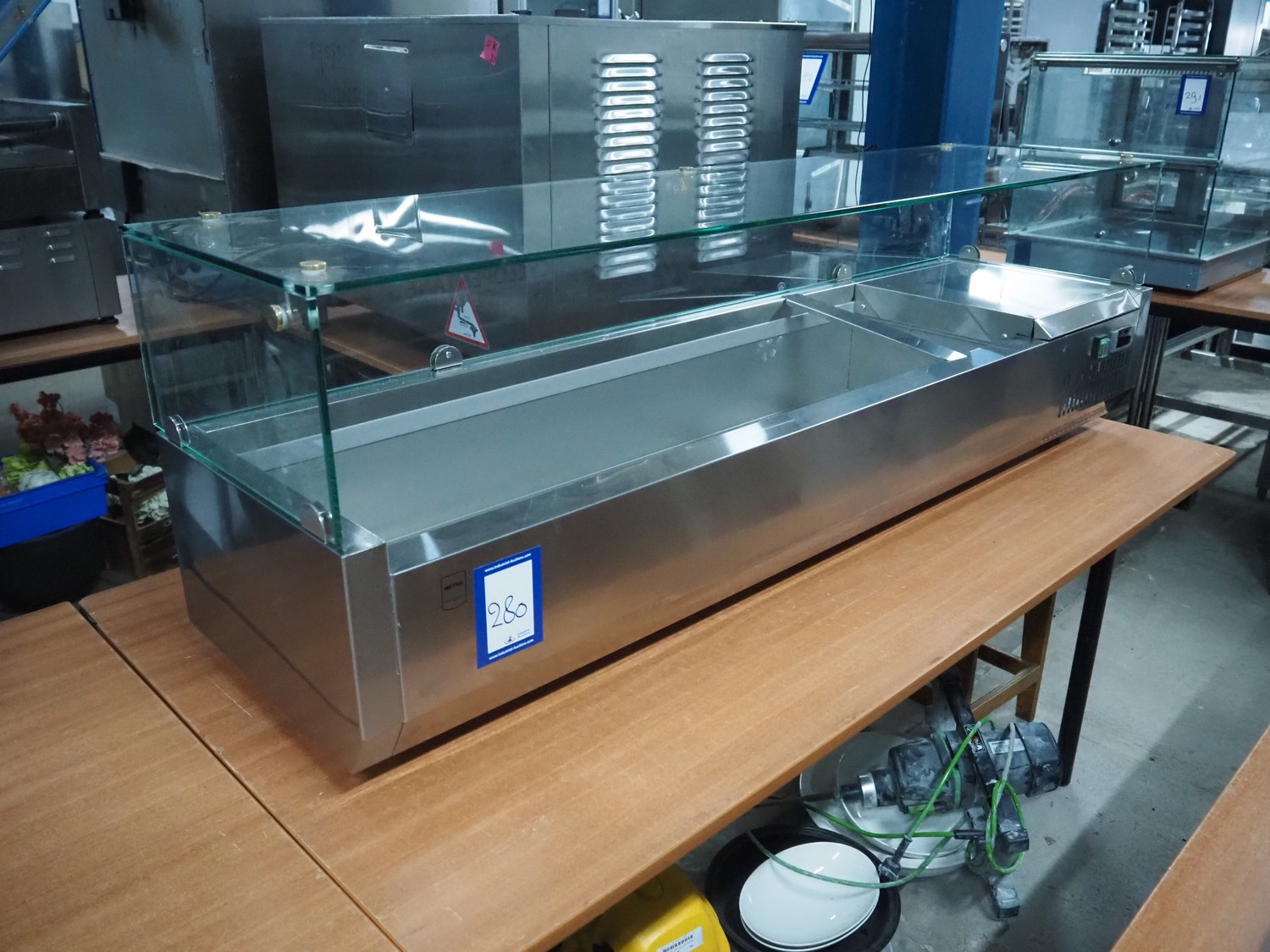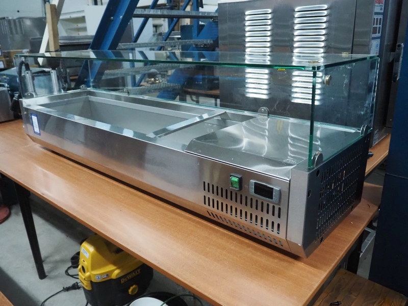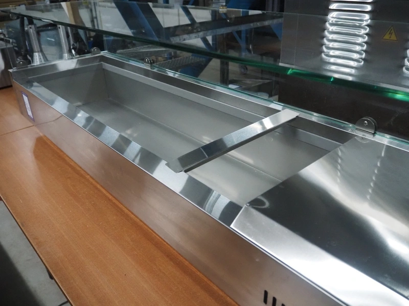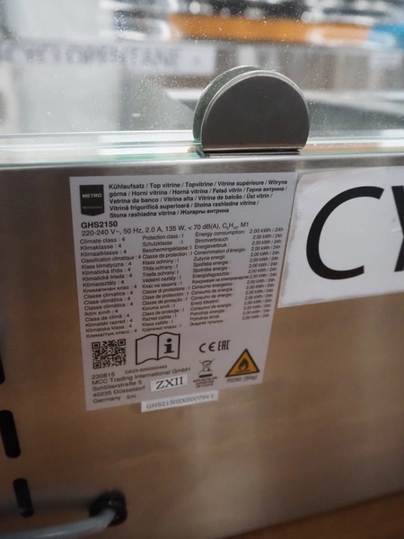 Metro refrigerated showcase, model: GHS2150, 220-240 V, 50 Hz, 2 A, 135 W, inside dimensions: 1100 mm x 300 mm x 190 mm, total dimensions: 1500 mm x 400 mm x 470 mm.