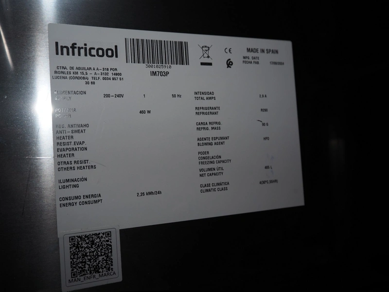 Infricool refrigerated workbench, 200-240 V, 1 Ph, 50 Hz, 2.9 A, 460 W, refrigerant: R290/0.90 kg, dimensions: 1960 mm x 700 mm x 800 mm.