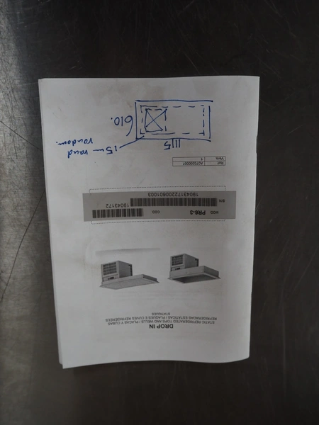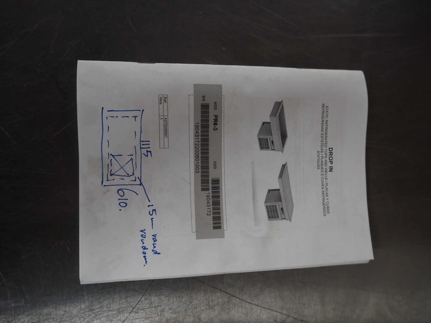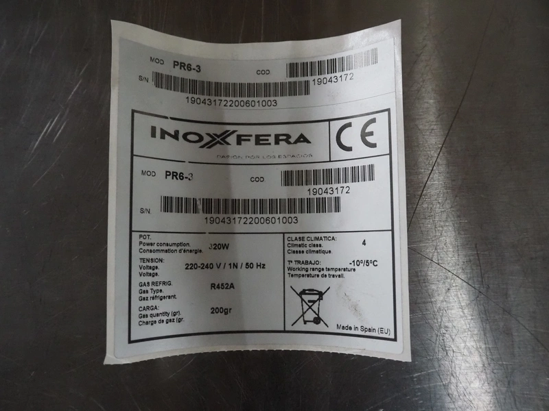 Inoxfera static refrigerated top, model: PR6-3, serial number: 19043172200601003, 220-240 V, 1 Ph, 50 Hz, 320 W, refrigerant: R452A/0.200 kg, dimensions: 1120 mm x 610 mm x 470 mm.