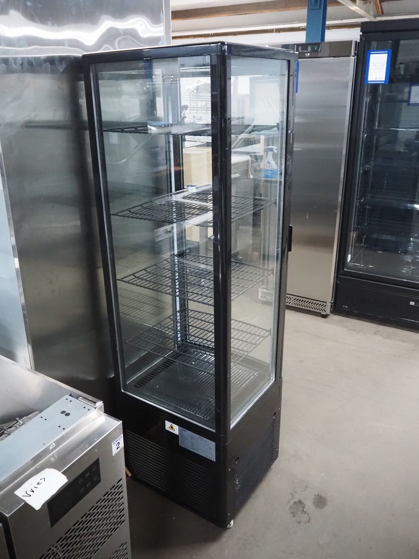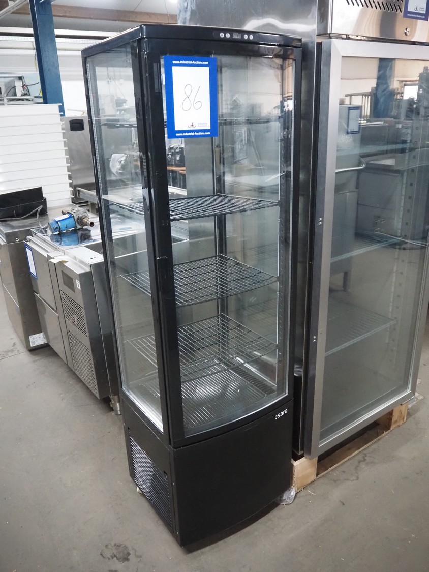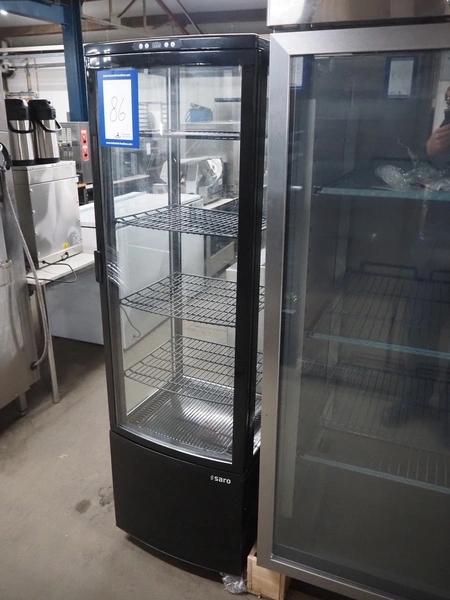 Saro Gastro-Products GmbH refrigerated showcase, model: SVEN, serial number: 1570608200024, year of construction: 20.08.2024, 220-240 V, 50 Hz, 2.3 A, 380 W, volume: 235 liter, refrigerant: R290/90 g, 4 floors, floor dimensions: (4x) 420 mm x 380 mm, total dimensions: 460 mm x 520 mm x 1700 mm.
