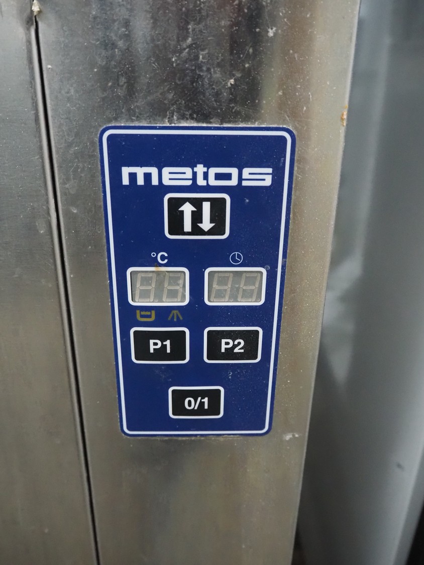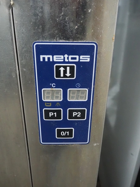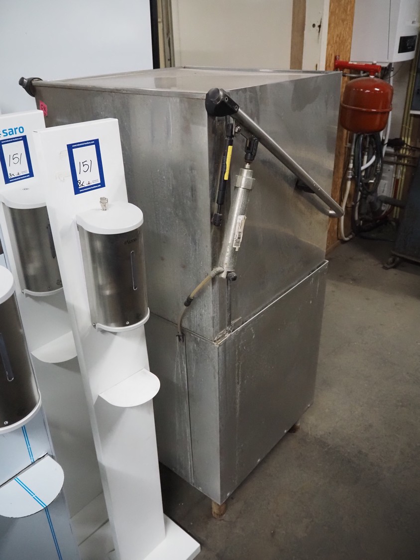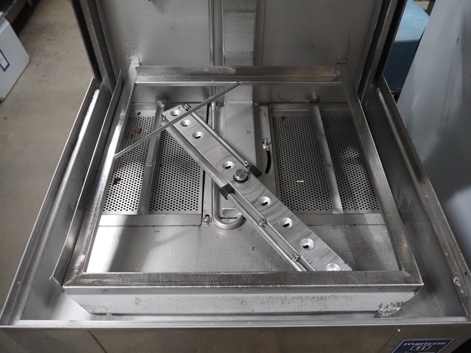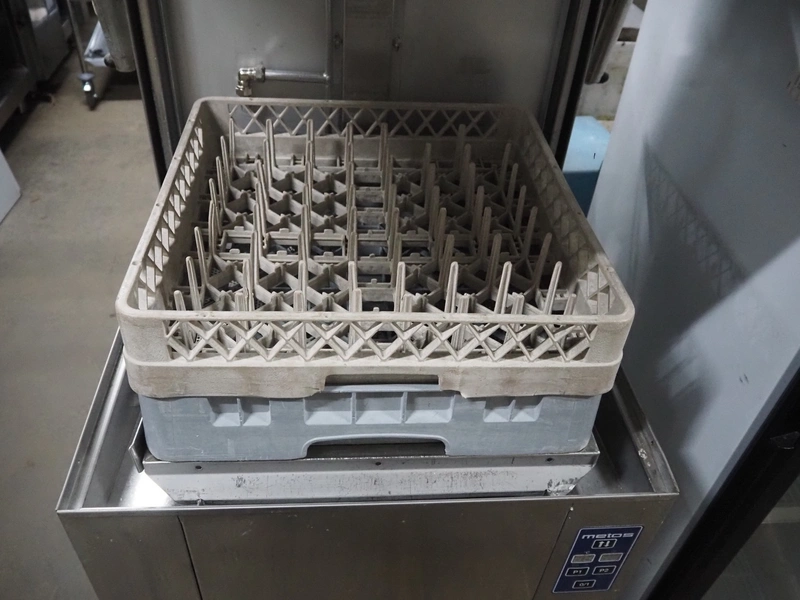 Metos dishwasher, type: WD-7 EH, number: 95520, year of construction: 1995, 400 V, 3 Ph, 50 Hz, 25 A, 13.1 kW, dimensions: 720 mm x 720 mm x 1470 mm. Including 2 plastic baskets.