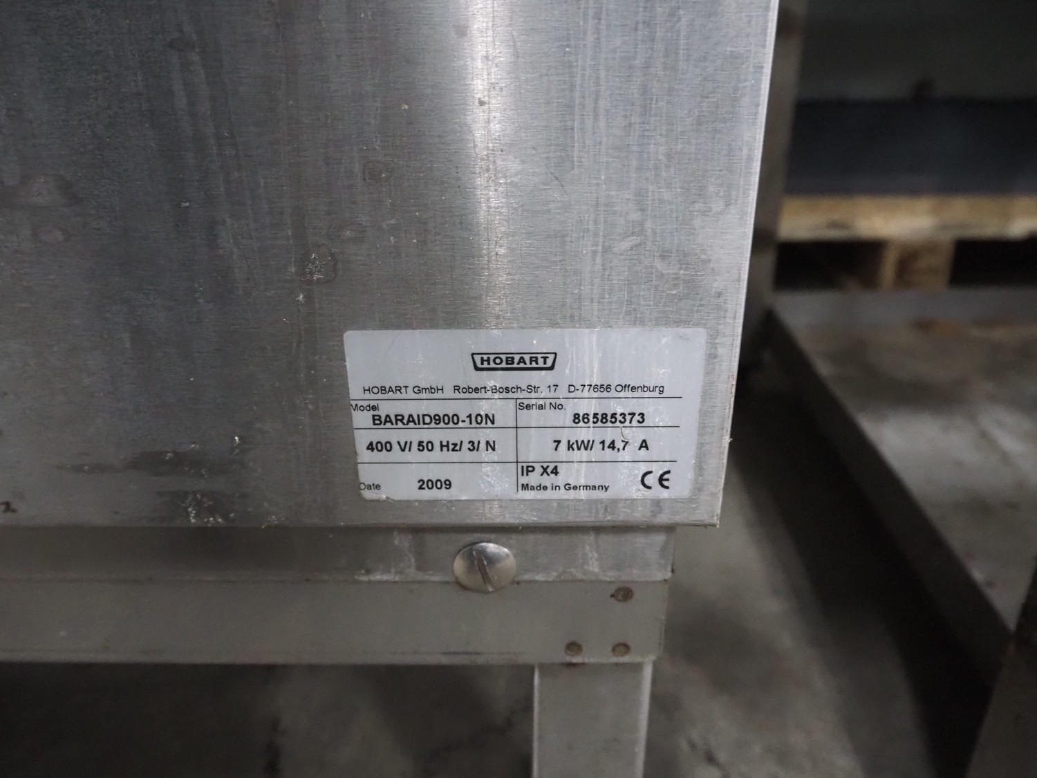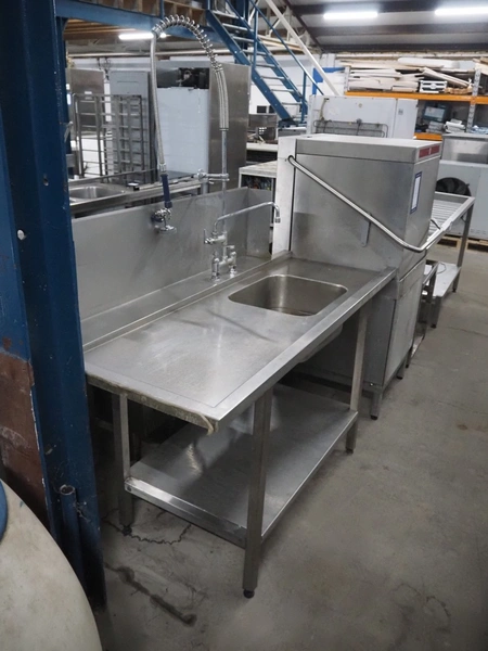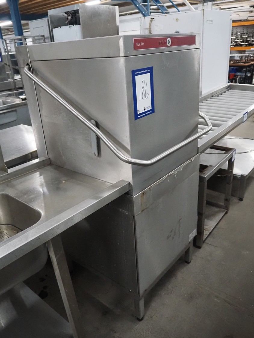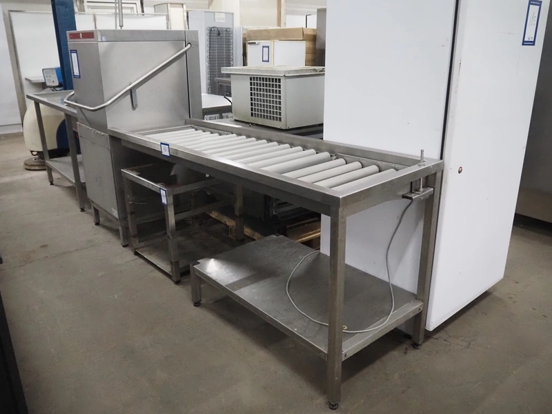 Hobart dishwasher with sink and roller conveyor, model dishwasher: BARAID900-10N, serial number: 86585373, year of construction: 2009, 400 V, 3 Ph, 50 Hz, 14.7 A, 7 kW, dimensions: 800 mm x 750 mm x 1500 mm, dimensions roller conveyor: 2050 mm x 630 mm x 900 mm, dimensions sink: 1700 mm x 740 mm x 1980 mm.