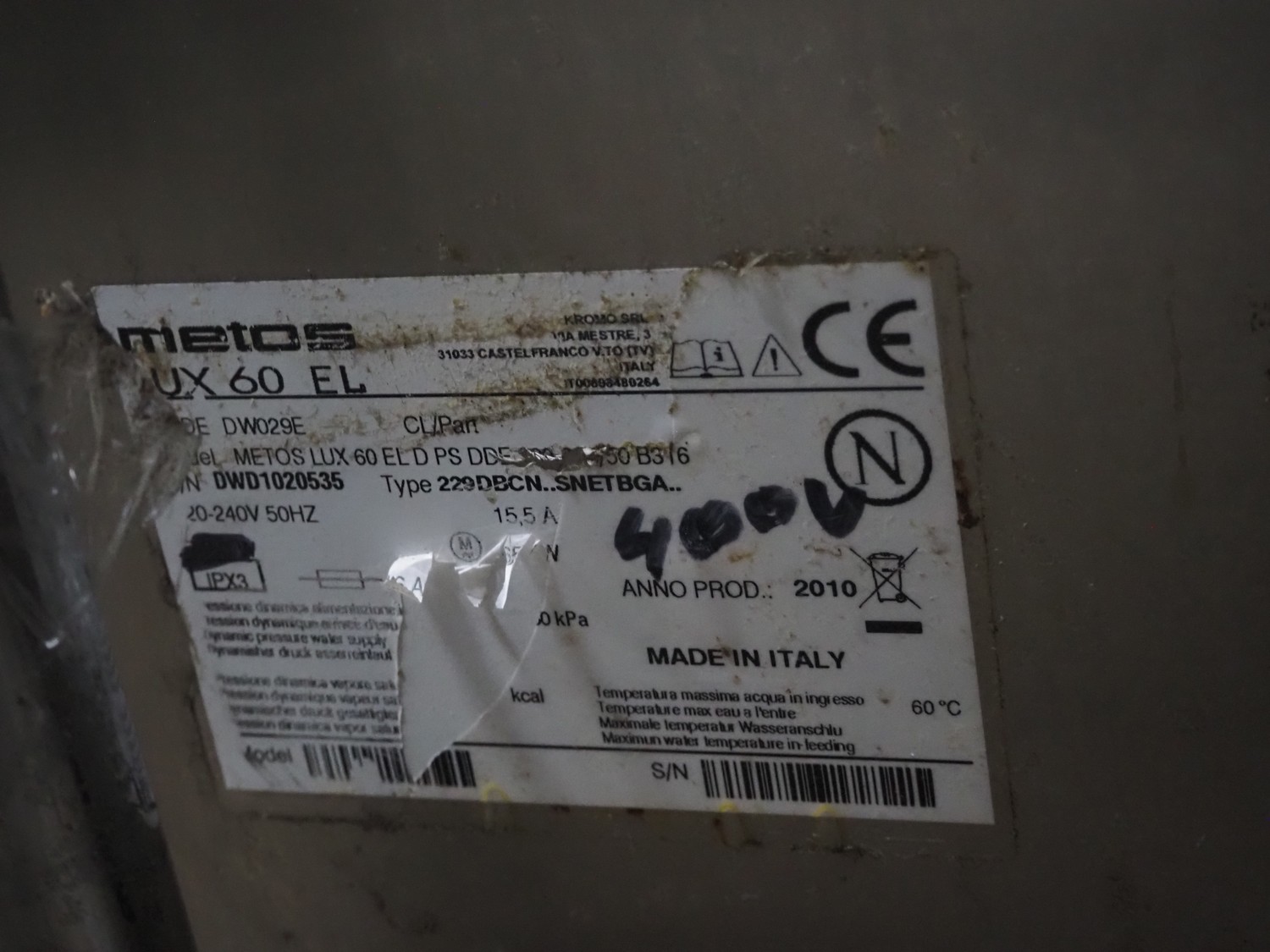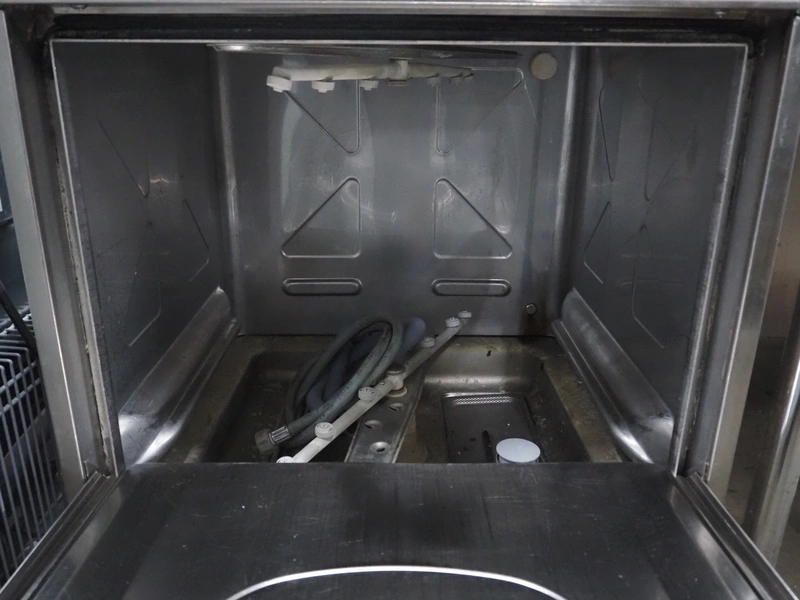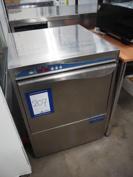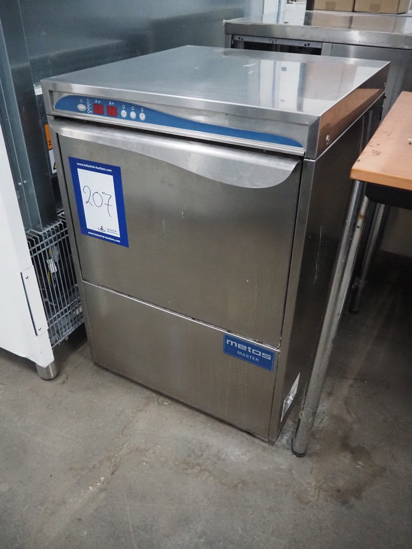 Metos dishwasher, model: METOS LUX 60 EL D PS DDE, serial number: DWD1020535, year of construction: 2010, 220-240 V, 50 Hz, 15.5 A, inside dimensions: 500 mm x 500 mm, total dimensions: 600 mm x 650 mm x 840 mm.
