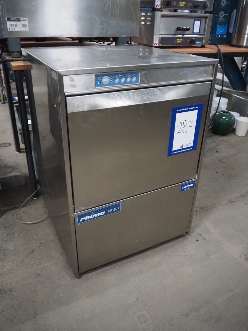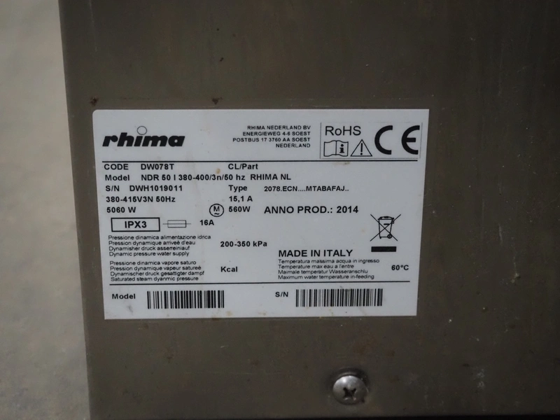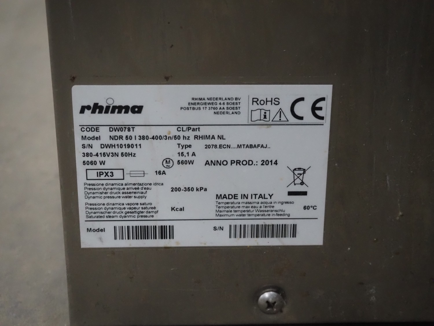 Rhima dishwasher, model: NDR 50, serial number: DWH1019011, year of construction: 2014, 380-400 V, 3 Ph, 50 Hz, 15.1 A, 560 W, inside dimensions: 500 mm x 500 mm, total dimensions: 590 mm x 600 mm x 840 mm.