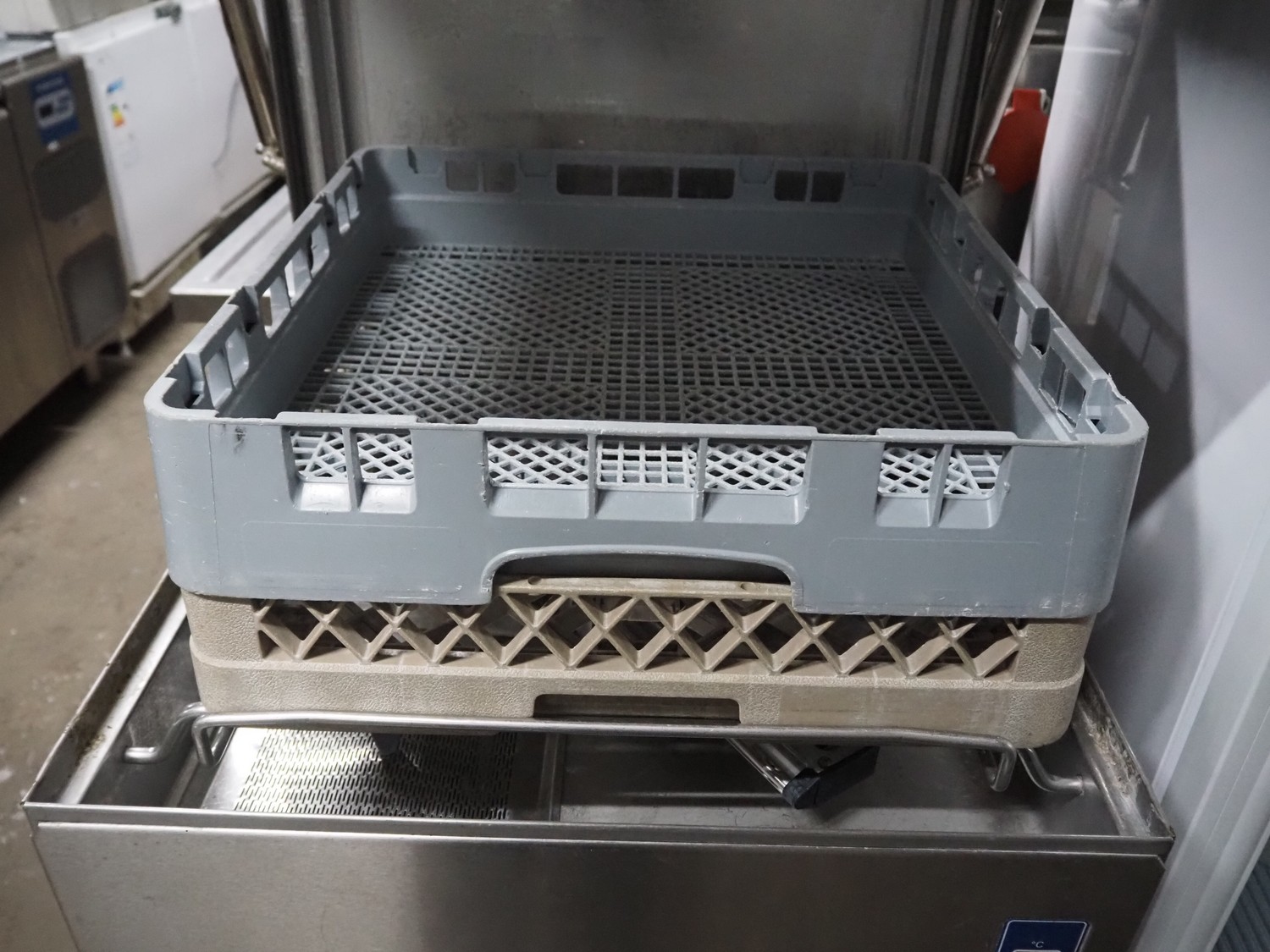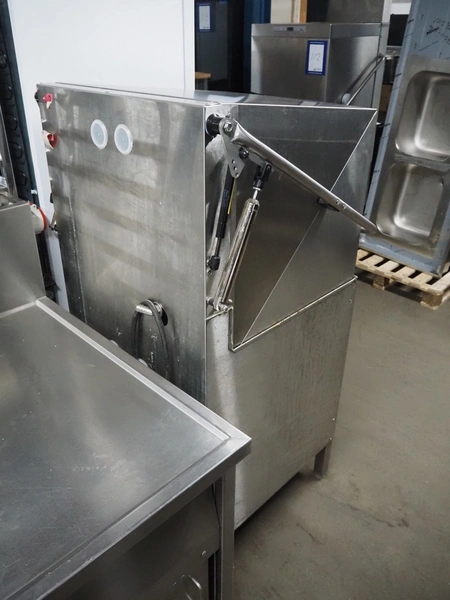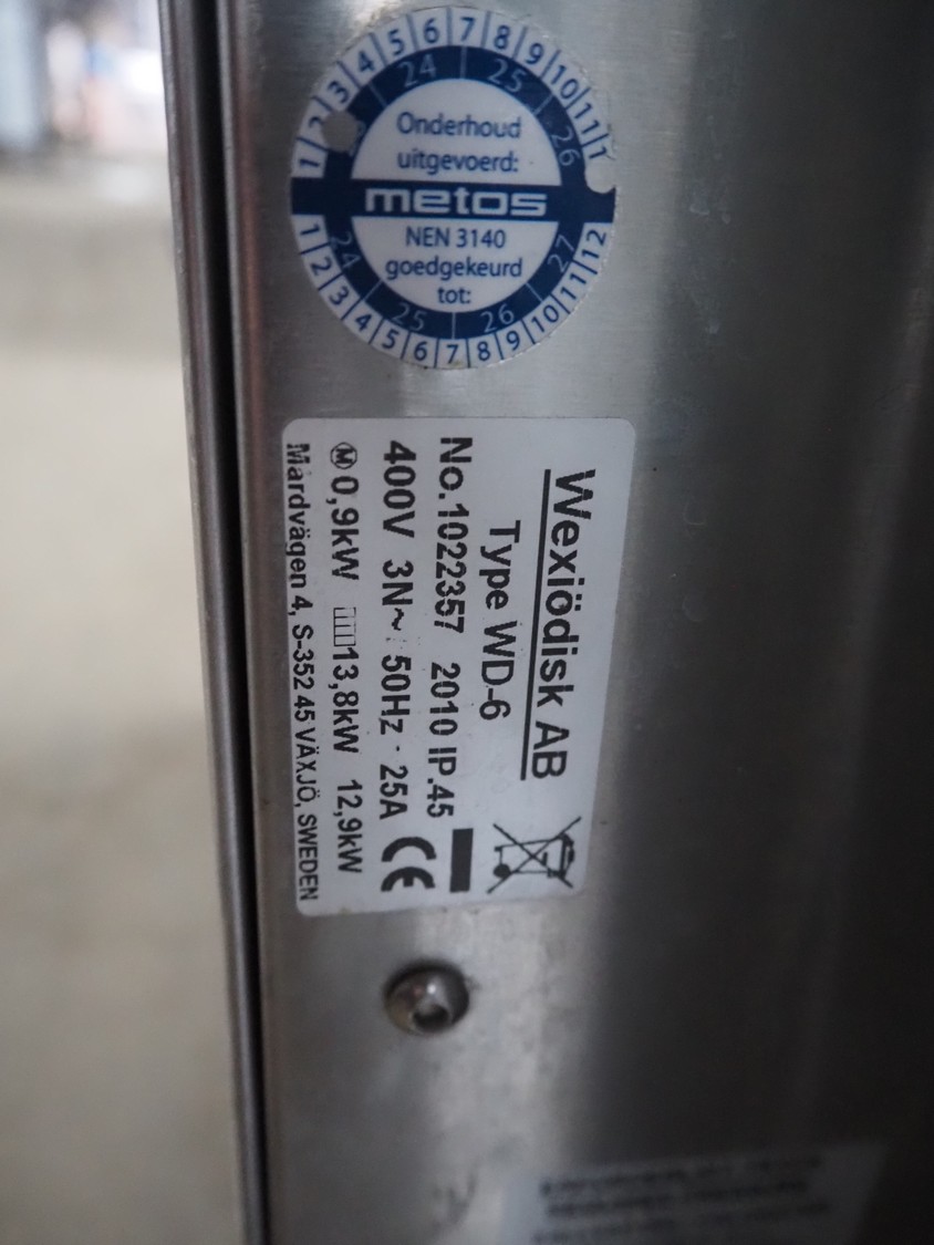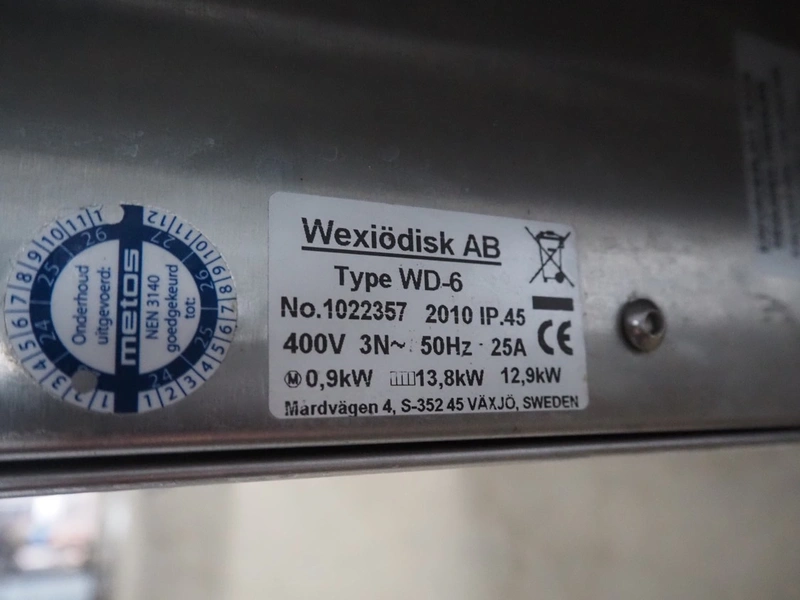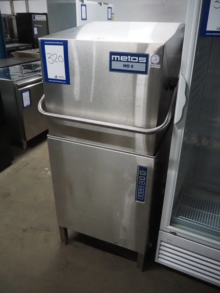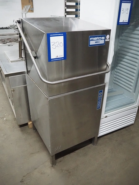 Metos dishwasher, type: WD-6, number: 1022357, year of construction: 2010, 400 V, 3 Ph, 50 Hz, 25 A, 13.8 kW, inside dimensions: 500 mm x 500 mm, total dimensions: 600 mm x 660 mm x 1420 mm.