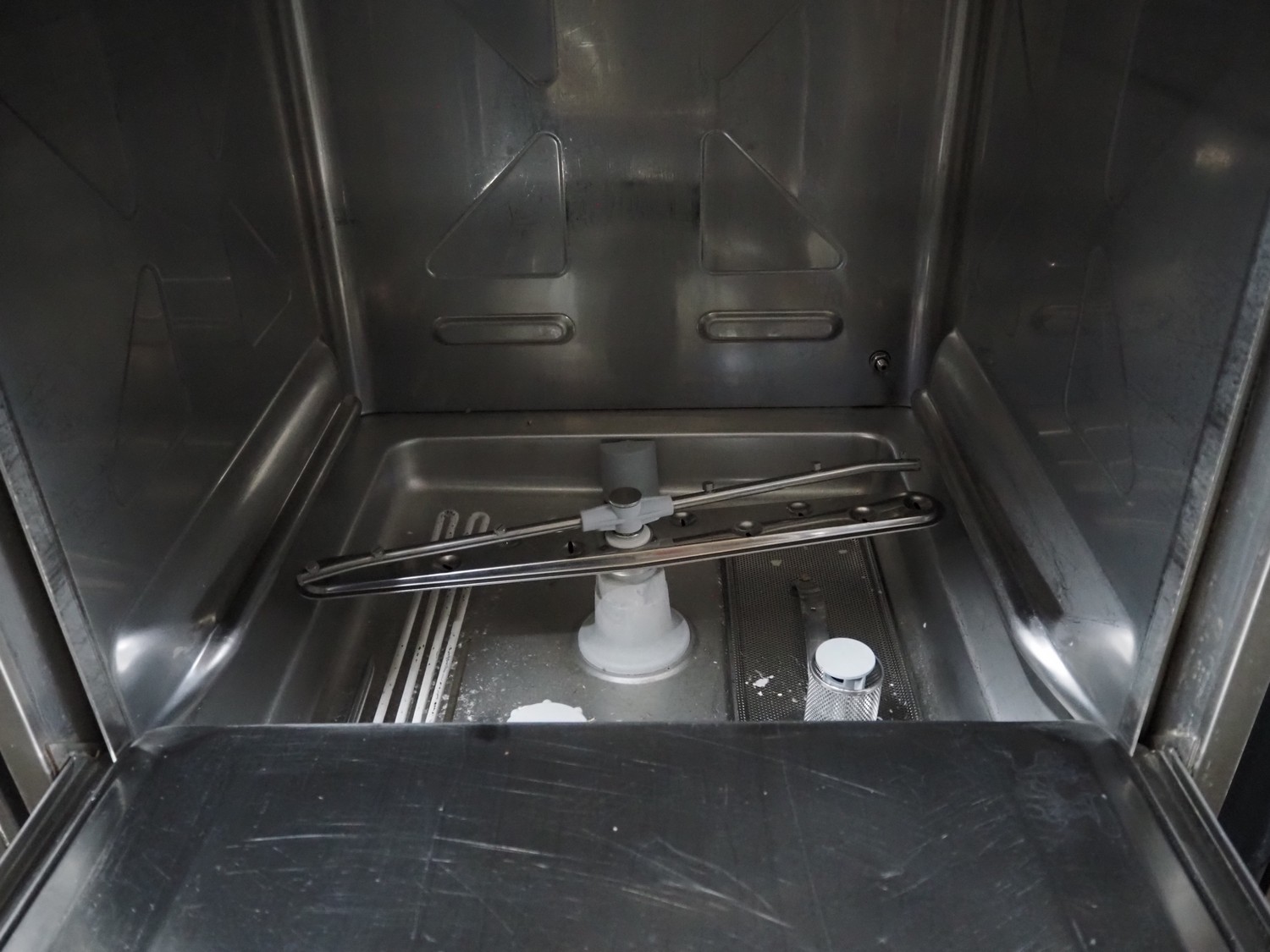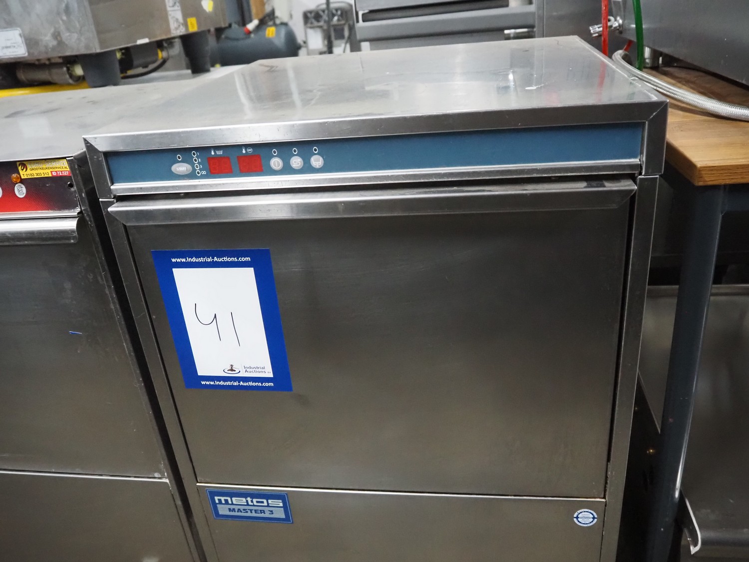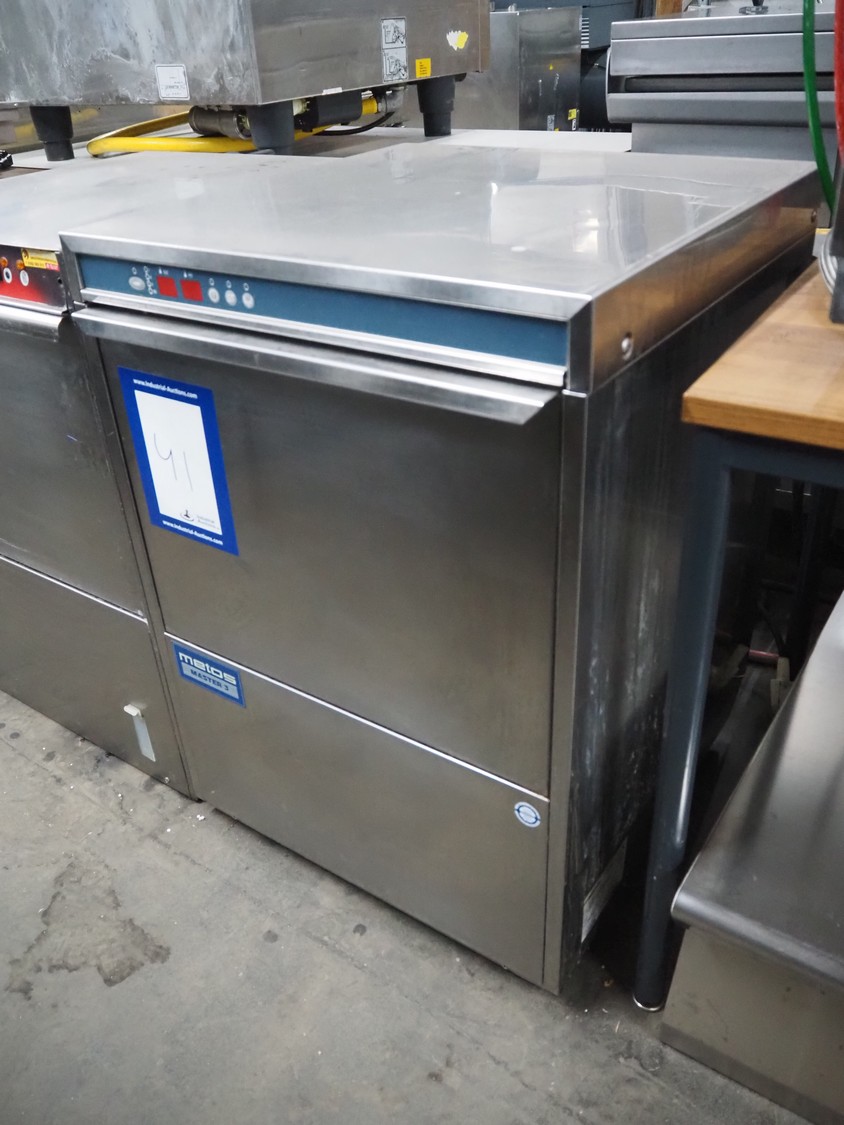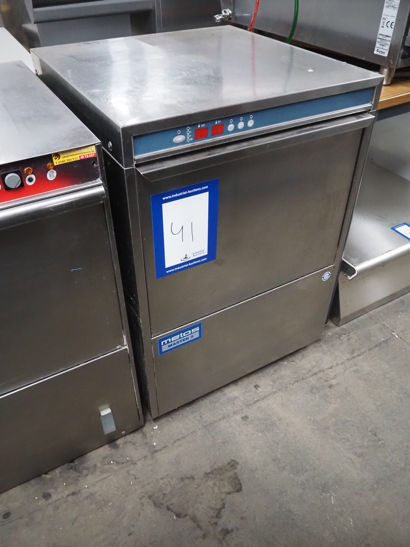 Metos dishwasher, model: MM3 EL D XP DDE DVGW, serial number: DWA1021647, year of construction: 2007, 400 V, 3 Ph, 50 Hz, 9.5 A, 560 W, clearance: 500 mm x 500 mm, total dimensions: 640 mm x 600 mm x 850 mm.