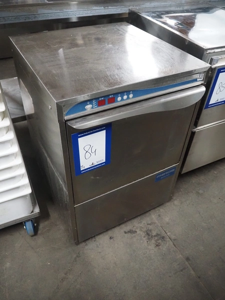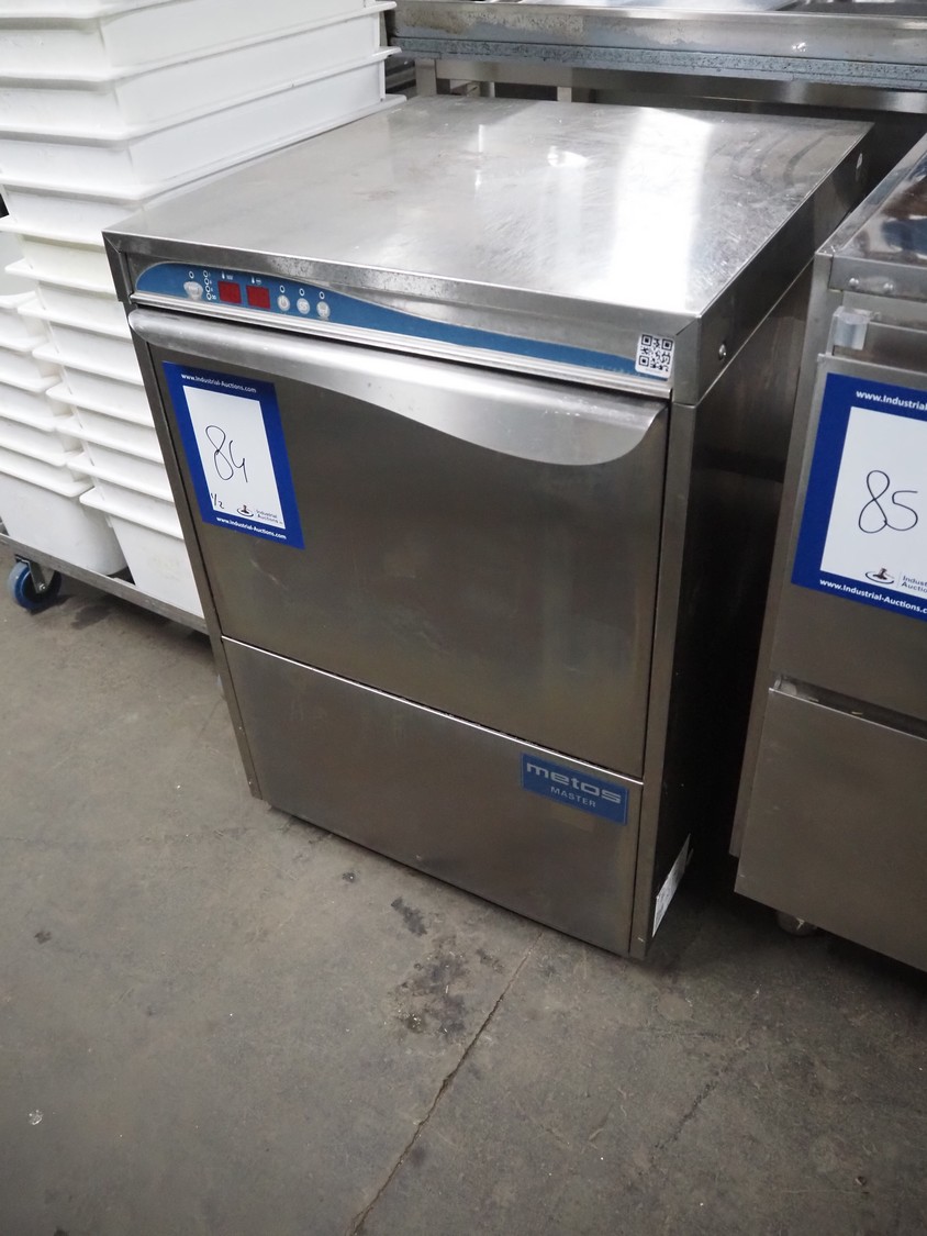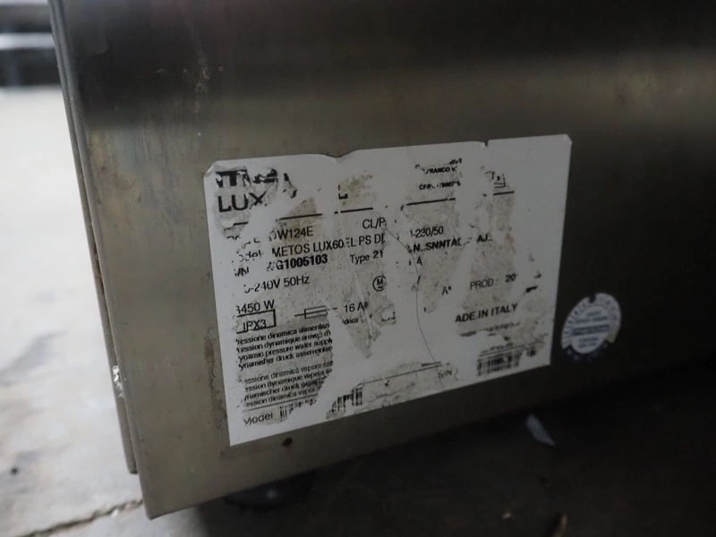 Metos dishwasher, model: METOS LUX60EL, 240 V, 50 Hz, 16 A, 8450 W, dimensions: 640 mm x 600 mm x 850 mm.