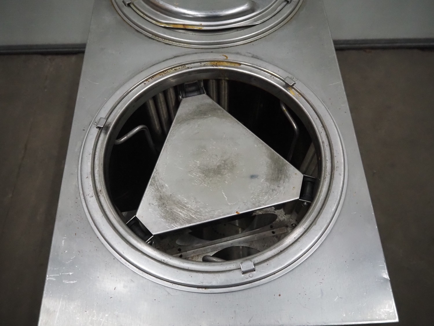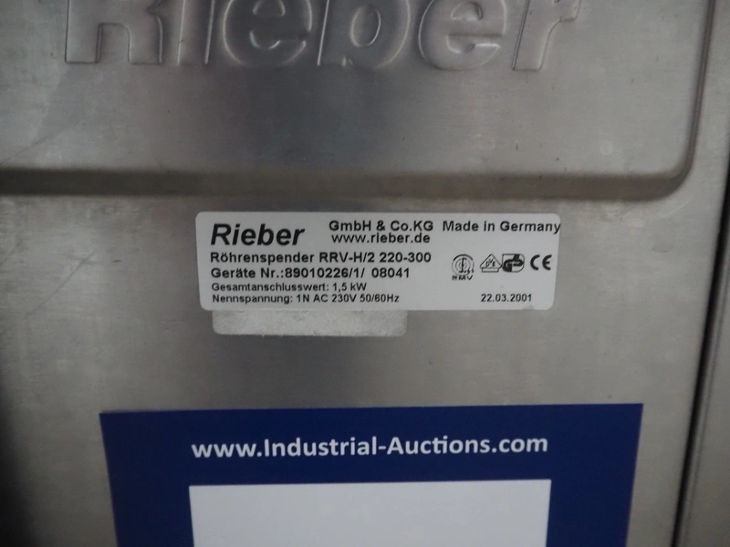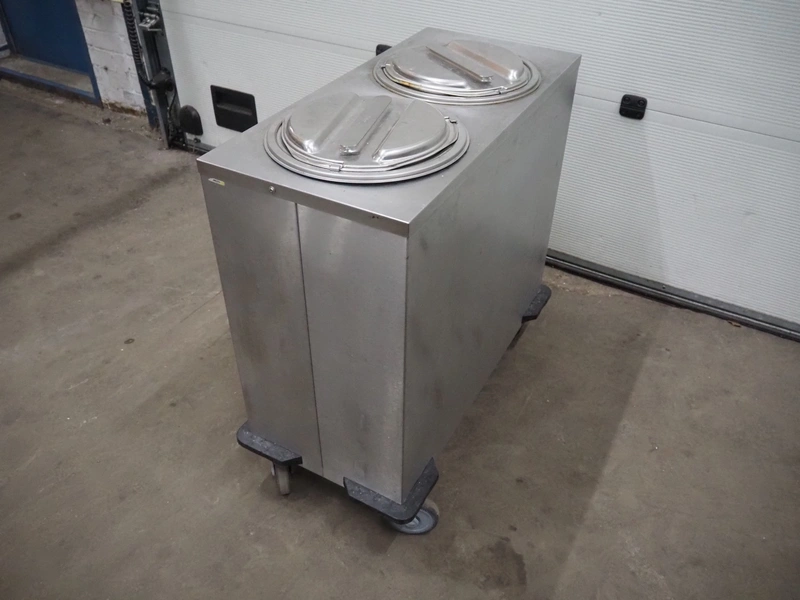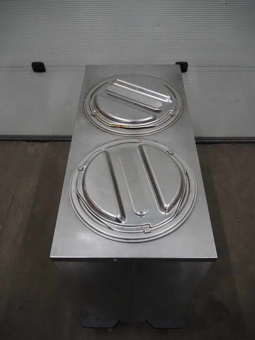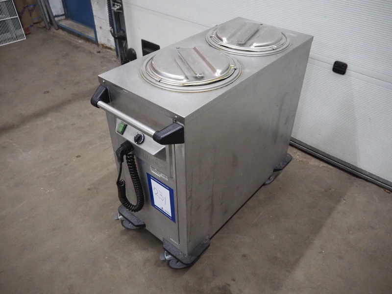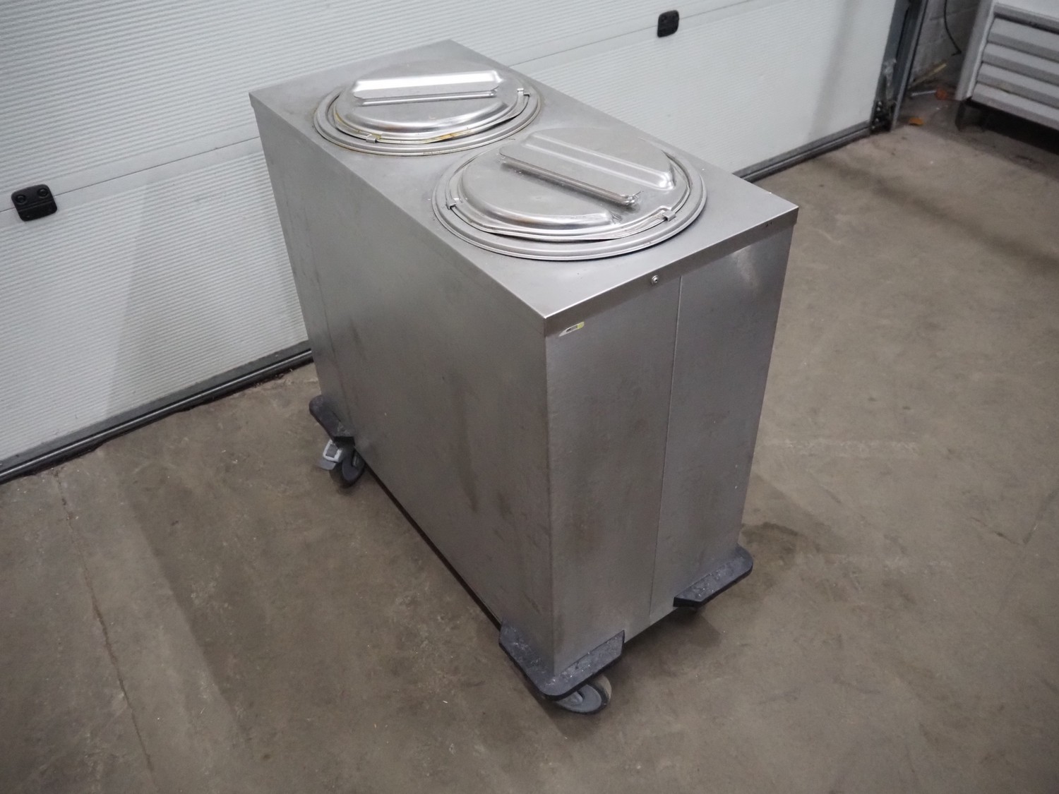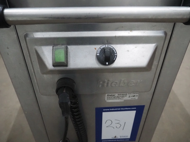 Rieber mobile plate warmer, model: RRV-H/2 220-300, number: 89010226/1/08041, year of construction: 22.03.2001, 230 V, 1 Ph, 50/60 Hz, 2 storages, diameter storage: (2x) 300 mm, total dimensions: 980 mm x 480 mm x 930 mm.