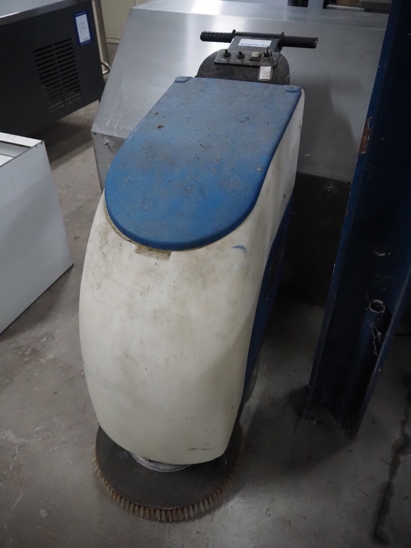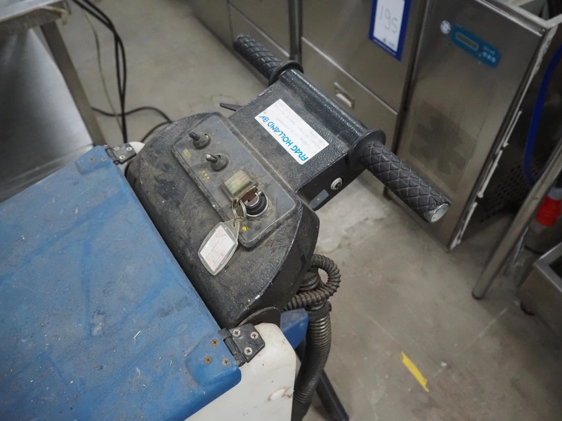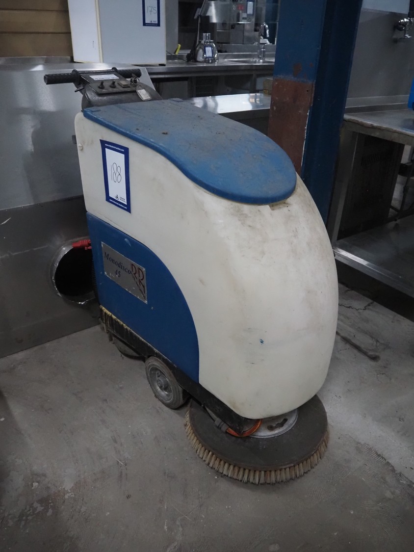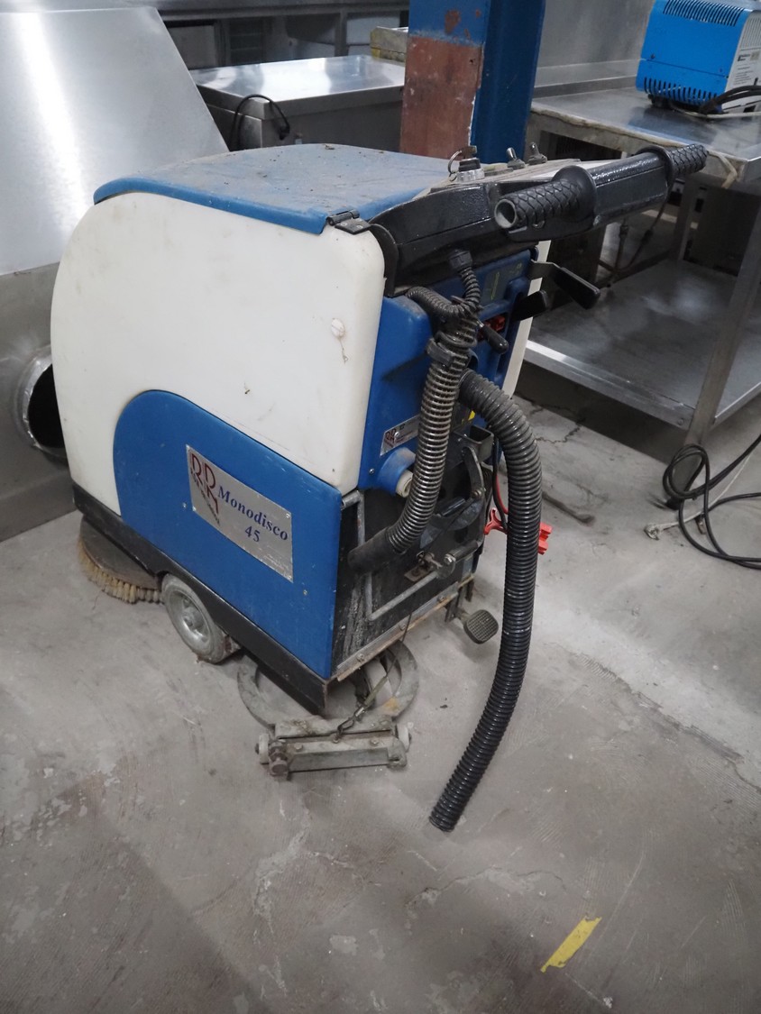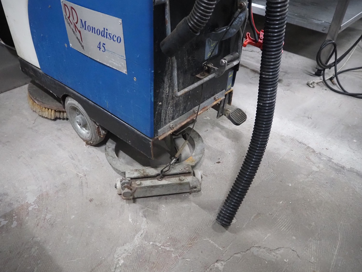 Monodisco floor scrubbing machine, diameter brush: Ø 400 mm, total dimensions: 1100 mm x 400 mm x 1050 mm. Including charger, type: E 24/17, serial number: 36316/0/0009/02/5, 230 V, 1 Ph, 50 Hz, 3.6 A. Missing the sweeping brush and technical condition unknown.