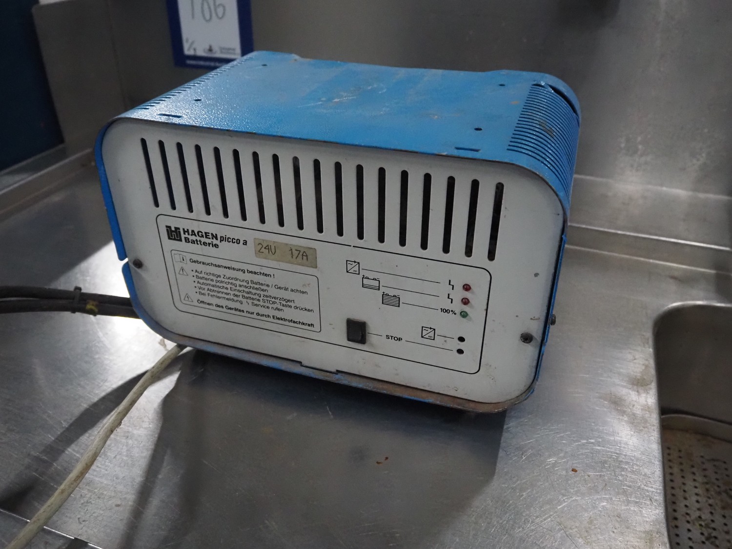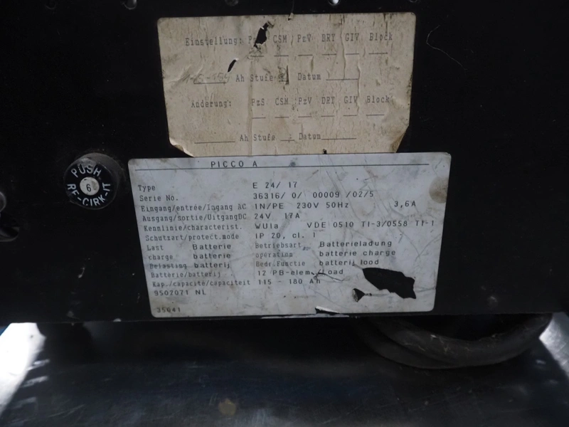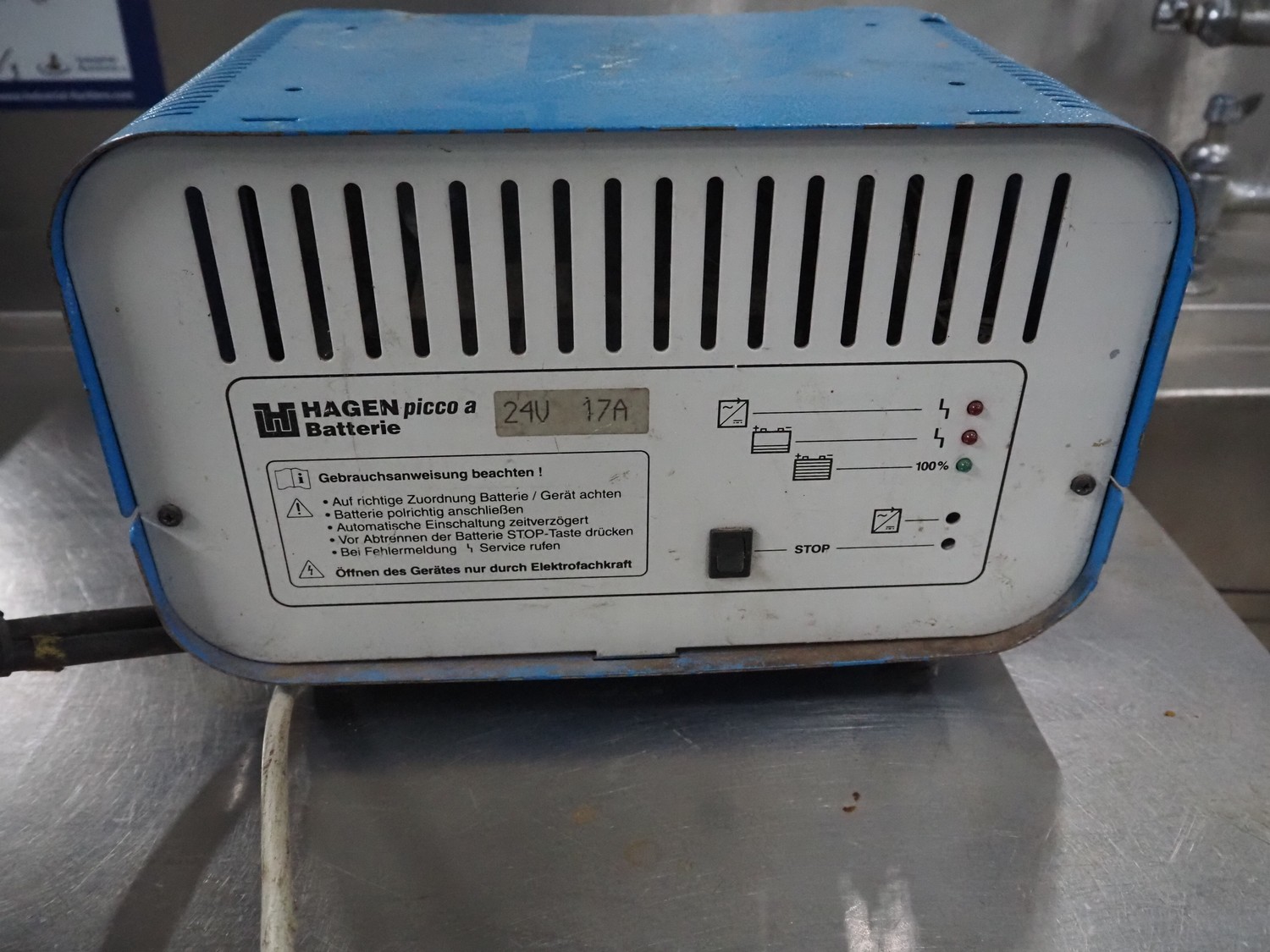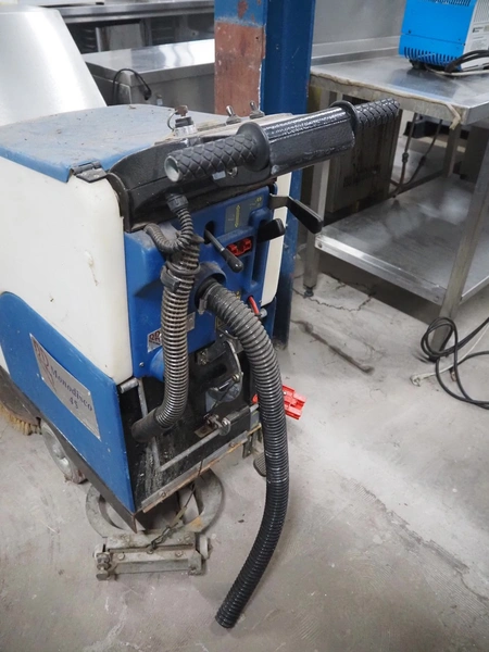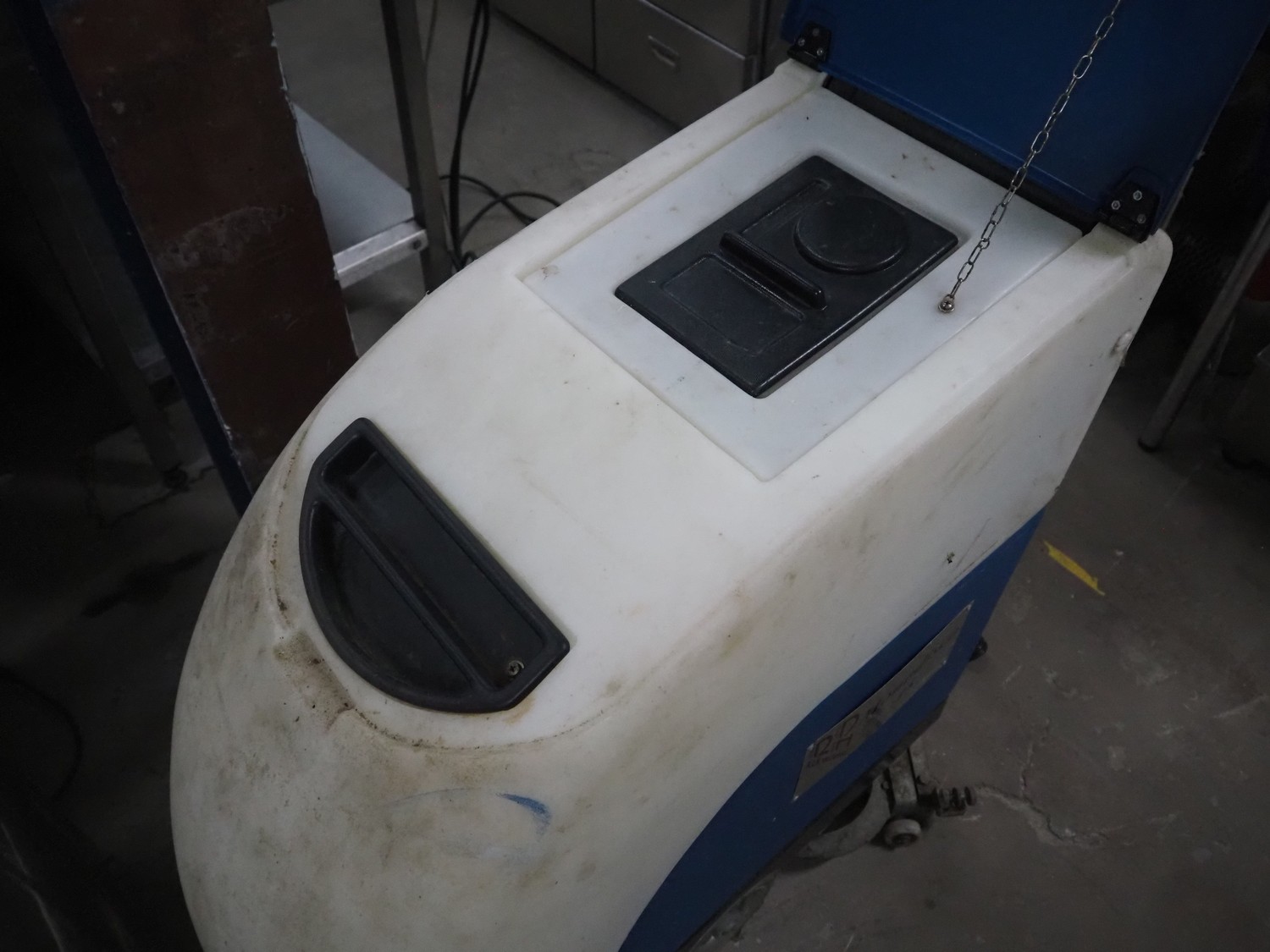 Monodisco floor scrubbing machine, diameter brush: Ø 400 mm, total dimensions: 1100 mm x 400 mm x 1050 mm. Including charger, type: E 24/17, serial number: 36316/0/0009/02/5, 230 V, 1 Ph, 50 Hz, 3.6 A. Missing the sweeping brush and technical condition unknown.