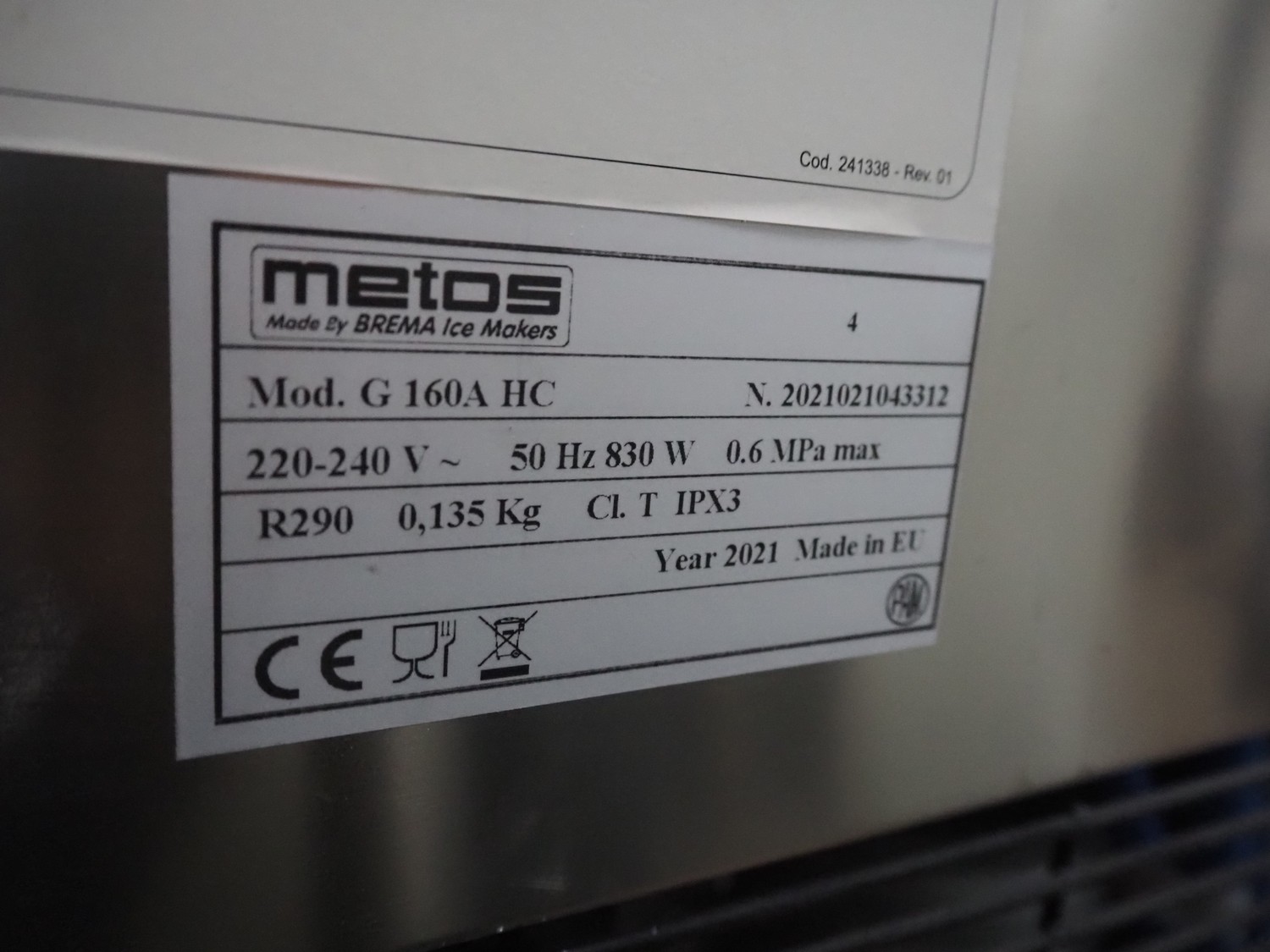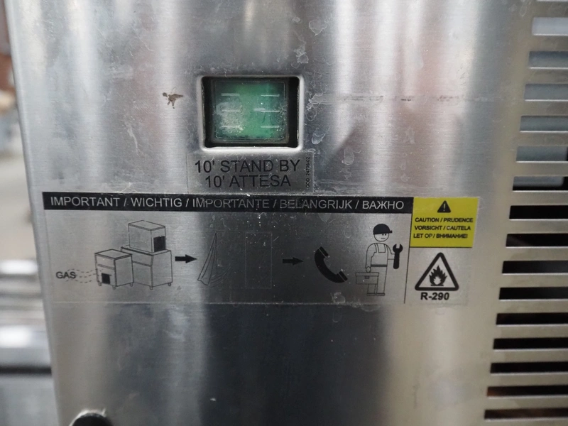 Metos/Brema crushed ice machine, model: G 160A HC, number: 2021021043312, year of construction: 2021, 220-240 V, 50 Hz, 830 W, refrigerant: R290/0.135 kg, inside dimensions: 410 mm x 710 mm x 920 mm, total dimensions: 560 mm x 820 mm x 1720 mm.