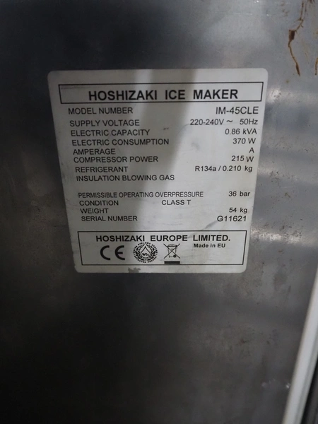 Hoshizaki ice cube machine, model: IM-45CLE, serial number: G11621, 220-240 V, 50 Hz, 370 W, refrigerant: R134A/0.210 kg, weight: 54 kg, inside dimensions: 560 mm x 400 mm x 340 mm, total dimensions: 630 mm x 500 mm x 700 mm.