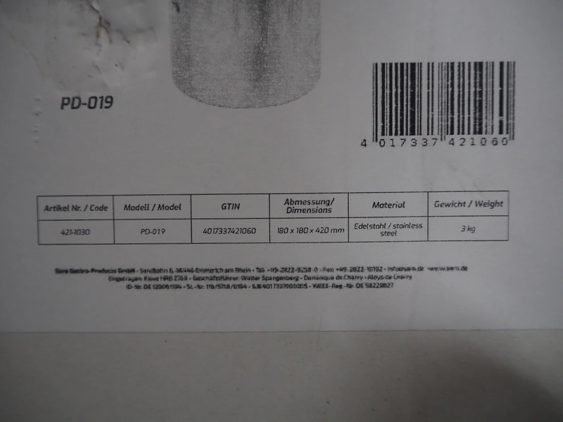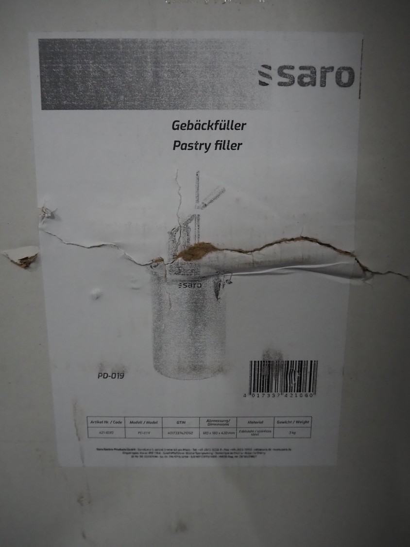Saro Gastro-Products GmbH pastry filler, model: PD-019, weight: 3 kg, dimensions: 180 mm x 180 mm x 420 mm.