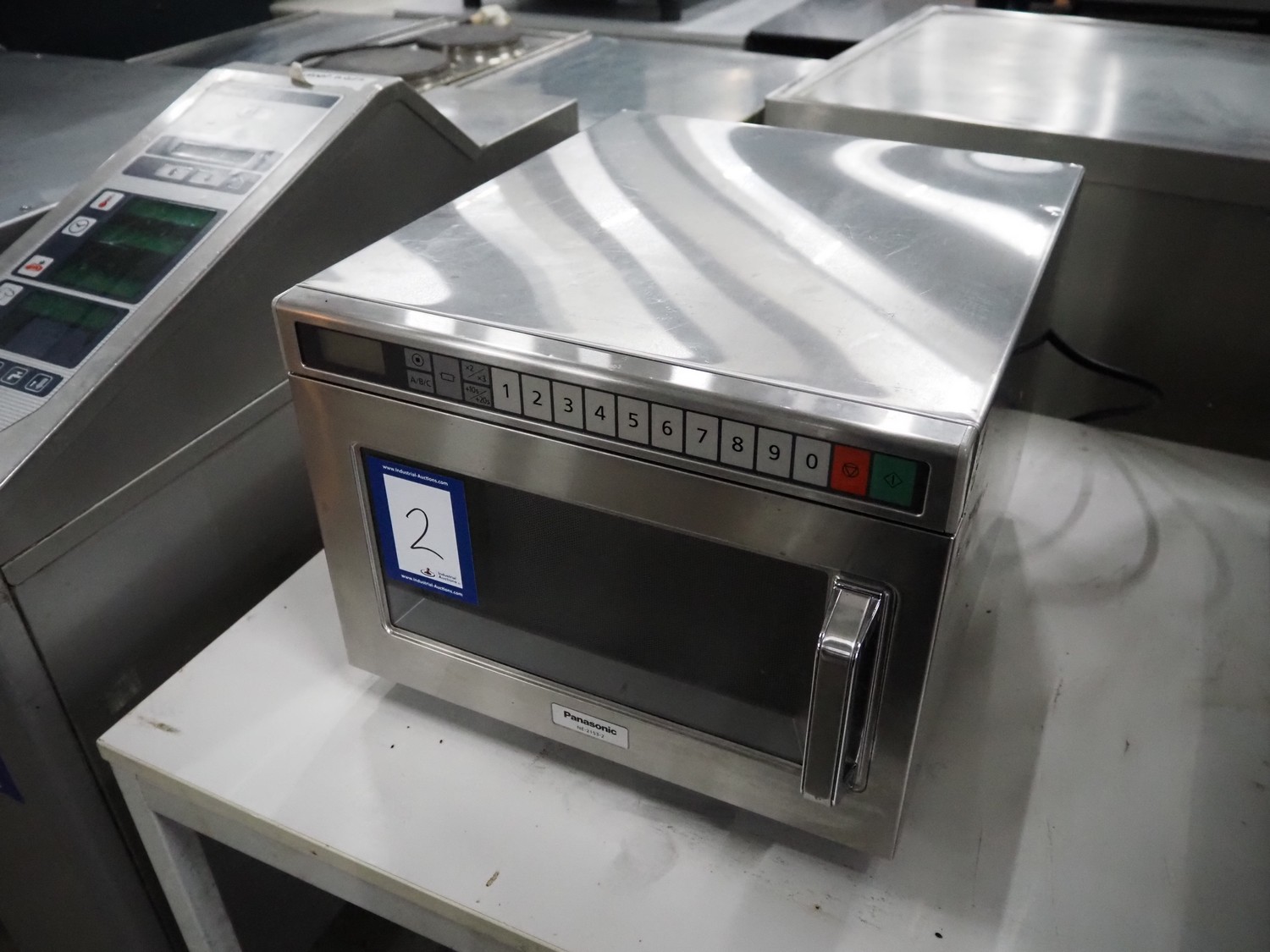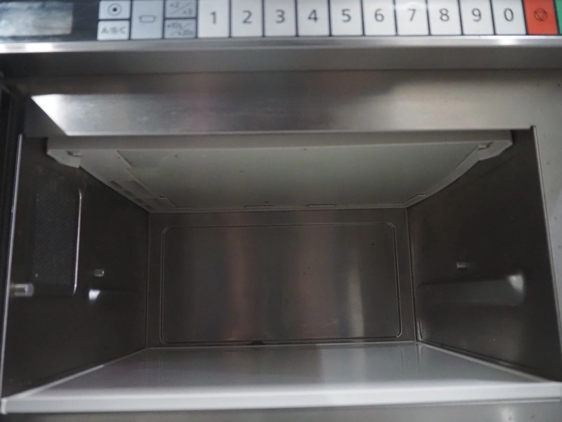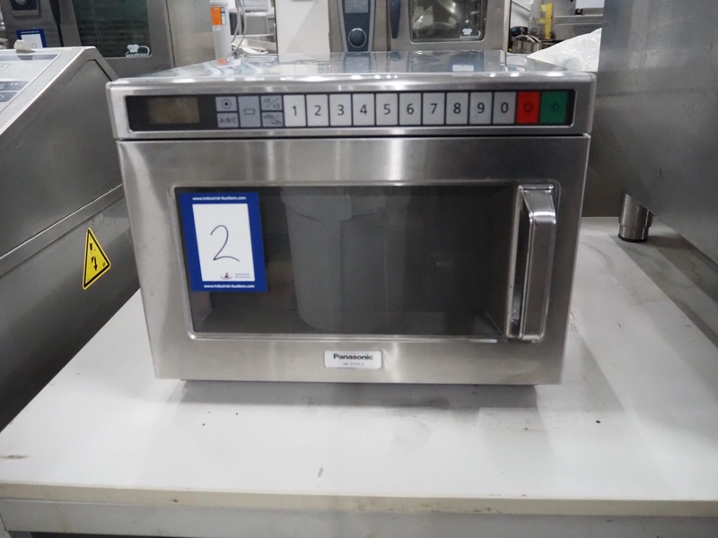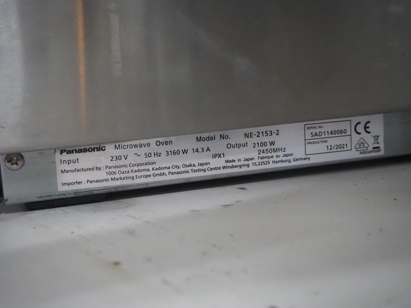 Panasonic microwave, model: NE-2153-2, serial number: 5AD1140060, year of construction: 12/2021, 230 V, 50 Hz, 14.4 A, 3160 W, inside dimensions: 330 mm x 310 mm x 160 mm, total dimensions: 420 mm x 500 mm x 340 mm.