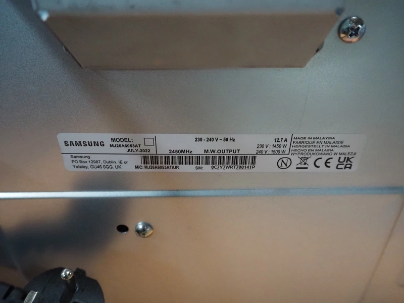 Samsung microwave, model: MJ26A6053AT, serial number: 0C7Y7WRT700141P, year of construction: July 2022, 230-240 V, 50 Hz, 12.7 A, 1450 W, inside dimensions: 370 mm x 370 mm x 200 mm, total dimensions: 460 mm x 560 mm x 370 mm.