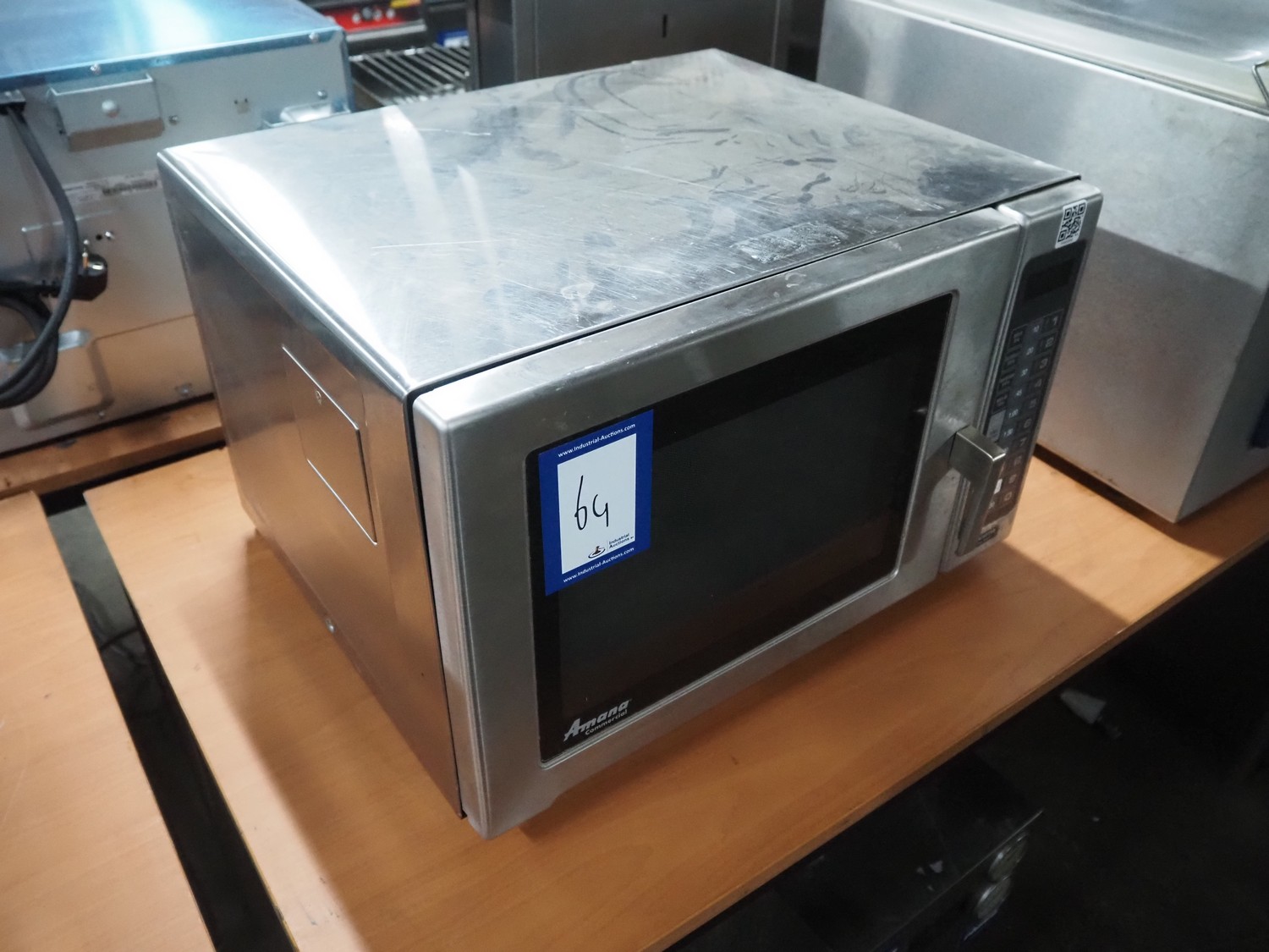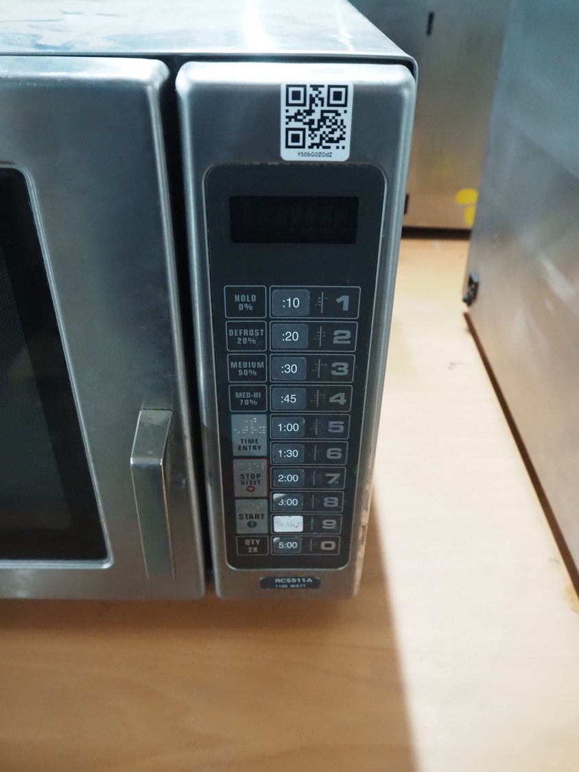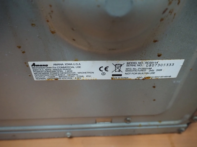 Amana microwave, model: RCS511A, serial number: 0807305333, year of construction: July 2008, 230 V, 1 Ph, 50 Hz, 1.6 kW, inside dimensions: 360 mm x 410 mm x 240 mm, total dimensions: 550 mm x 500 mm x 360 mm.