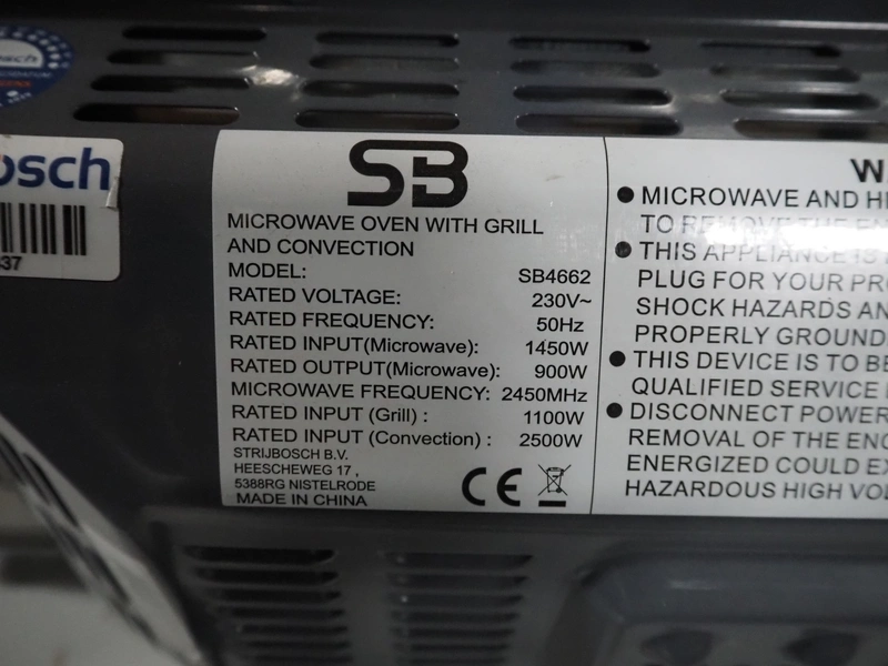 SB microwave, model: SB4662, 230 V, 50 Hz, 1450 W, inside dimensions: 330 mm x 330 mm x 230 mm, total dimensions: 520 mm x 520 mm x 320 mm.