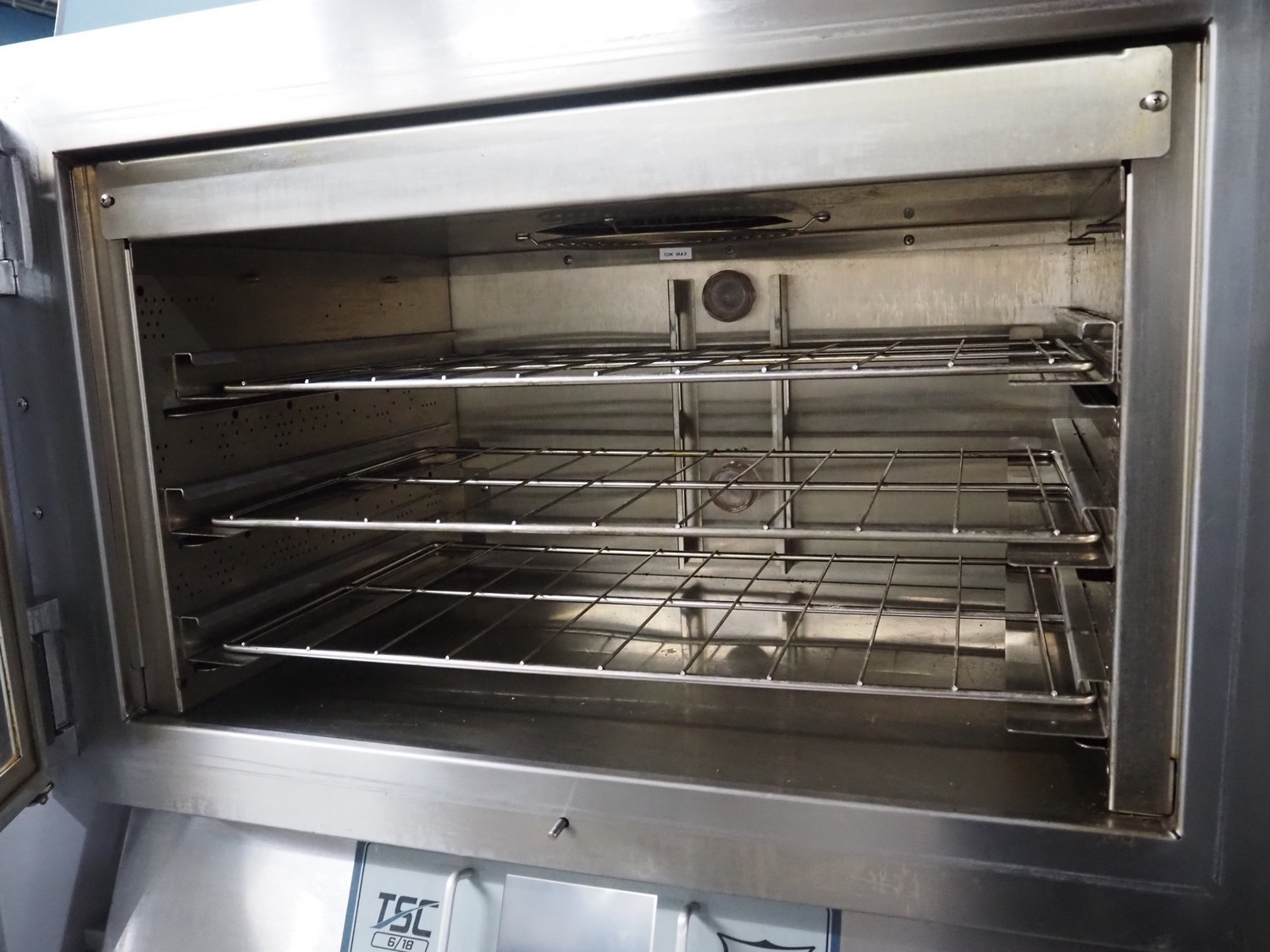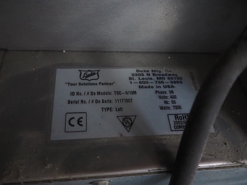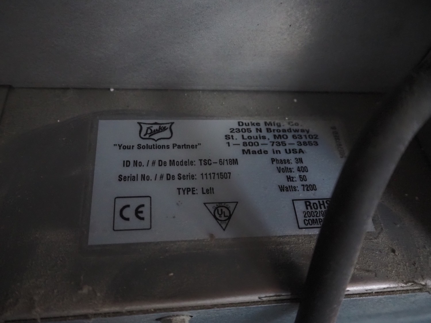 Duke proofer with oven, model: TSC-6/18M, serial number: 11171507, 400 V, 3 Ph, 50 Hz, 7200 W, 12 floors, floor dimensions: (12x) 660 mm x 400 mm, total dimensions: 950 mm x 740 mm x 1960 mm.