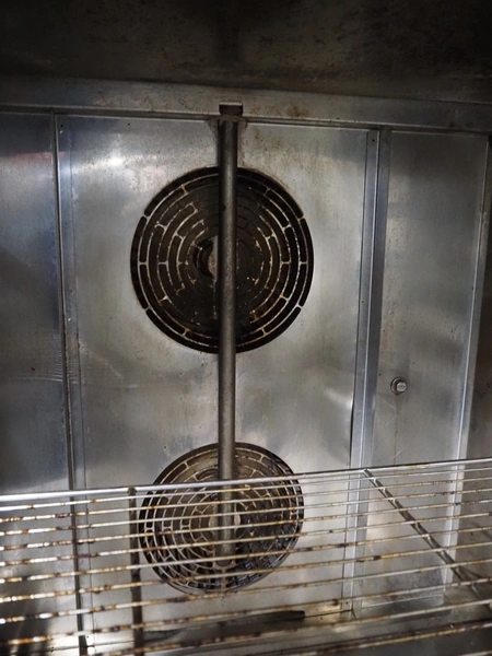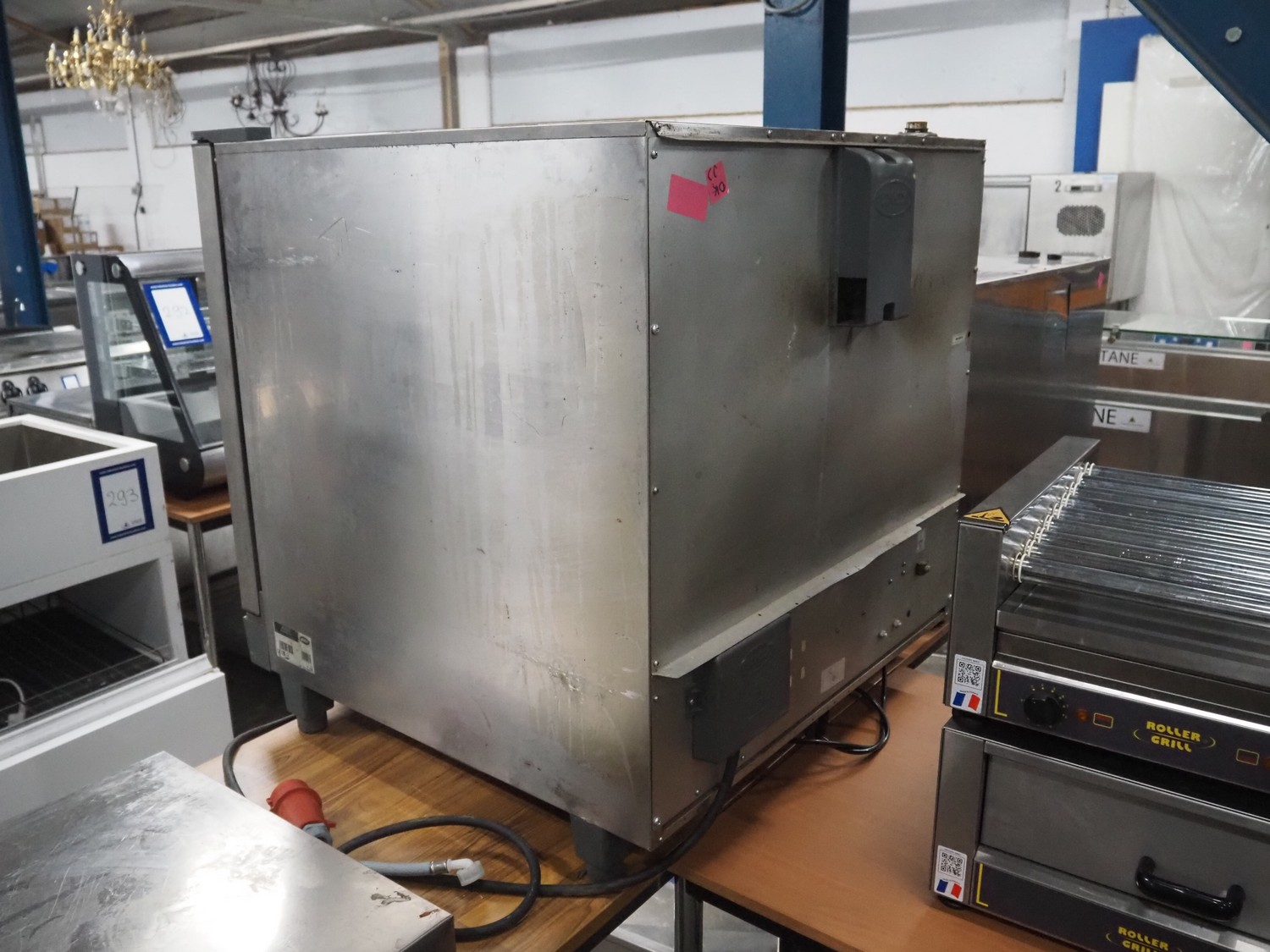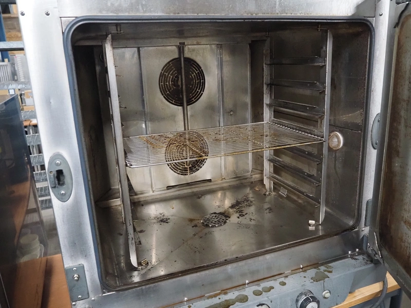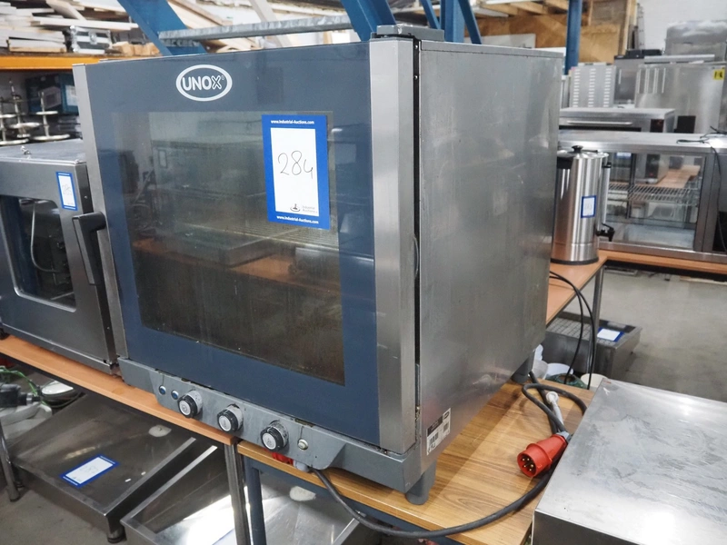 Unox combi steamer, model: XV593, serial number: 2015D0024742, year of construction: 2015, 400 V, 3 Ph, 50/60 Hz, weight: 100.9 kg, 7 floors, floor dimensions: (7x) 530 mm x 300 mm, total dimensions: 870 mm x 880 mm x 910 mm.