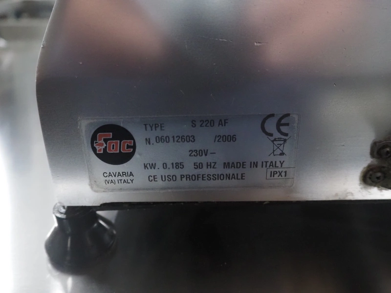 FAC slicer, type: S 220 AF, number: 060 12603, year of construction: 2006, 230 V, 50 Hz, 0.185 kW, dimensions: 400 mm x 430 mm x 360 mm.