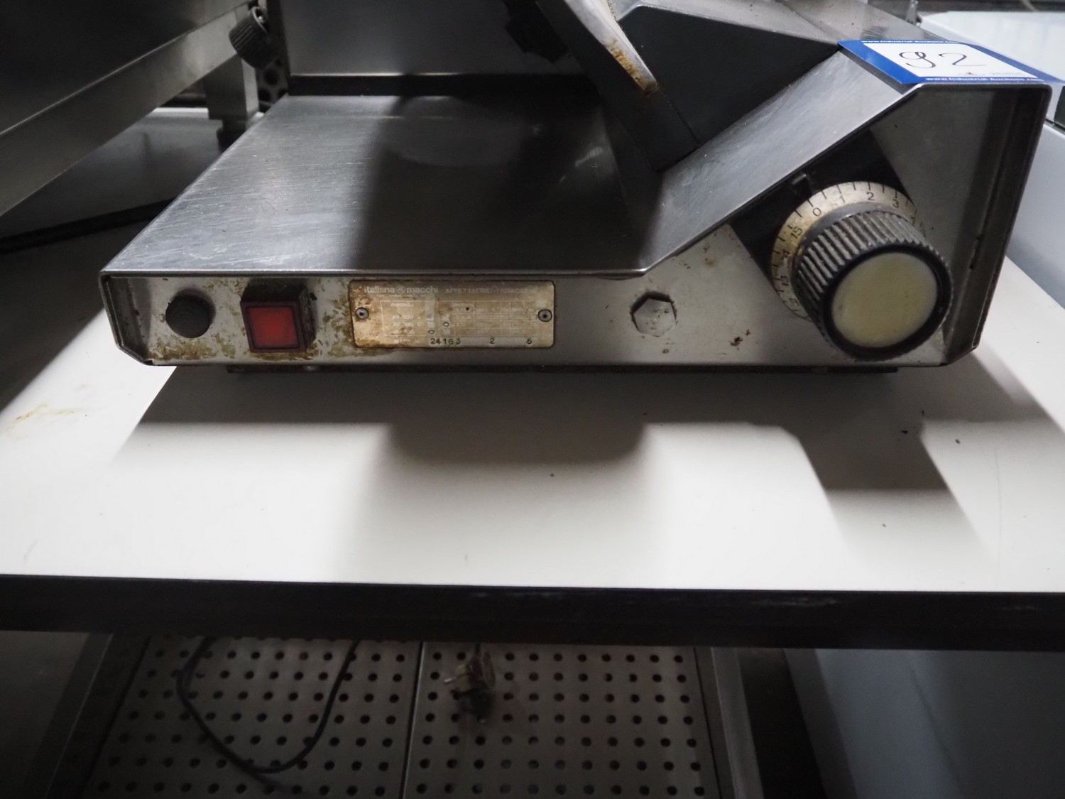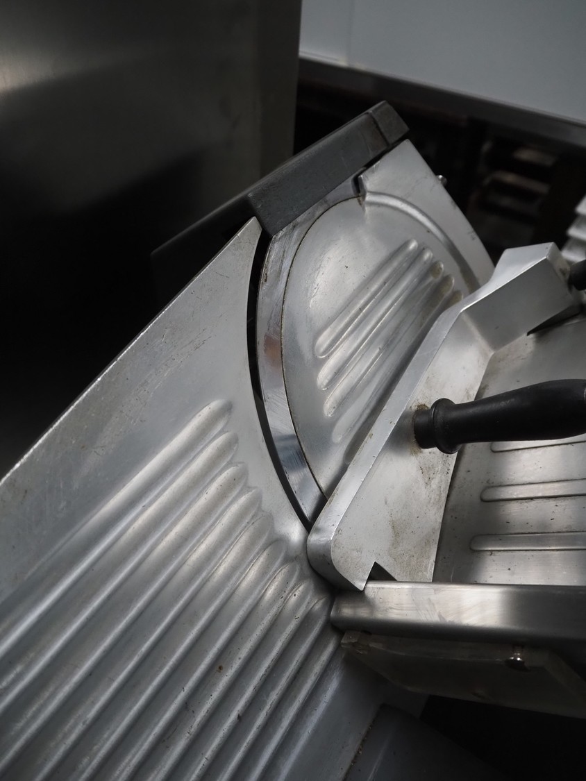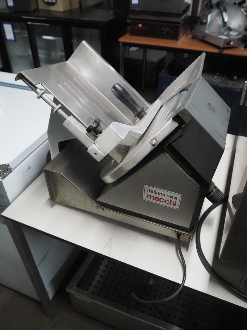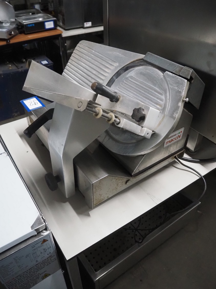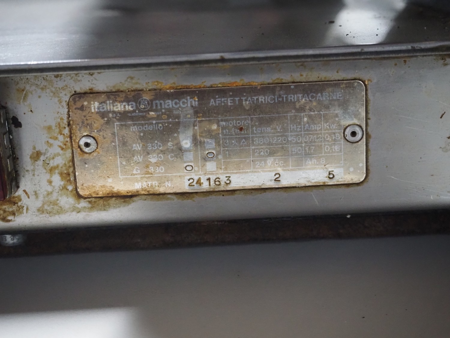 Italiana Macchi slicer, model: AV 330 S, serial number: 24163, 220 V, 50 Hz, 1.7 A, 0.18 kW, dimensions: 660 mm x 600 mm x 440 mm.
