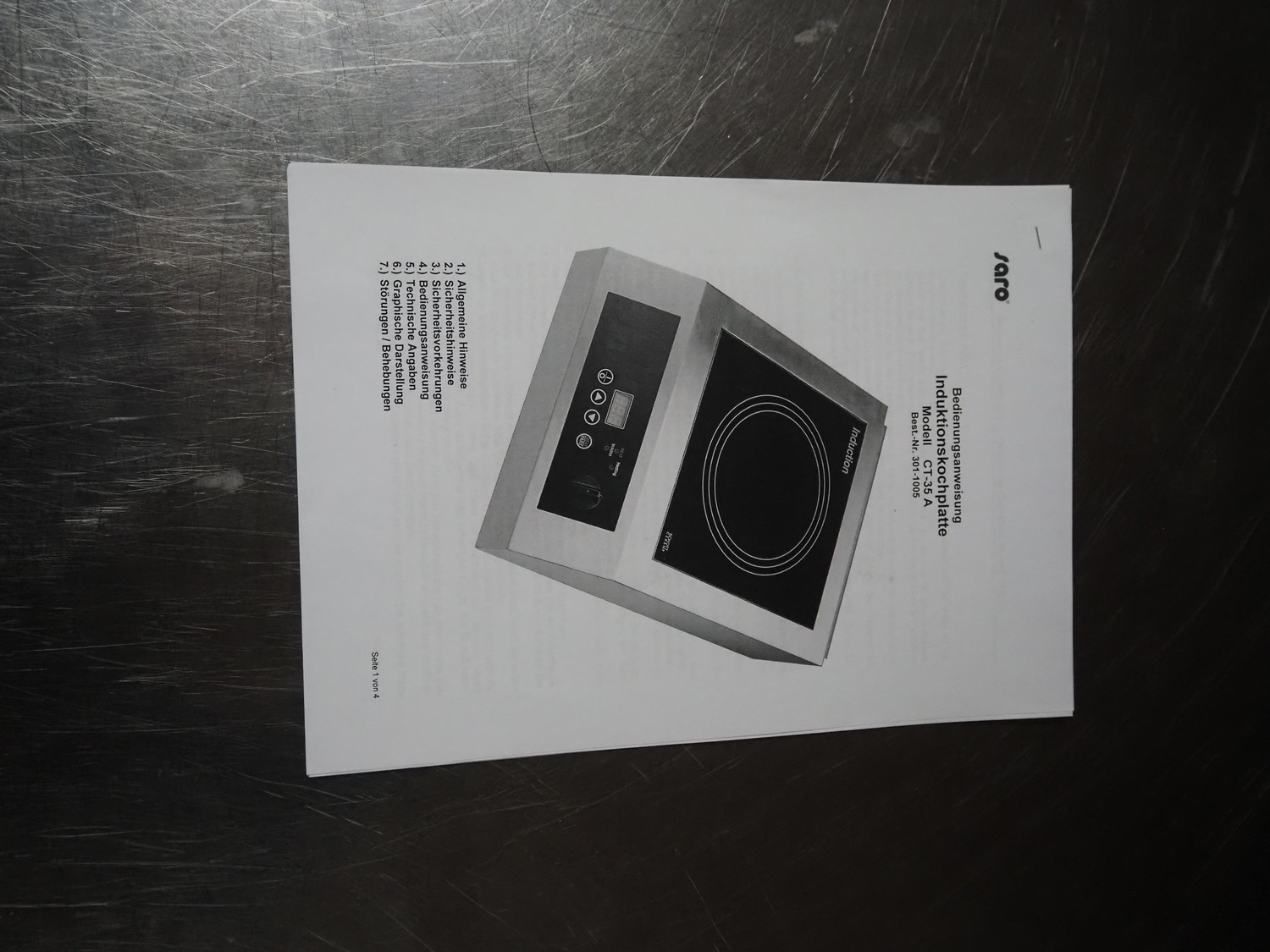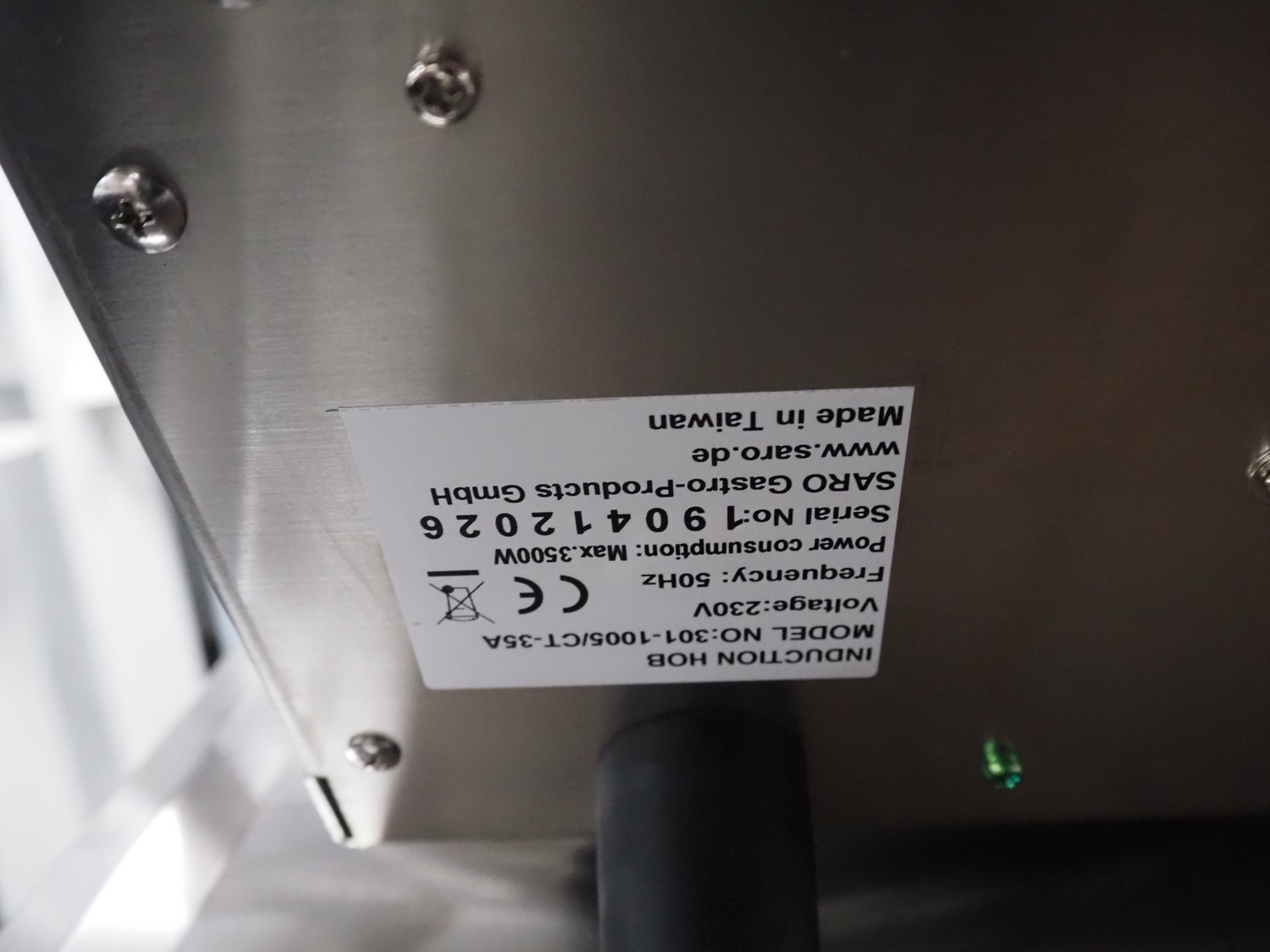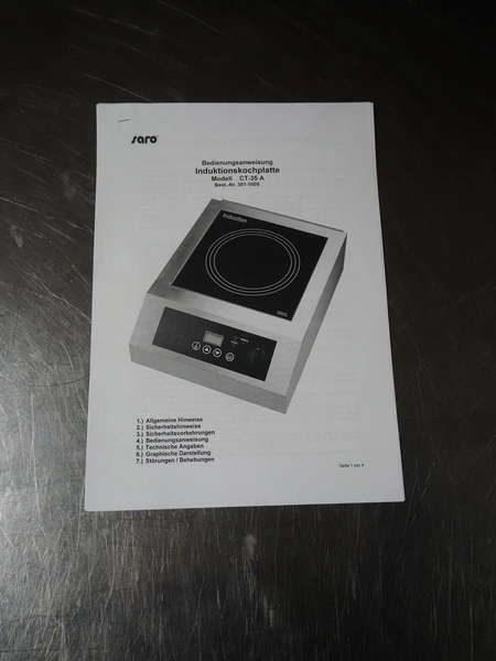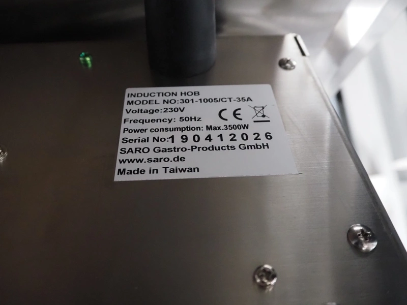 Saro Gastro-Products GmbH induction hob, model: 301-1005/CT-35A, serial number: 190412026, 230 V, 50 Hz, 3500 W, dimensions: 490 mm x 380 mm x 200 mm. Including pan.