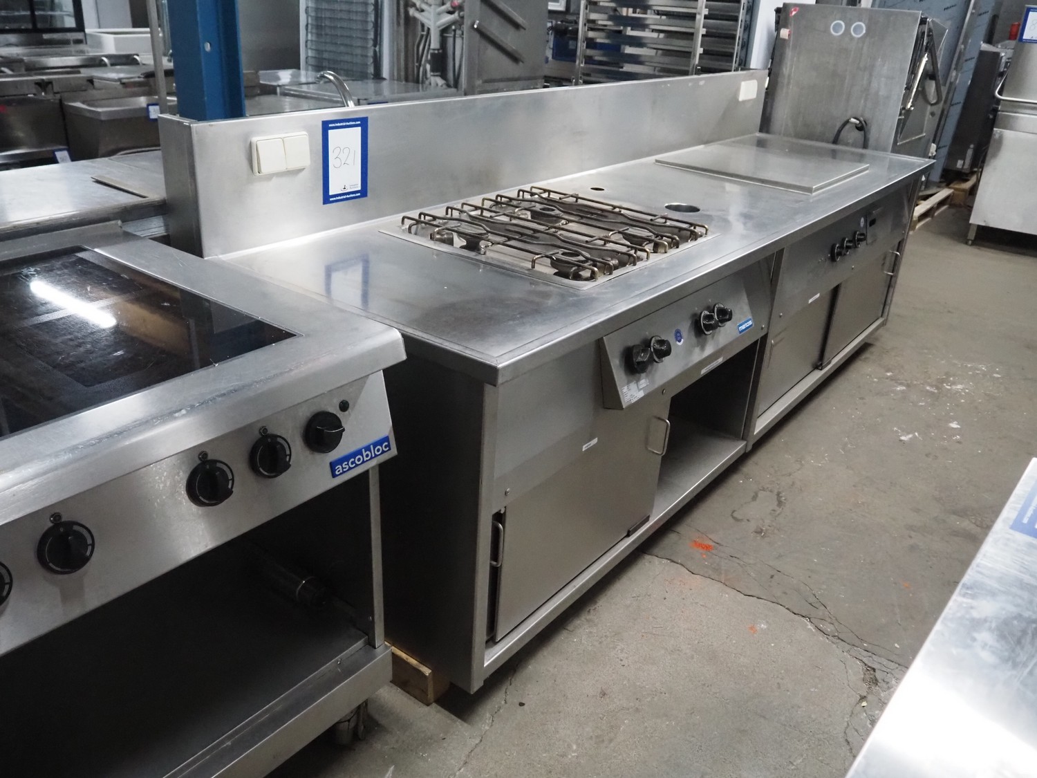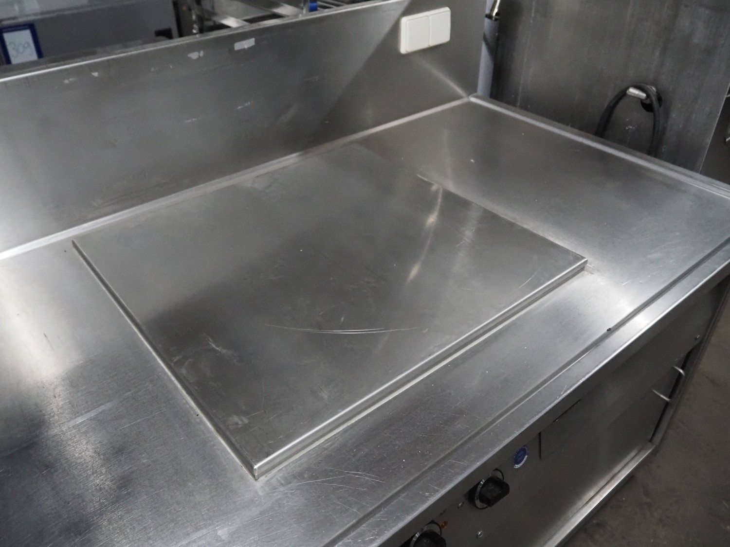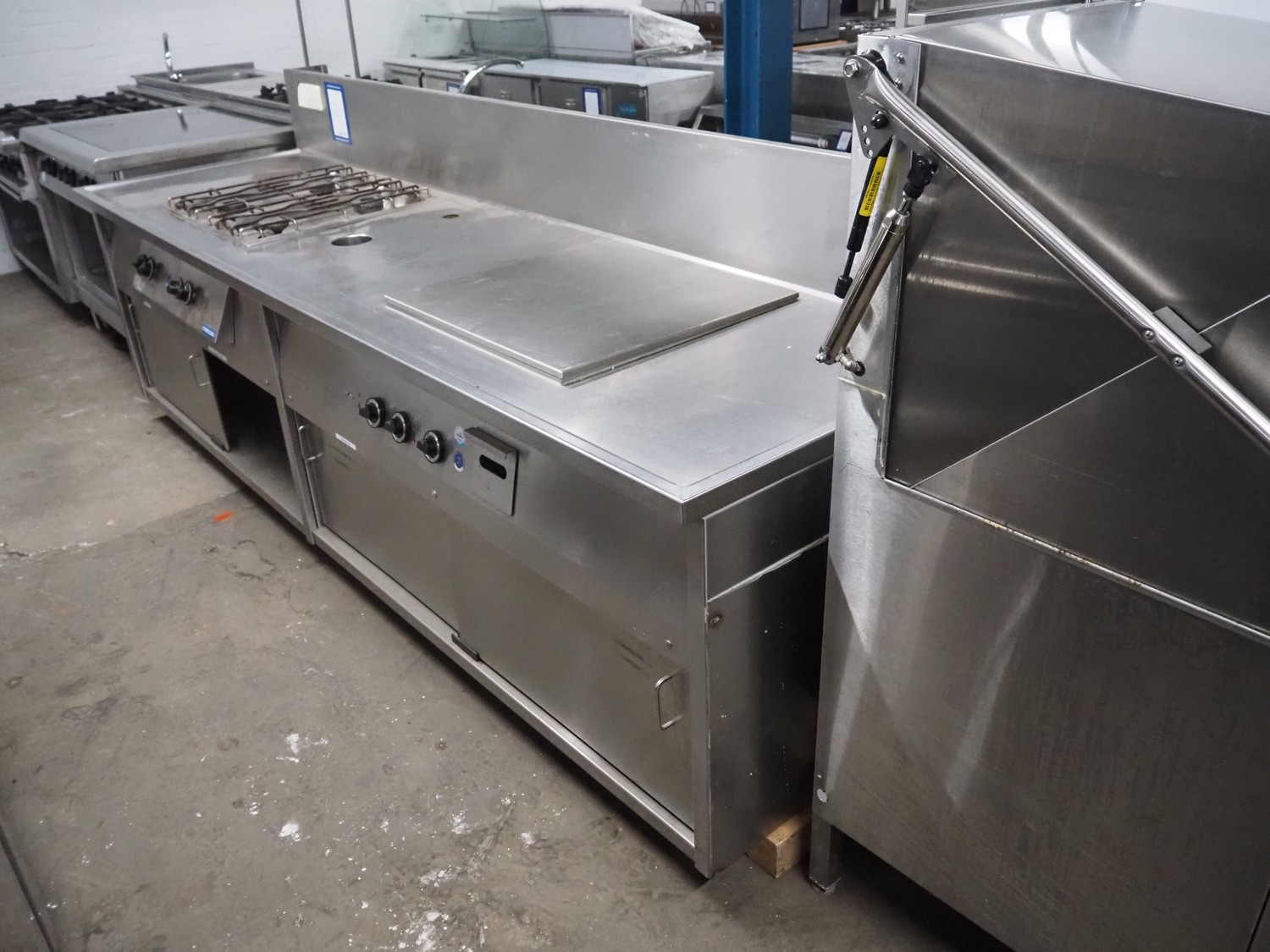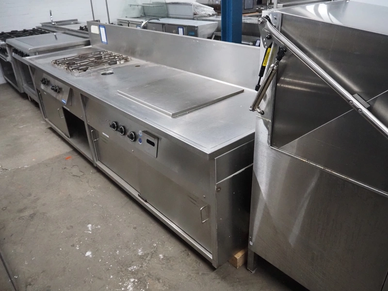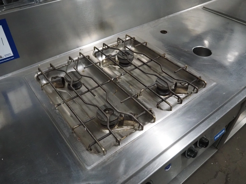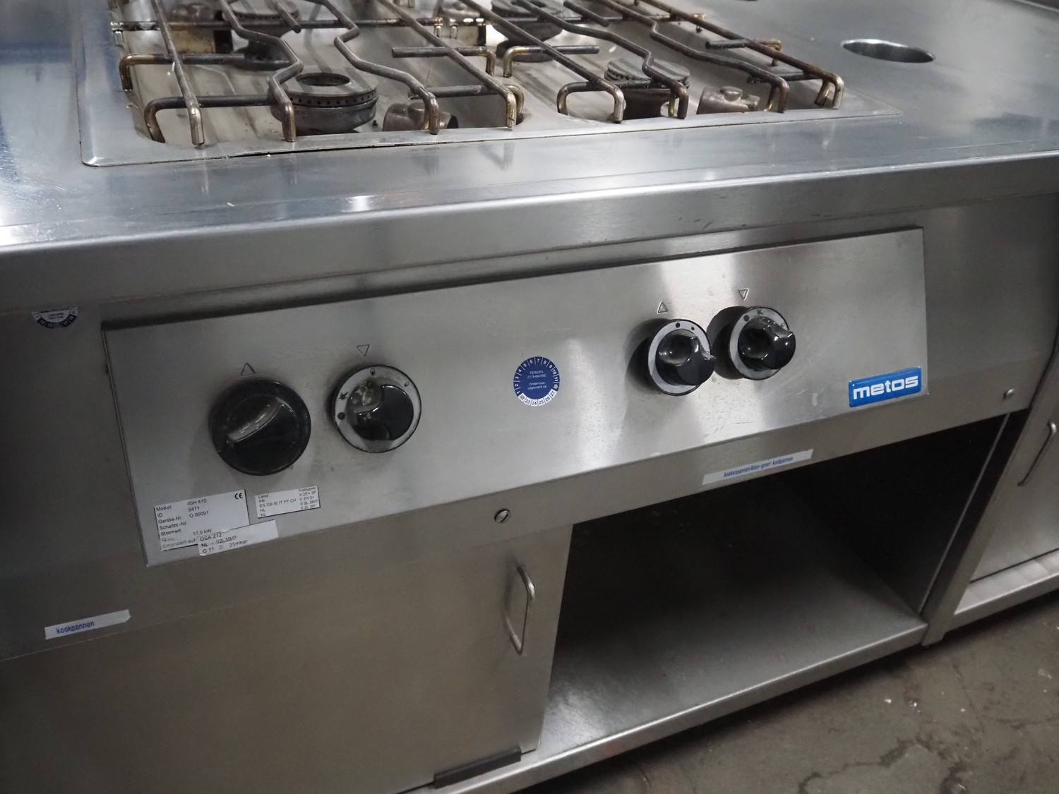 Metos workbench with 4 pits stove and electric heated hob, model: IGH 410, 17 kW, dimensions: 2980 mm x 950 mm x 1120 mm.