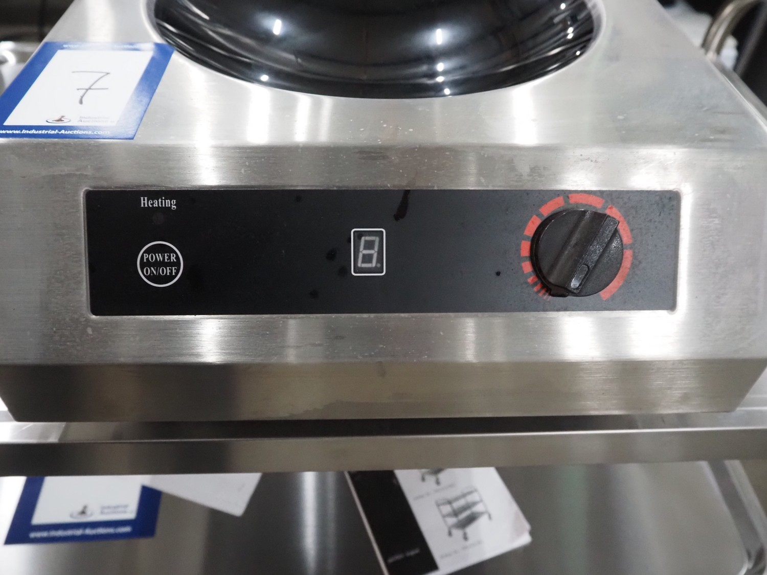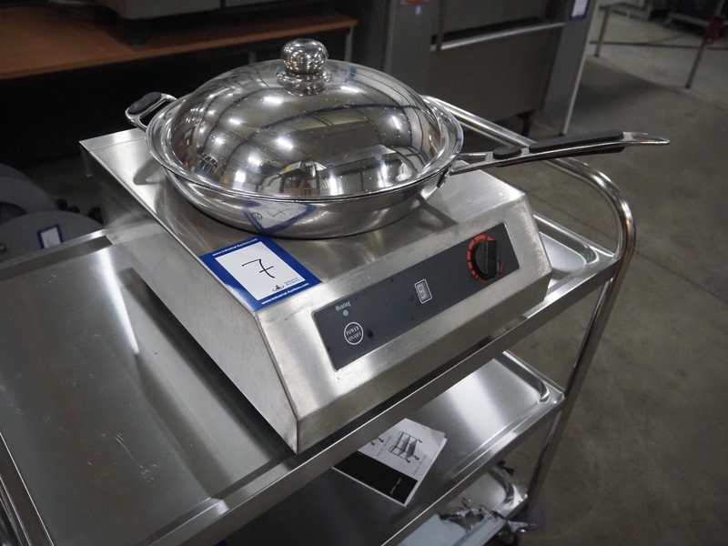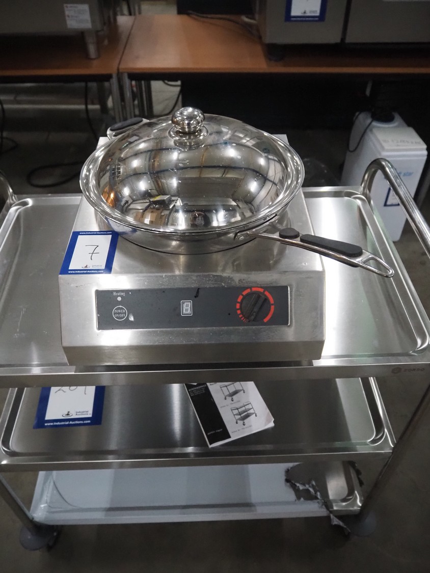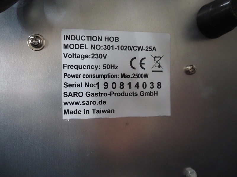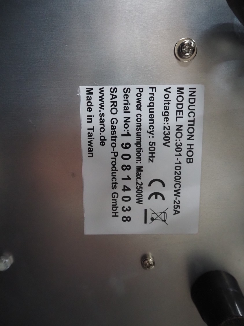 Saro Gastro-Products GmbH induction hob, model: 301-1020/CW-25A, serial number: 190814038, 230 V, 50 Hz, 2500 W, dimensions: 490 mm x 380 mm x 160 mm. Including pan.