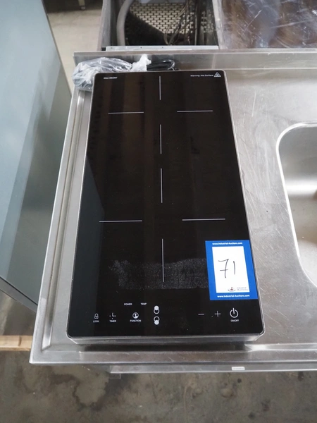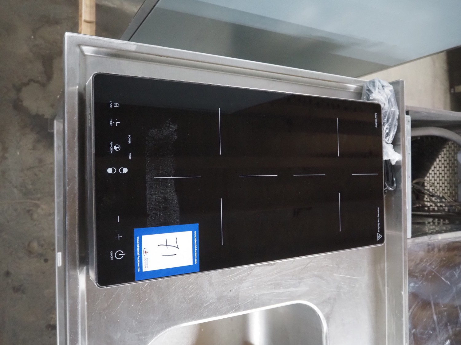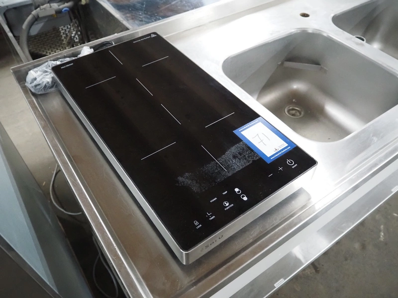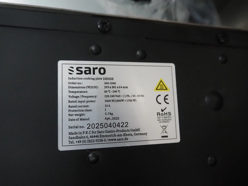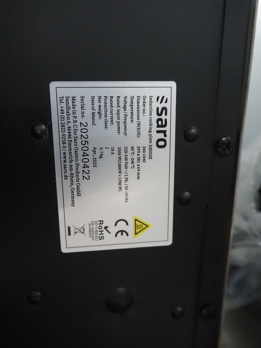 Saro Gastro-Products GmbH induction plate, type: DENISE, serial number: 2025040422, year of construction: April 2025, 220-240 V, 1 Ph, 50-60 Hz, 16 A, 3500 W, weight: 5.7 kg, dimensions: 580 mm x 300 mm x 60 mm.