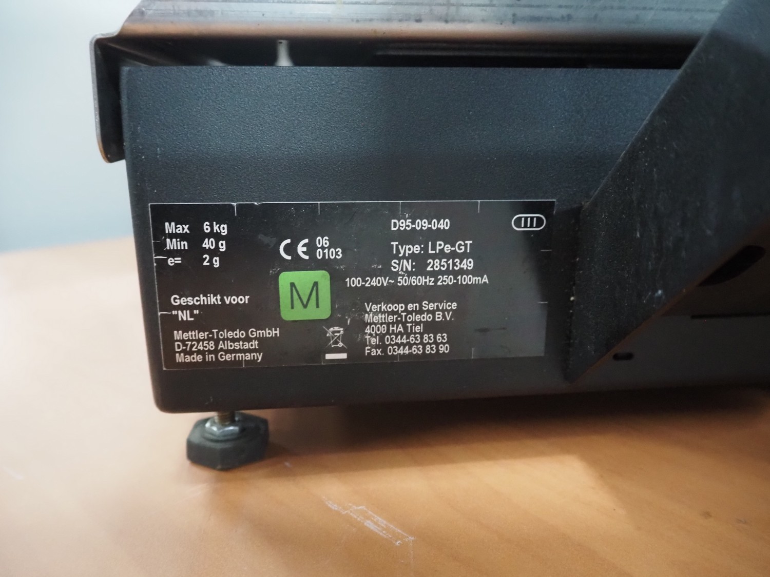 Mettler Toledo weighing scale, type: LPe-GT, serial number: 2851394, 100-240 V, 50/60 Hz, dimensions scale: 360 mm x 280 mm, total dimensions: 470 mm x 420 mm x 500 mm. Defect.