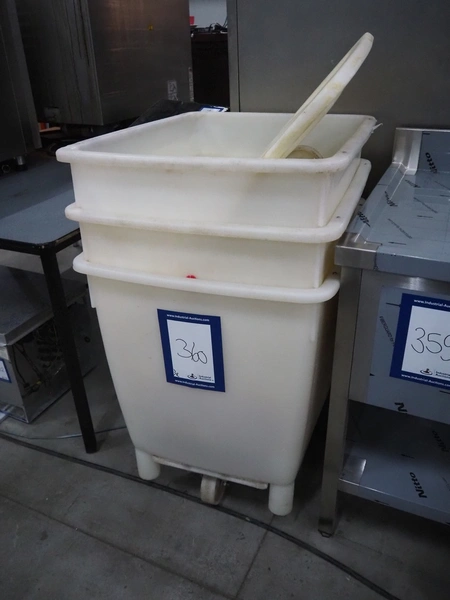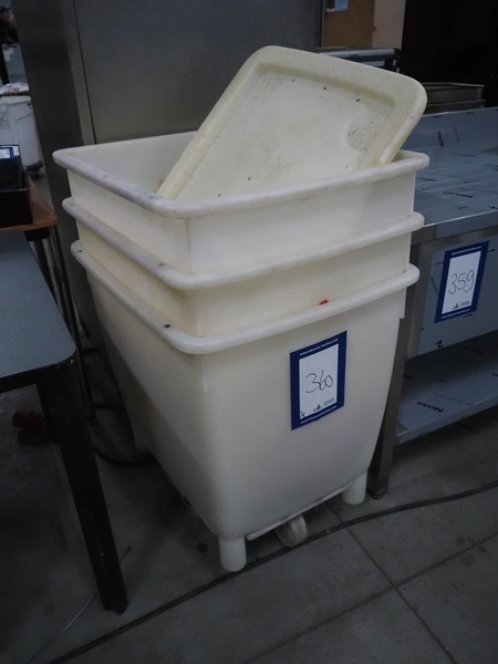 Rollie with 3 plastic tubs, dimensions: (3x) 760 mm x 580 mm x 690 mm.
