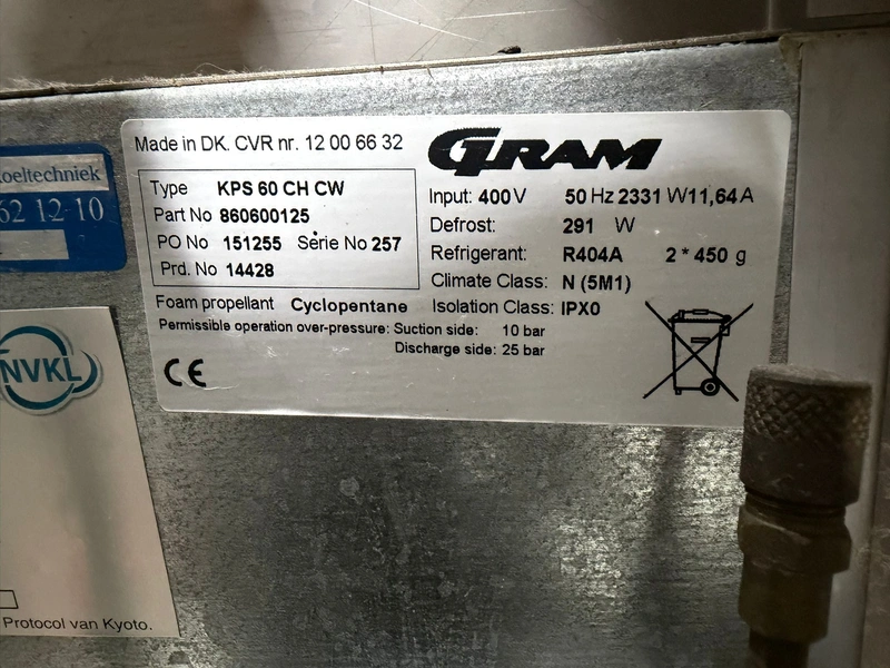 Gram blast chiller, type: KPS 60 CH CW, serial number: 257, 400 V, 50 Hz, 11.64 A, 2331 W, refrigerant: R404A, inside dimensions: 460 mm x 760 mm x 1550 mm, total dimensions: 800 mm x 1020 mm x 2250 mm.