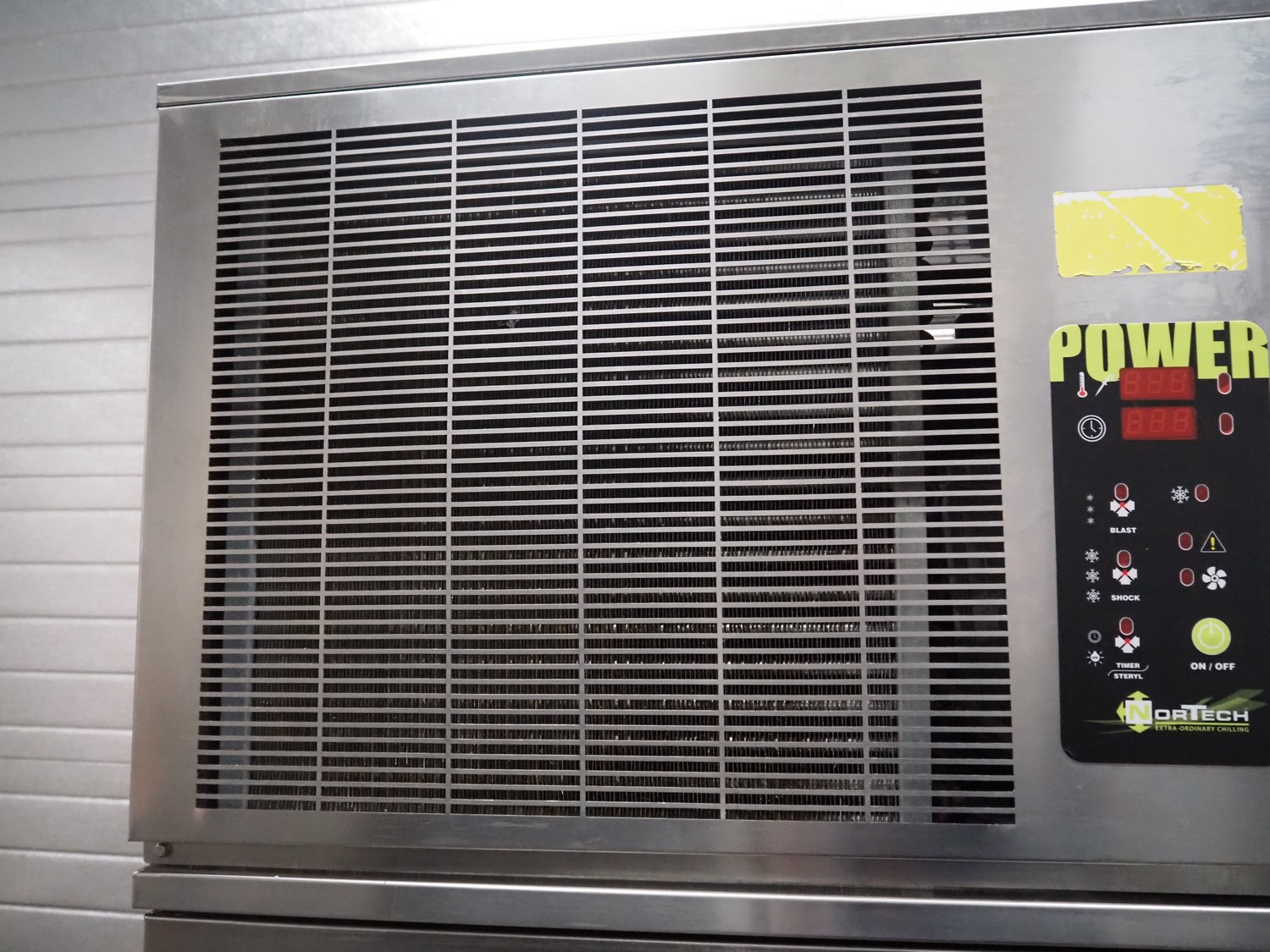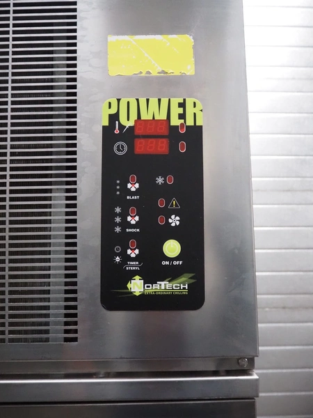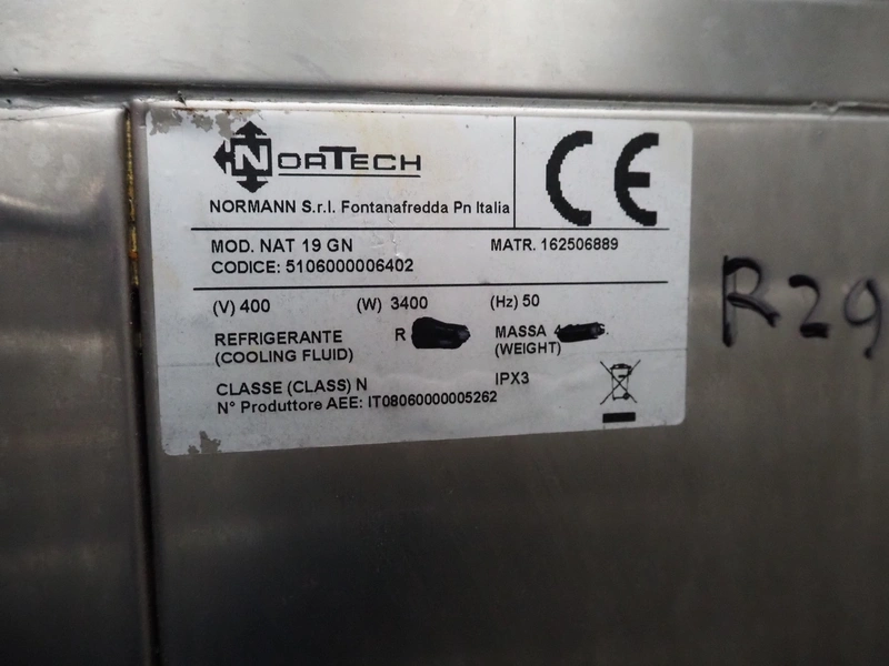 Nortech chiller, model: NAT 19 GN, serial number: 162506889, 400 V, 50 Hz, 3400 W, 19 floors, floor dimensions: (19x) 530 mm x 330 mm, total dimensions: 740 mm x 780 mm x 2210 mm.
