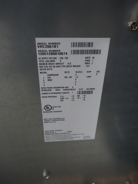 Mile High Equipment Co. condensor, model: VRC2061B1, serial number: 12051280010674, 208-230 V, 60 Hz, dimensions: 710 mm x 750 mm x 650 mm.