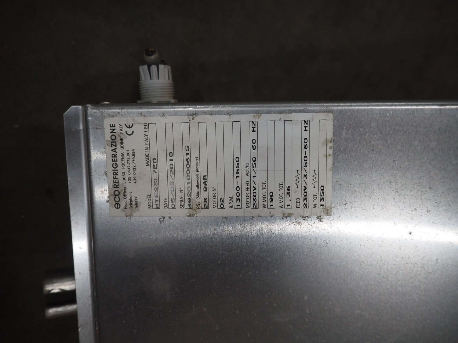 ECO Refrigerazione evaporator, model: MTE23L7ED, serial number: 8G201000615, year of construction: 05/03/2010, 230 V, 3 Ph, 50-60 Hz, 1350 W, 1300-1550 rpm, max pressure: 28 bar, dimensions: 1190 mm x 570 mm x 250 mm.