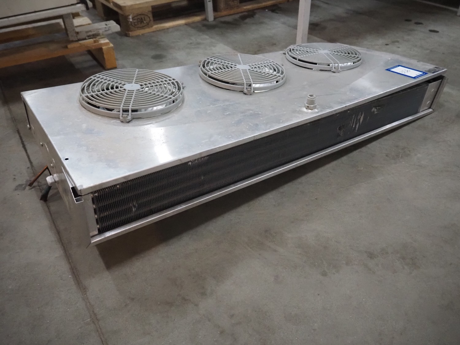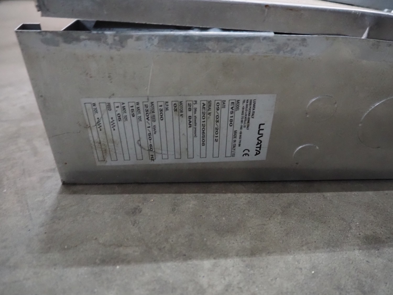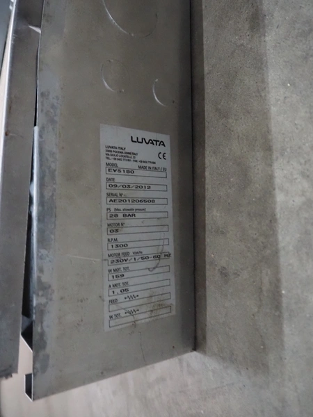 Luvata evaporator, model: EVS180, serial number: AE201206508, year of construction: 09/03/2012, 230 V, 3 Ph, 50-60 Hz, 1350 W, 1300 rpm, max pressure: 28 bar, dimensions: 1110 mm x 450 mm x 160 mm.