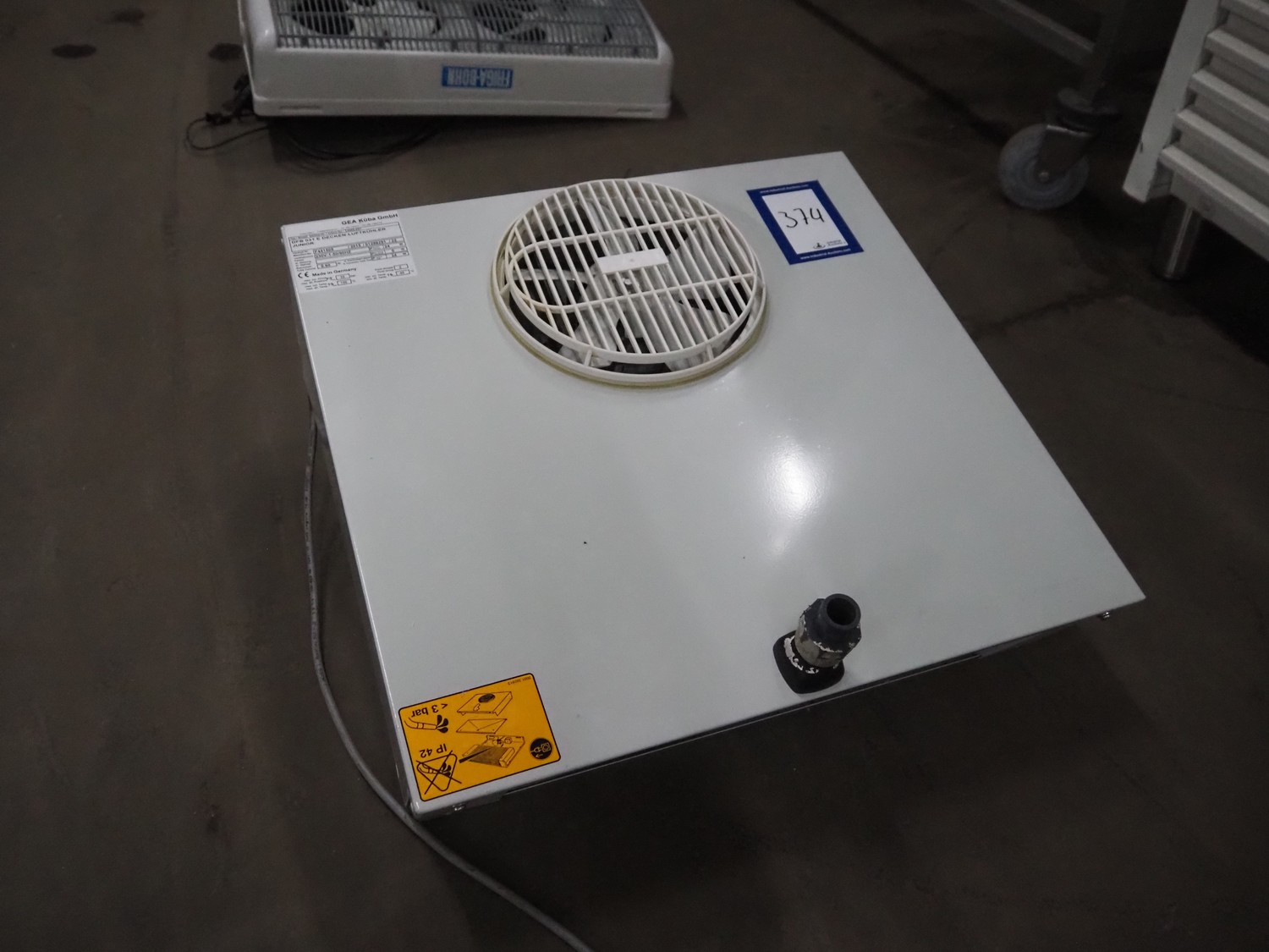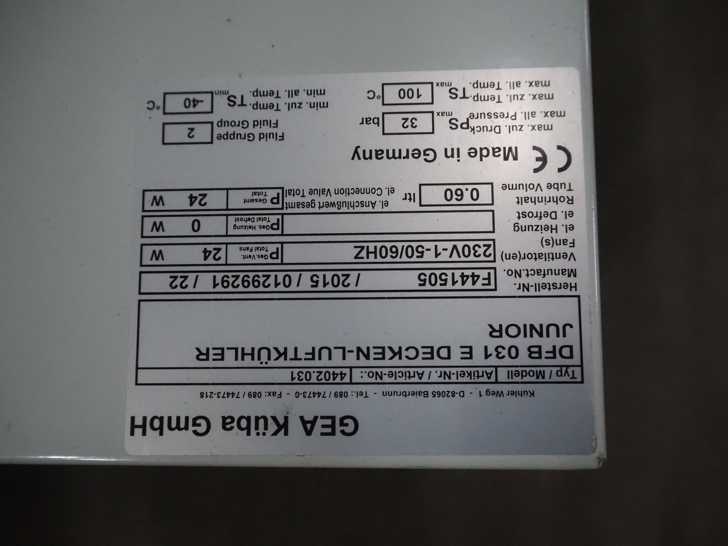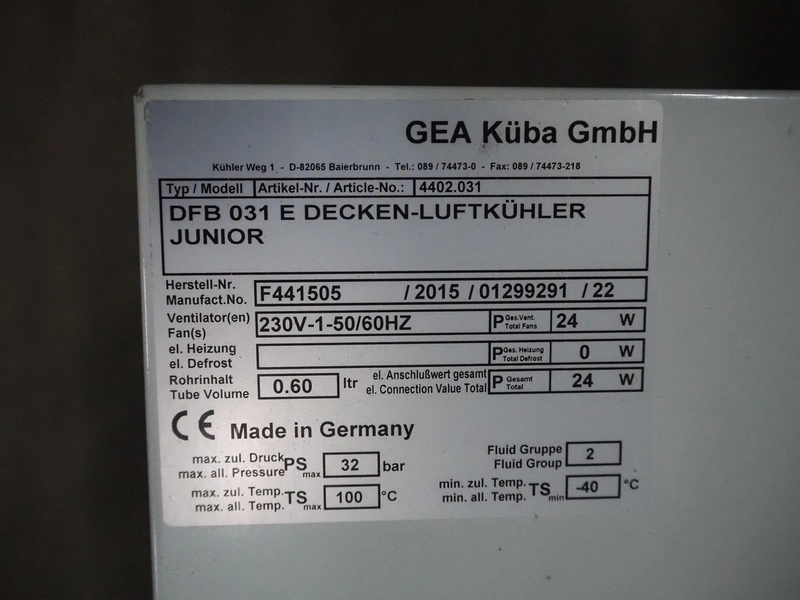 Gea Küba GmbH evaporator, model: DFB 031 E DECKEN-LUFTKÜHLER JUNIOR, number: F441505, year of construction: 2015, 230 V, 50/60 Hz, 24 W, dimensions: 530 mm x 510 mm x 230 mm.