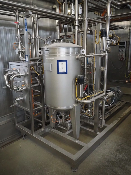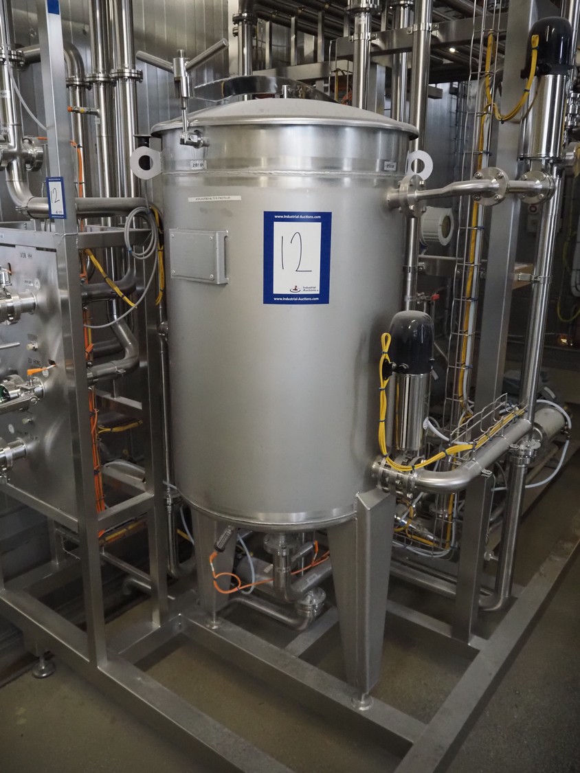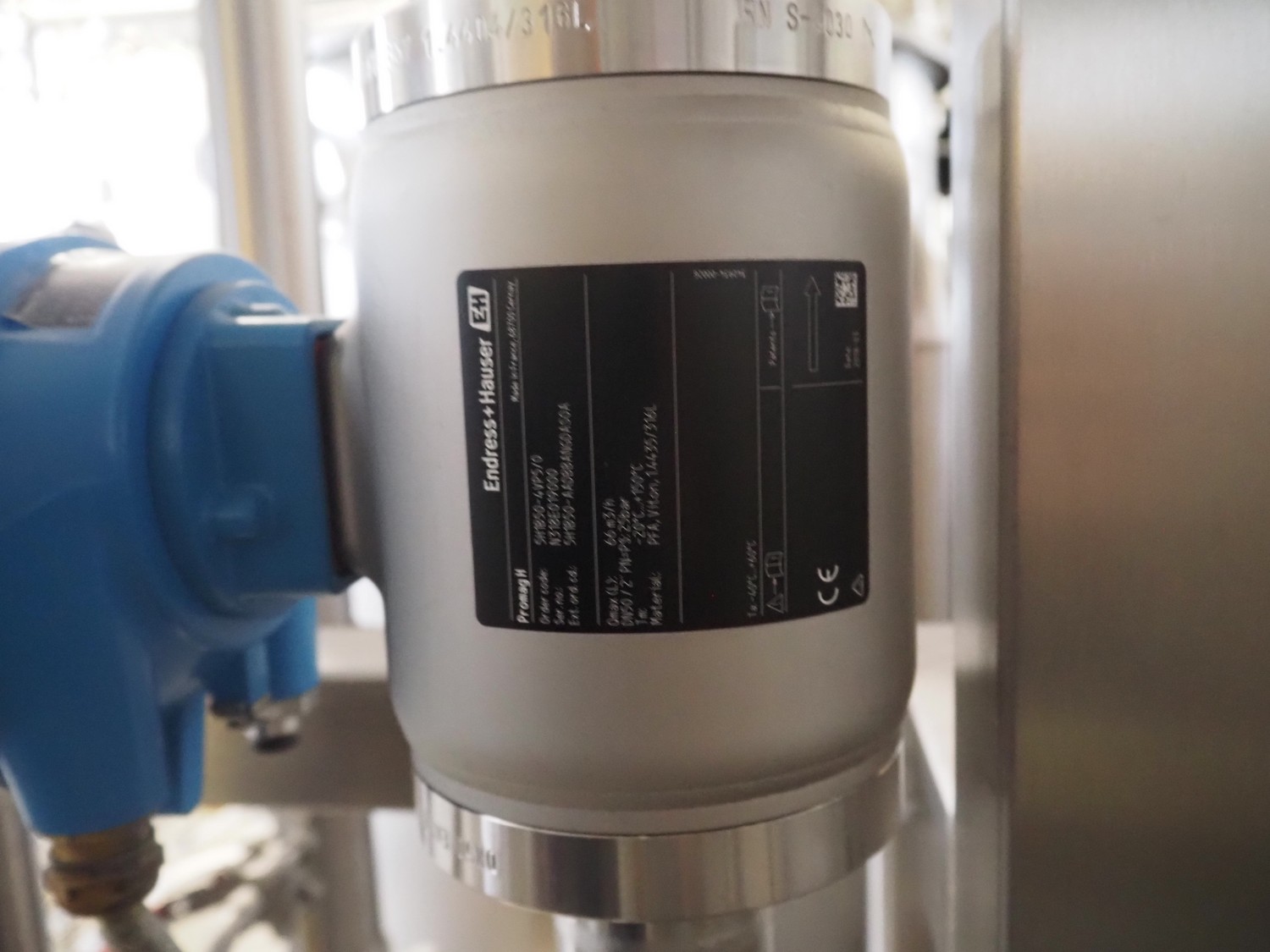 Pre-processor module on s/s skid, consisting of: manifold with 14 Kieselmann valves, Endress+Hauser flow meter, type: Promag H, serial number: N318E019000, Rieger s/s tank, type: B02, year of construction: 2018, volume: 300 liter and s/s flow board, dimensions: 1600 mm x 1300 mm x 2800 mm.