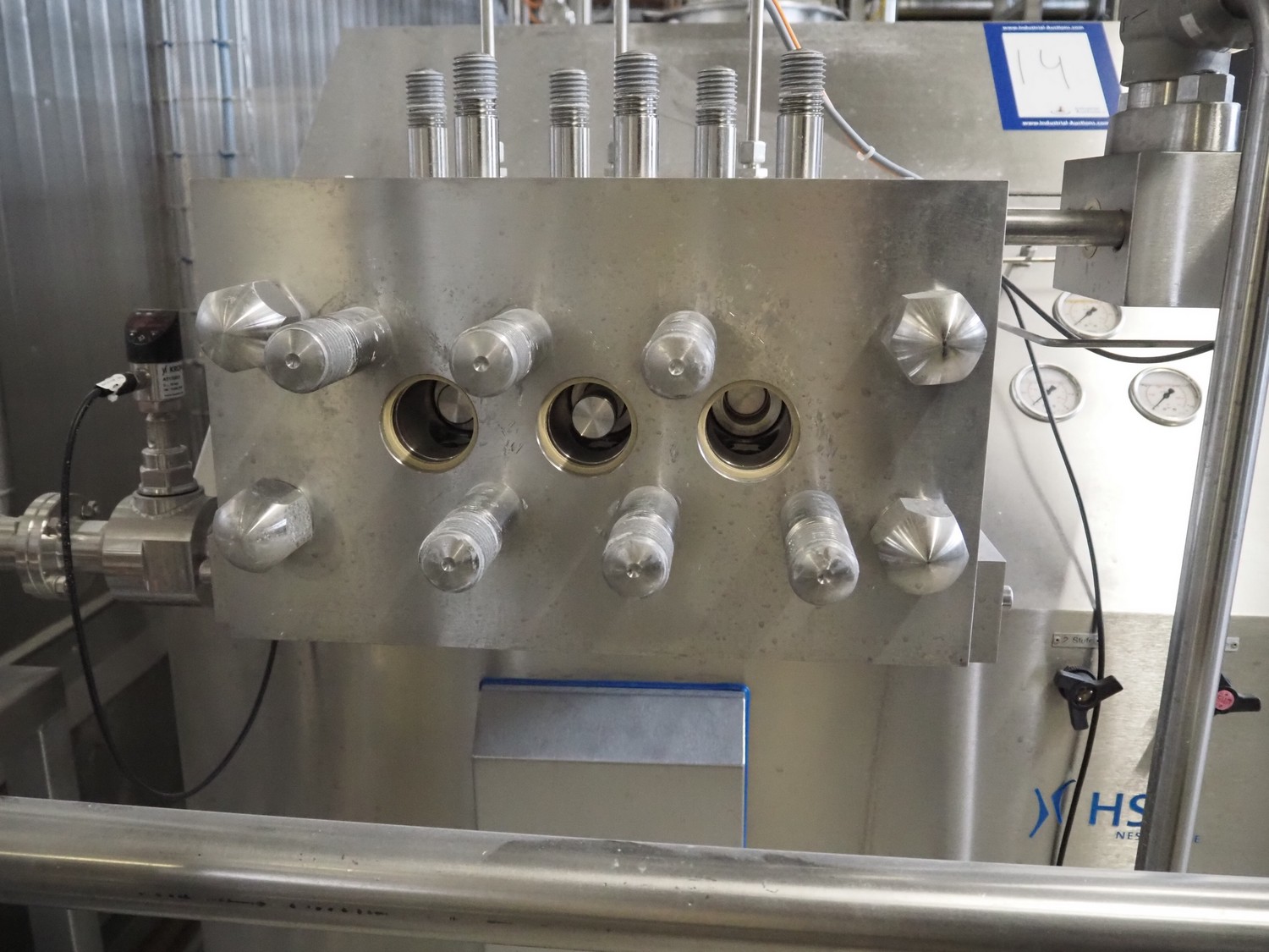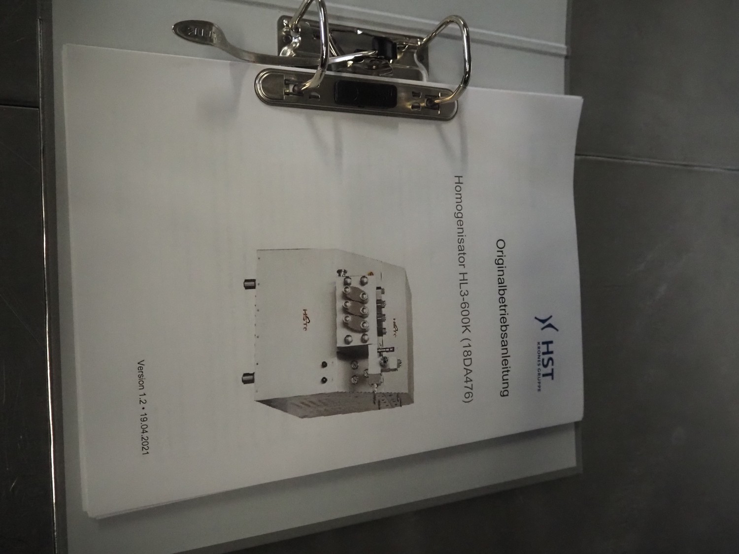 HST homogenizer, type: HL3-600K, serial number: 18DA476, year of construction: 2018, 45 kW, maximal pressure: 600 bar, capacity: 5000-12000 liter per hour, weight: 2950 kg, dimensions: 2050 mm x 1100 mm x 1350 mm. Including trolley for parts, dimensions: 1050 mm x 550 mm x 1050 mm.