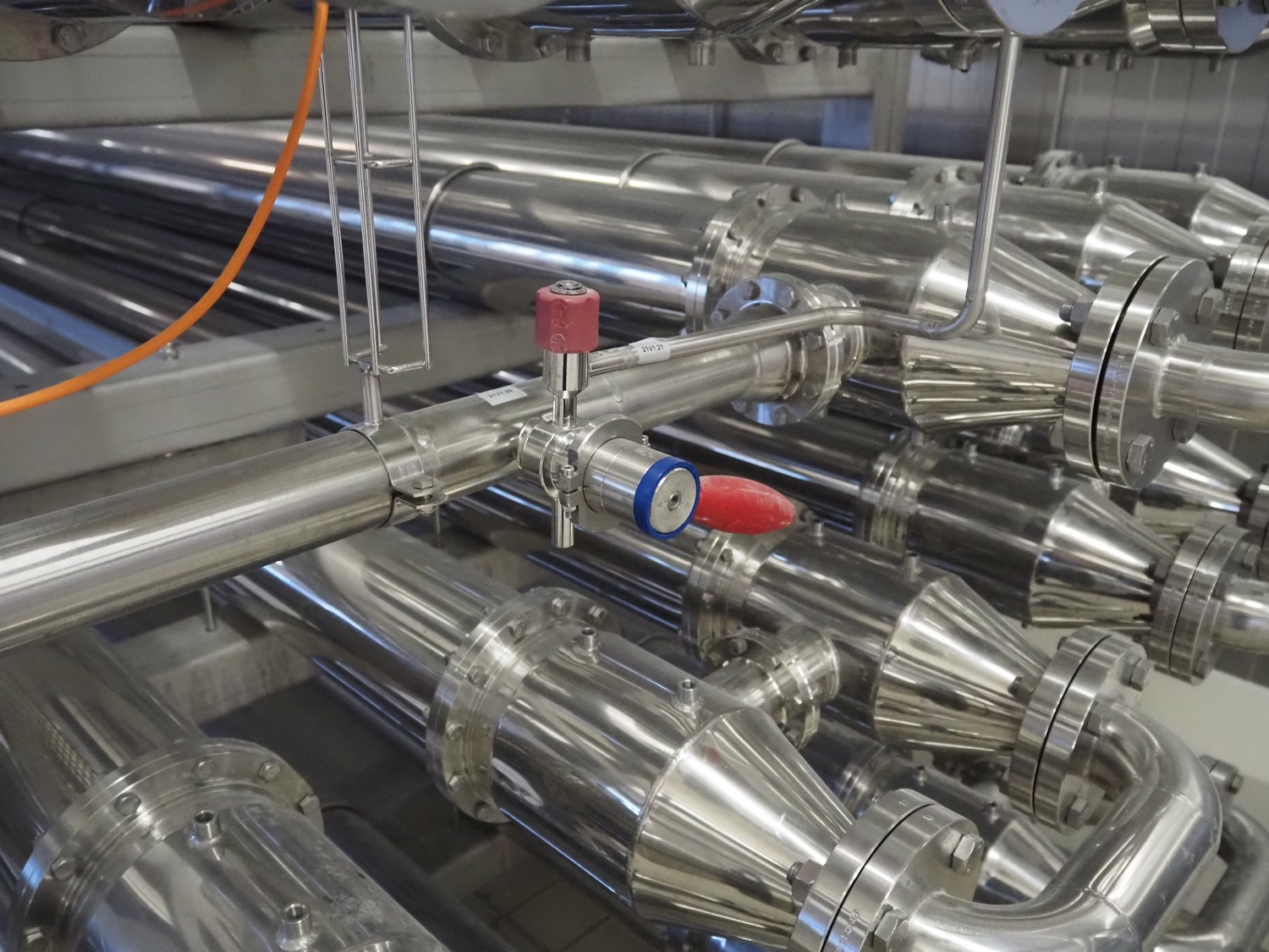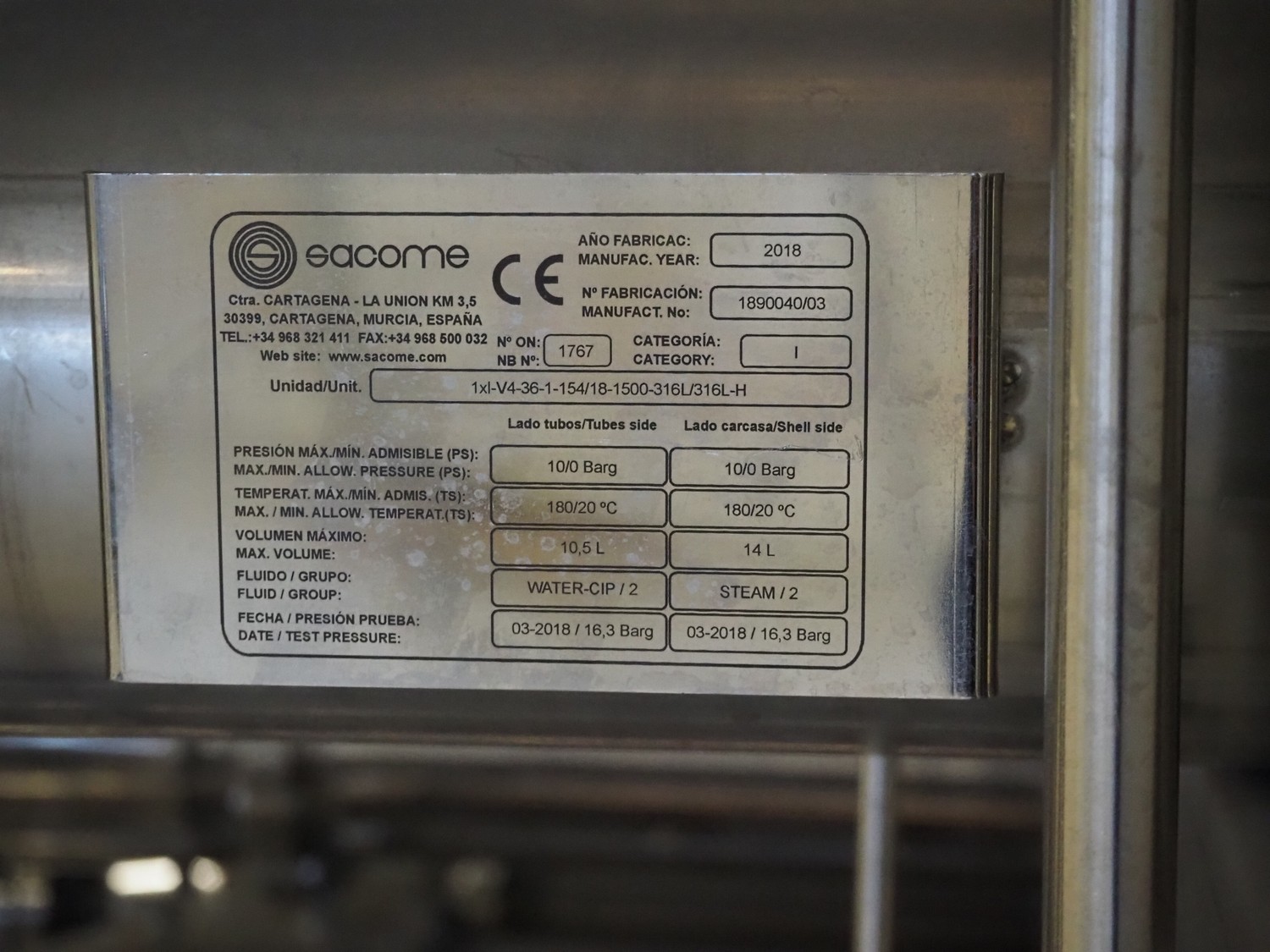 Sacome pasteuriser, model: 1xl-V4-36-1-154/18-1500-316L/316L-H, serial number: 1890040/03, year of construction: 2018, dimensions: 8000 mm x 2150 mm x 3400 mm. Including pump and valves among others.