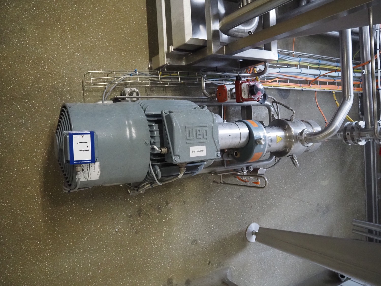 Bornemann hygienic twin screw pump, type: SLH-4G-2050, year of construction: 2018, 0.98-1.01 kW, capacity: 2 m³/h, pressure difference: 6 bar, 251-262 rpm, viscosity: 5000-10000 cst, dimensions: 1700 mm x 500 mm x 500 mm.