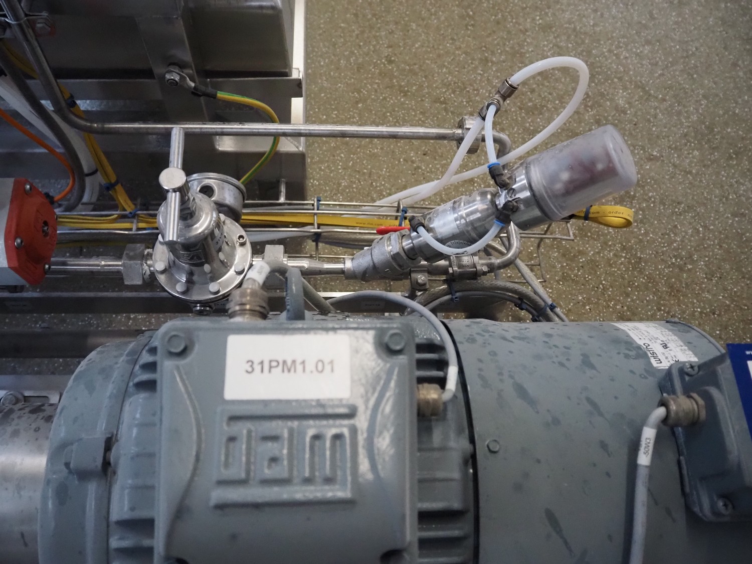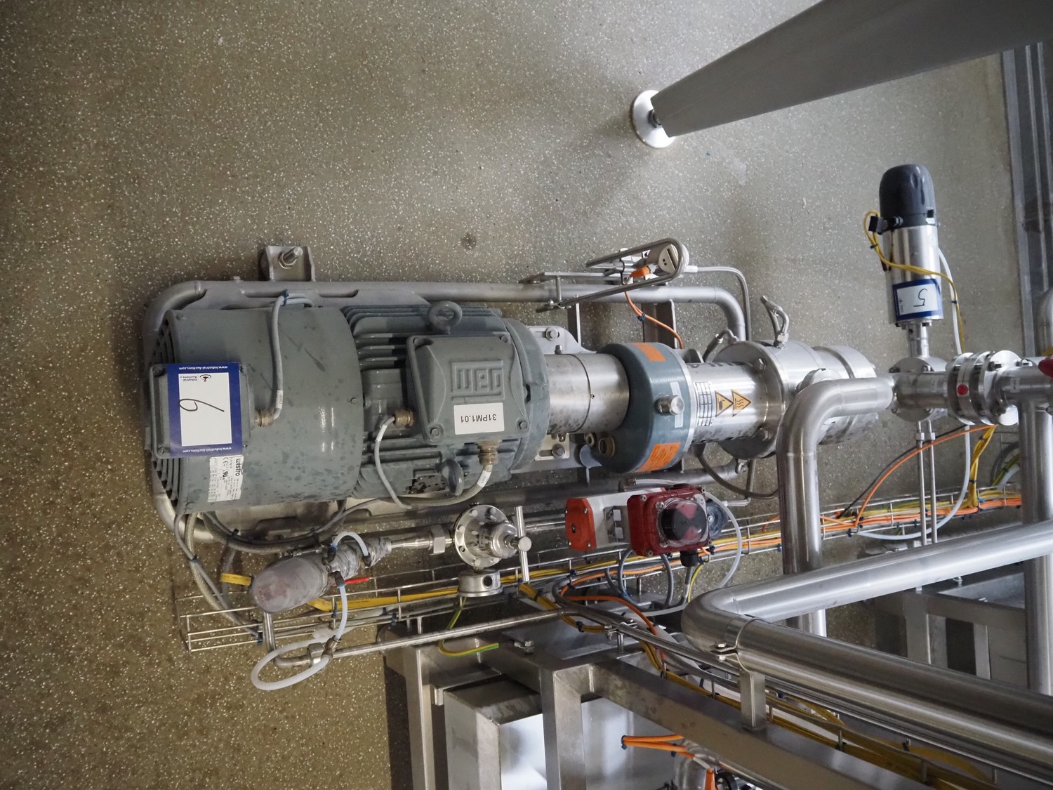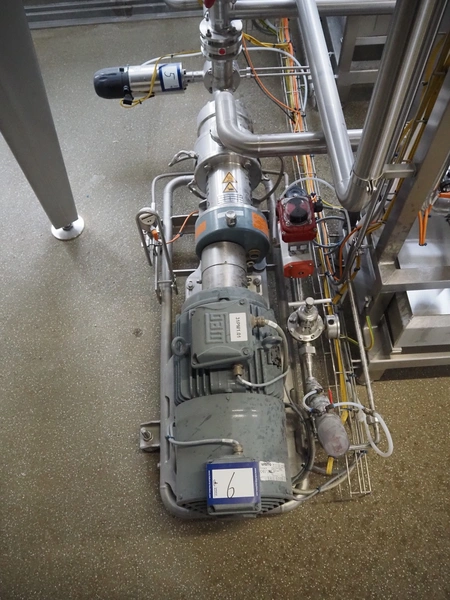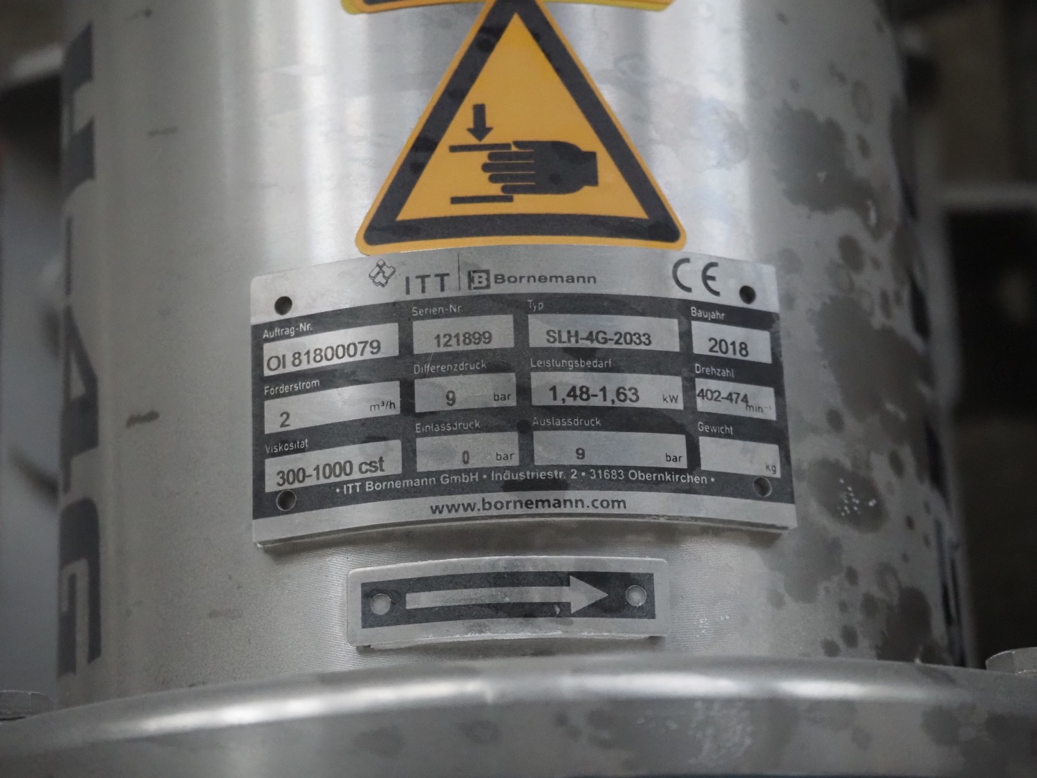 Bornemann hygienic twin screw pump, type: SLH-4G-2033, serial number: 121899, year of construction: 2018, 1.48-1.63 kW, capacity: 2 m³/h, pressure difference: 9 bar, 402-474 rpm, viscosity: 300-1000 cst, dimensions: 1300 mm x 400 mm x 500 mm.