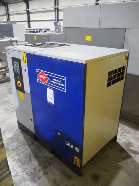 V.R.B. Friesland air compressor, type: APS 30B/10, serial number: CAI980325, year of construction: 2016, 400 V, 3 Ph, 50 Hz, 22 kW, working hours: 29760 hour, weight: 430 kg, dimensions: 1300 mm x 800 mm x 1200 mm.