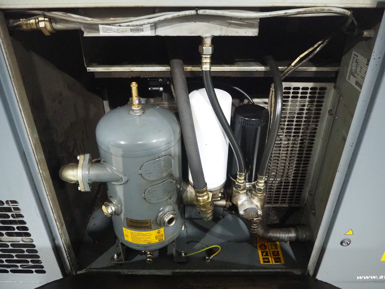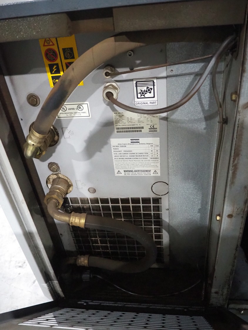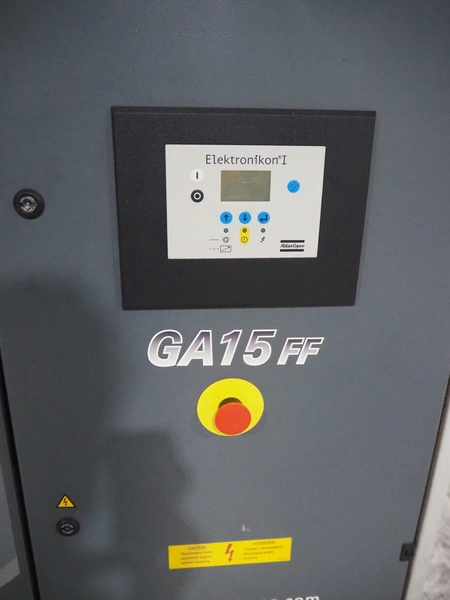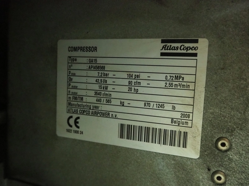 Atlas Copco air compressor, type: GA15, serial number: API456568, year of construction: 2008, 15 kW, 7.2 bar, 3540 rpm, 2.55m³ per minute, working hours: 26540, weight: 440/565 kg, dimensions: 1800 mm x 700 mm x 1550 mm.