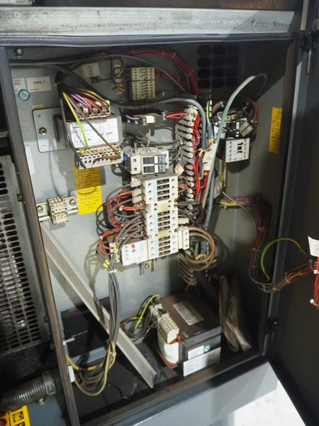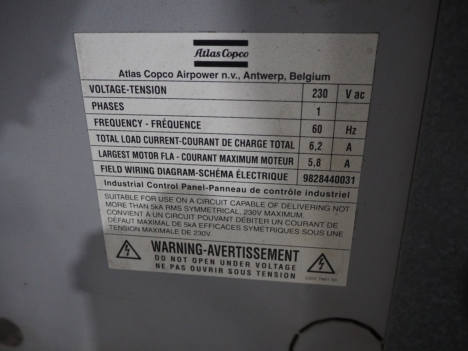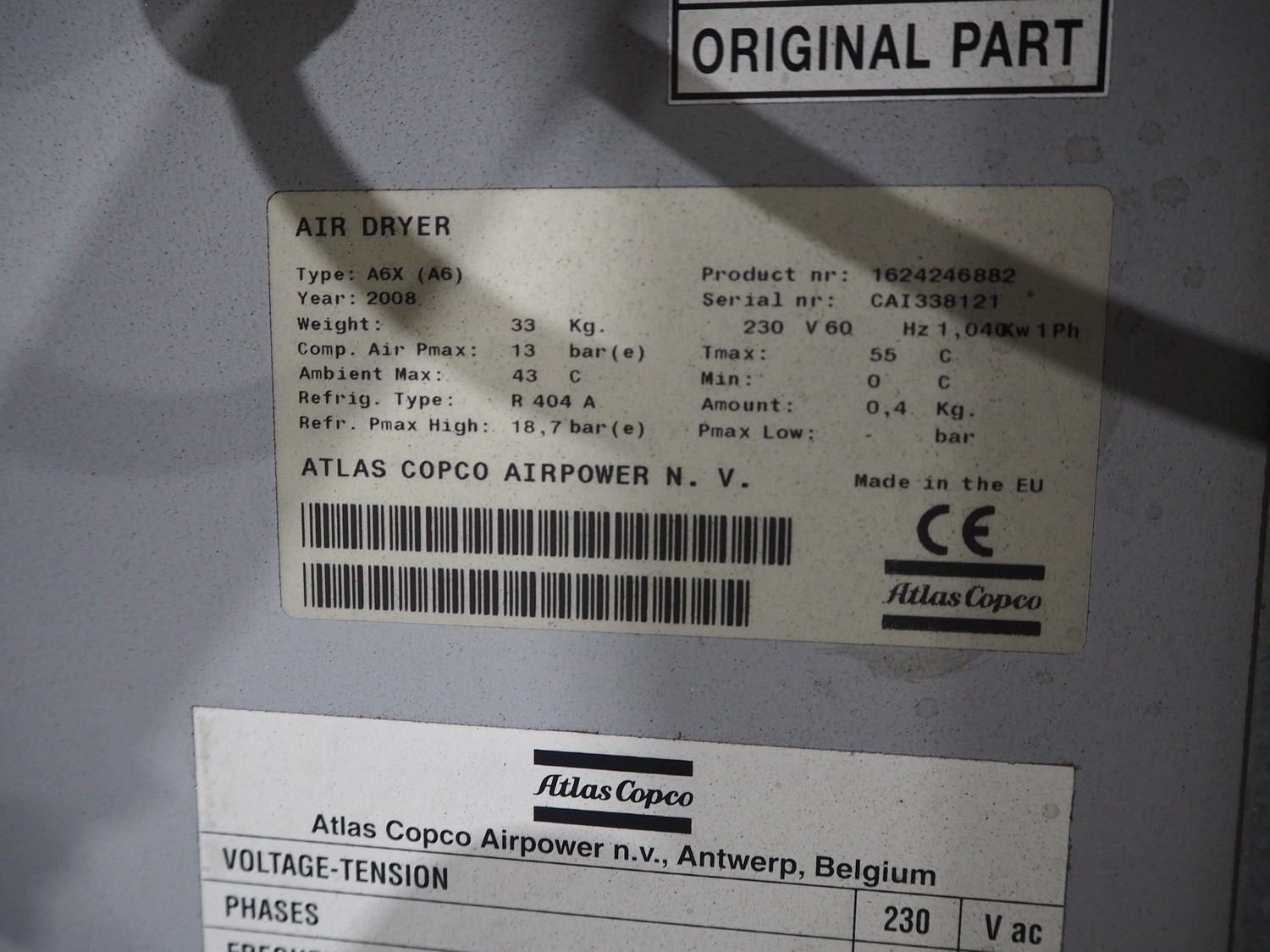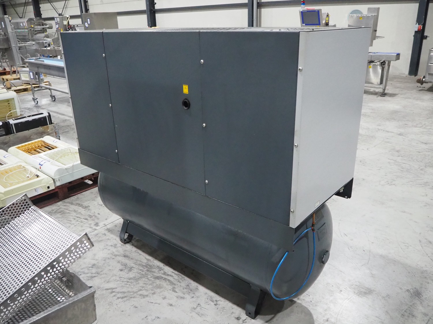 Atlas Copco air compressor, type: GA15, serial number: API456568, year of construction: 2008, 15 kW, 7.2 bar, 3540 rpm, 2.55m³ per minute, working hours: 26540, weight: 440/565 kg, dimensions: 1800 mm x 700 mm x 1550 mm.